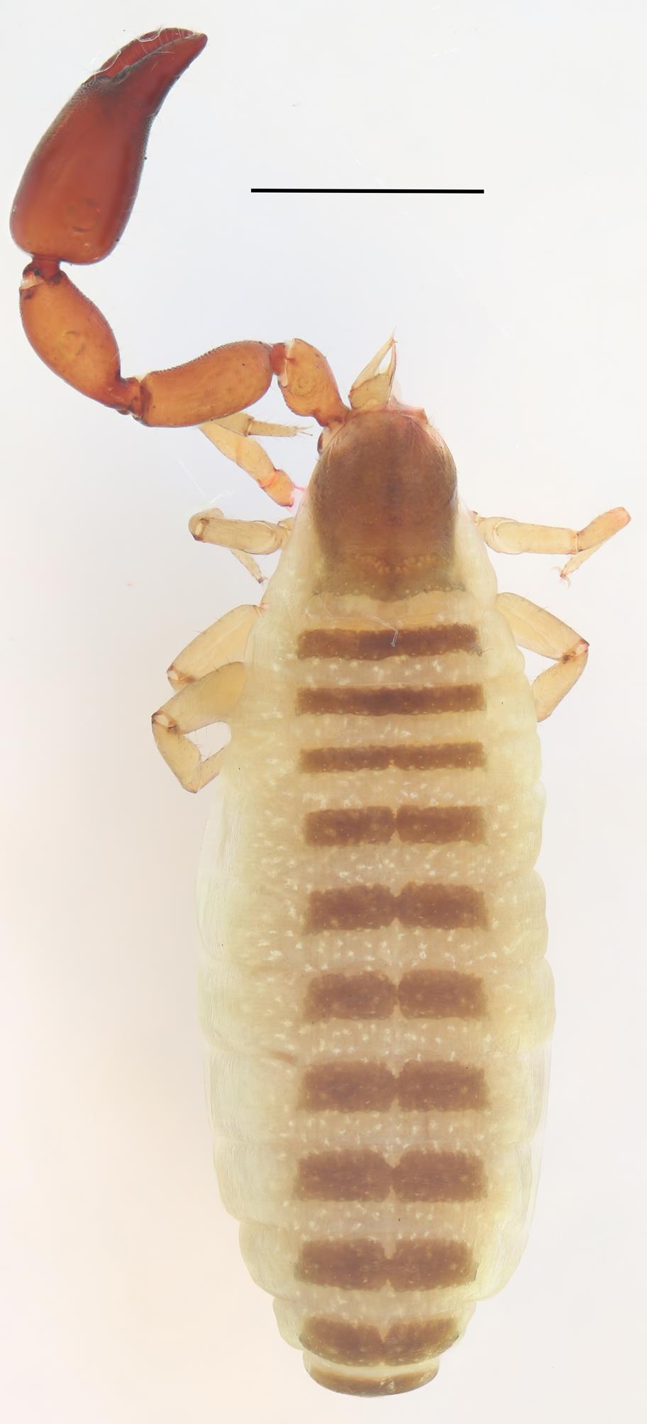 摘要:本研究根据从云南省高黎贡山(保山市段)洞穴采集的伪蝎标本,整理并描述了阿伪蝎科安伪蝎属一新种,即禾木安伪蝎(Anatemnus hemuensis sp. nov.)。该属的主要特征在于触肢粗壮,腿节和膝节多具明显颗粒,不动指上的听毛it位于指的中部,听毛esb到est之间的距离大于isb到ist之间的距离,背板不完全分隔。世界已知22种(不包含本文新种),主要分布于非洲和美洲,中国仅知3种:任氏安伪蝎(A. reni Gao & Zhang, 2016)、宝安伪蝎(A. orites (Thorell, 1889))、潮州安伪蝎(A. chaozhouensis Hu & Zhang, 2012)。该新种背甲的眼部已经完全退化,依据该特征,很容易区分,除分布于澳大利亚的2个物种(A. subvastus Alexander, Burger & Harvey 2014,采集自地下环境;A. cavernicola Berier, 1976,采集自Jump Up Cave),然后依据步足I和步足IV跗节端部具有极其弯曲的刚毛将新种与这两种进行区分。新种触肢转节具有1个明显的背突,1.7倍长于宽(0.47/0.28 mm),腿节2.8倍长于宽(0.90/0.32 mm),膝节2.2倍长于宽(0.82/0.37 mm),螯肢指明显短于具柄的螯掌;前螯螯掌具有4根刚毛,基部2根末端齿状,盔状物具有5个分叉,鞭状毛4根,末端2根齿状;口下突有5根顶端毛和1根亚中毛。在文中提供了新种的整体图以及特征图,另外还提供了中国安伪蝎属的分种检索表,所检视的标本保存于西华师范大学生命科学学院昆虫标本馆。 Abstract:Currently,the research of cave-dwelling pseudoscorpion in Gaoligong Mountain lags behind. This paper aims to clarify its species diversity by collecting the specimens of cave-dwelling pseudoscorpion in this area. The collected specimens were identified by traditional classical characteristics. After systematic investigation and sorting out seven cave specimens belonging to Gaoligong Mountain, two kinds of pseudoscorpion were found. After reviewing relevant references, a new species Anatemnus hemuensis sp. nov. was found. Then the description and drawing of this new species were made in this paper. -