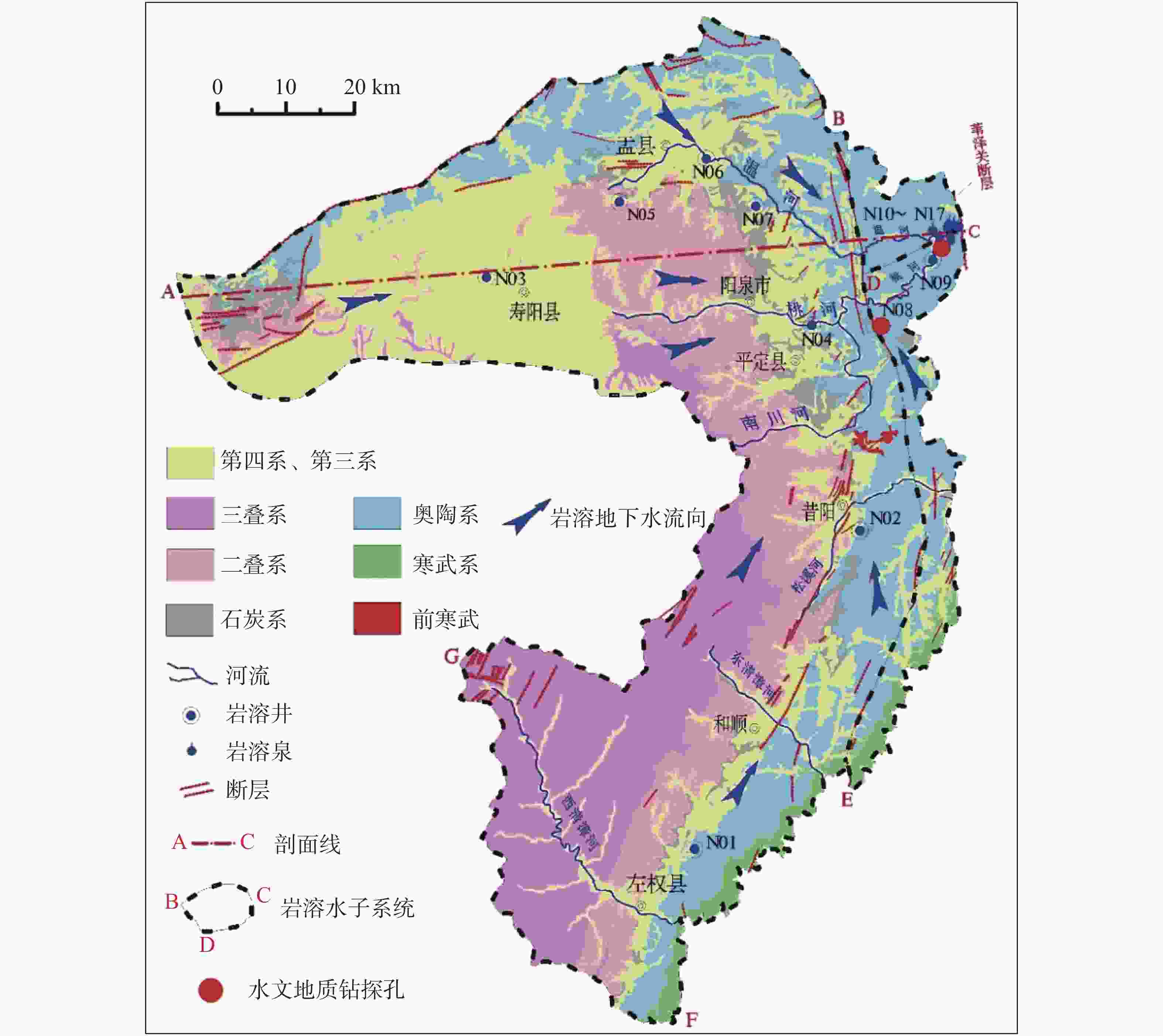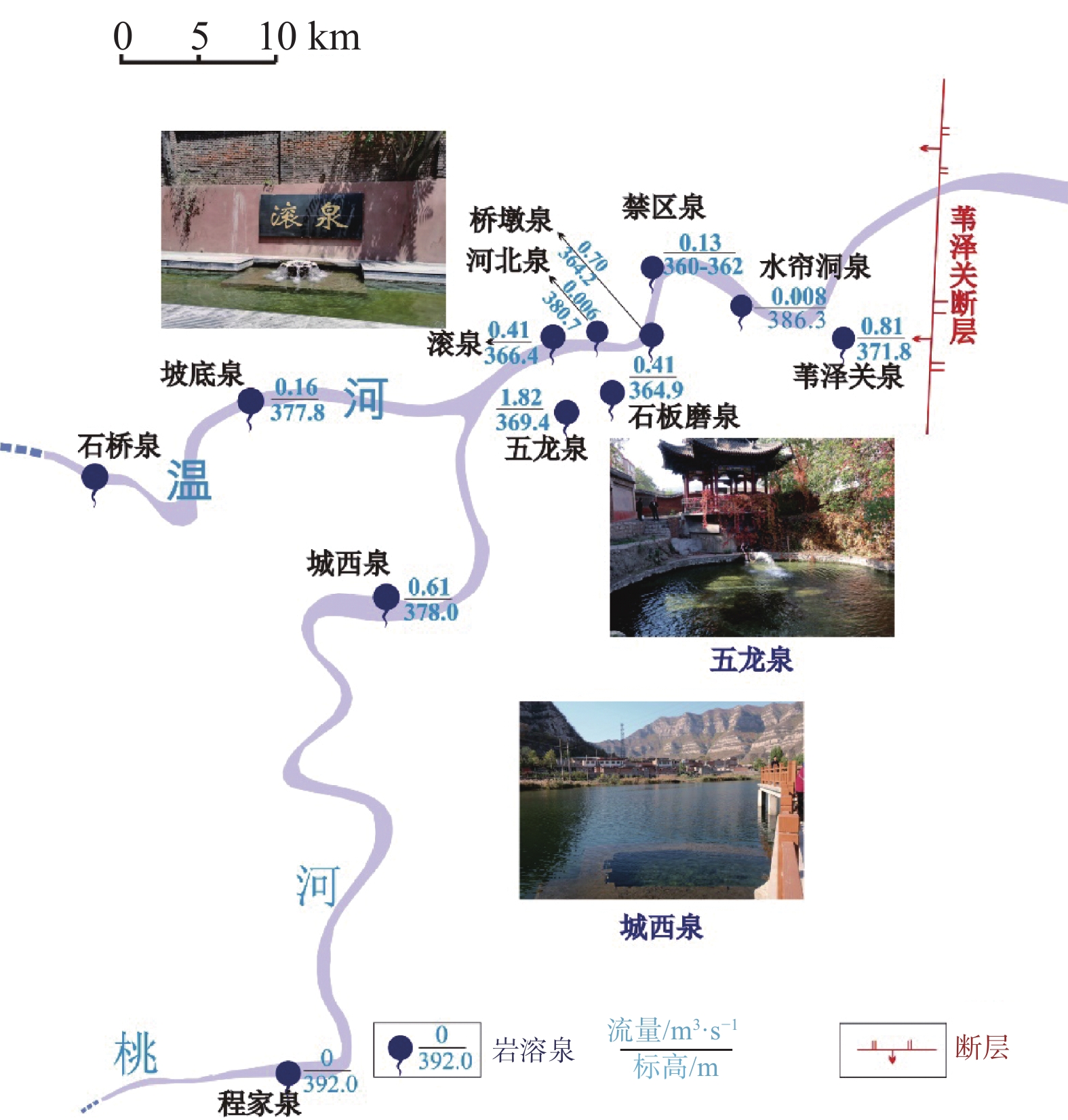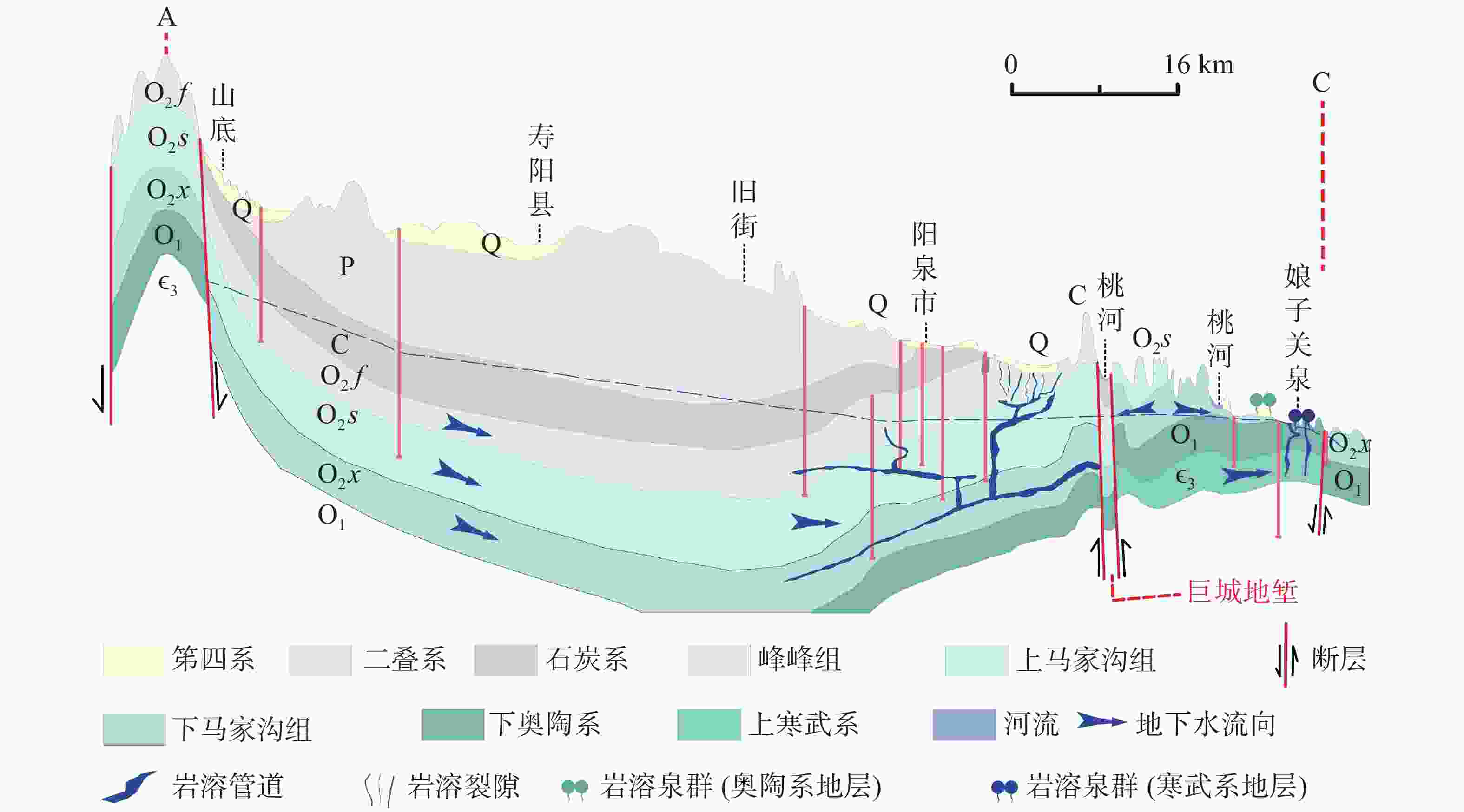 摘要: 娘子关泉域群泉是中国北方最大的岩溶泉,泉域汇水面积达7 436 km2,前人认为:泉域内岩溶水由北、西、南3面向娘子关一带径流汇集,由于娘子关一带下奥陶系燧石团块或条带白云岩相对隔水层隆起,并被桃河侵蚀出露,使岩溶地下水溢出地表成泉群,其主要含水层为中奥陶系含石膏碳酸盐岩。但各泉的水化学、同位素特征有差异,娘子关泉群并不是出自统一源。文章通过水化学、同位素、水文地质剖面等方法研究得出: 娘子关泉域存在两个含水层、三个子系统:中奥陶系灰岩含水层和中上寒武系白云岩含水层;西部奥陶系岩溶水系统、东部奥陶系岩溶水系统和东部中上寒武系岩溶水系统。泉域内城西泉与程家泉出露于中奥陶系下马家沟组泥灰岩之上,含水层为中奥陶系灰岩裂隙、溶隙水,由于区域下马家沟组泥灰岩隆起隔水出露地表成泉,属于东部奥陶系岩溶水系统;坡底泉、五龙泉、河北泉、水帘洞泉、苇泽关泉其补给主要来源于中上寒武系含水岩组,为承压上升泉,属于东部中上寒武系岩溶水系统。Abstract: As a main natural discharge point of karst groundwater, Niangziguan spring group consists of 11 springs and is located in Niangziguan town, Yangquan City, Shanxi Province. It is distributed on the floodplain and terrace of the Taohe river, the Wenhe river and the Mianhe river, with an exposed elevation of 360 m to 392 m. Among these springs, Chengjia spring is the highest and Jinqu spring is the lowest. The annual average flow of spring group is 9.48 m3·s−1 and the flow differences of springs are large, among which the difference of Wulong spring is the largest. Niangziguan spring group is the largest karst spring in northern China, with a catchment area of 7,436 km2. Previous studies believe that karst water in the spring area flows from north, west and south to Niangziguan area, and the chert mass or strip dolomite of lower Ordovicianin Niangziguan area relatively rises to the aquifuge, and is eroded and exposed by the Taohe River, which makes the karst groundwater overflow to the surface and form a spring group. The main aquifer is made up of gypsum-bearing carbonate rock of middle Ordovician. However, because Niangziguan springs are not from the same source, their hydrochemistry and isotope are different. Therefore, it is necessary to study the source of Niangziguan spring group. This study is conducted with the methods of hydrochemistry, isotope and hydrogeological section, and is concluded that there are two aquifers and three subsystems in Niangziguan spring area. The aquifer consists of middle Ordovician limestone aquifer and middle upper Cambrian dolomite one. Subsystem distribution is comprised of Ordovician karst water system in the west, and Ordovician karst water system and middle upper Cambrian karst water system both in the East. Chengxi spring and Chengjia spring are exposed on the marl of lower Majiagou formation of middle Ordovician, and their aquifers consist of fissure and fissure water of Middle Ordovician limestone. Because the marl of lower Majiagou formation is uplifted in this region, the surface spring-the eastern Ordovician karst water system-is formed. Mainly supplied by the water-bearing formation of middle upper Cambrian, Podi spring, Wulong spring, Shibanmo spring, Shuiliandong spring and Weizeguan spring are pressure-bearing ascending springs and belong to the middle upper Cambrian karst water system in the east.