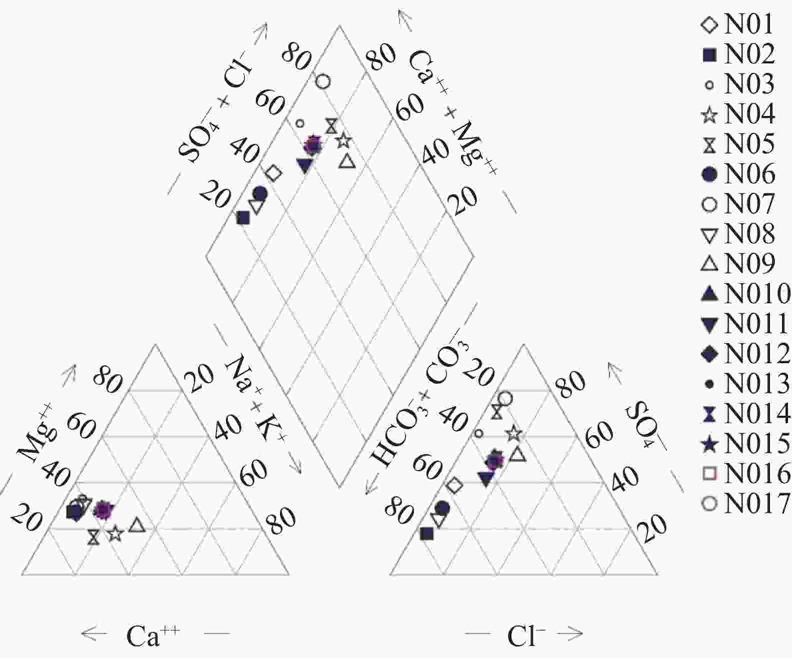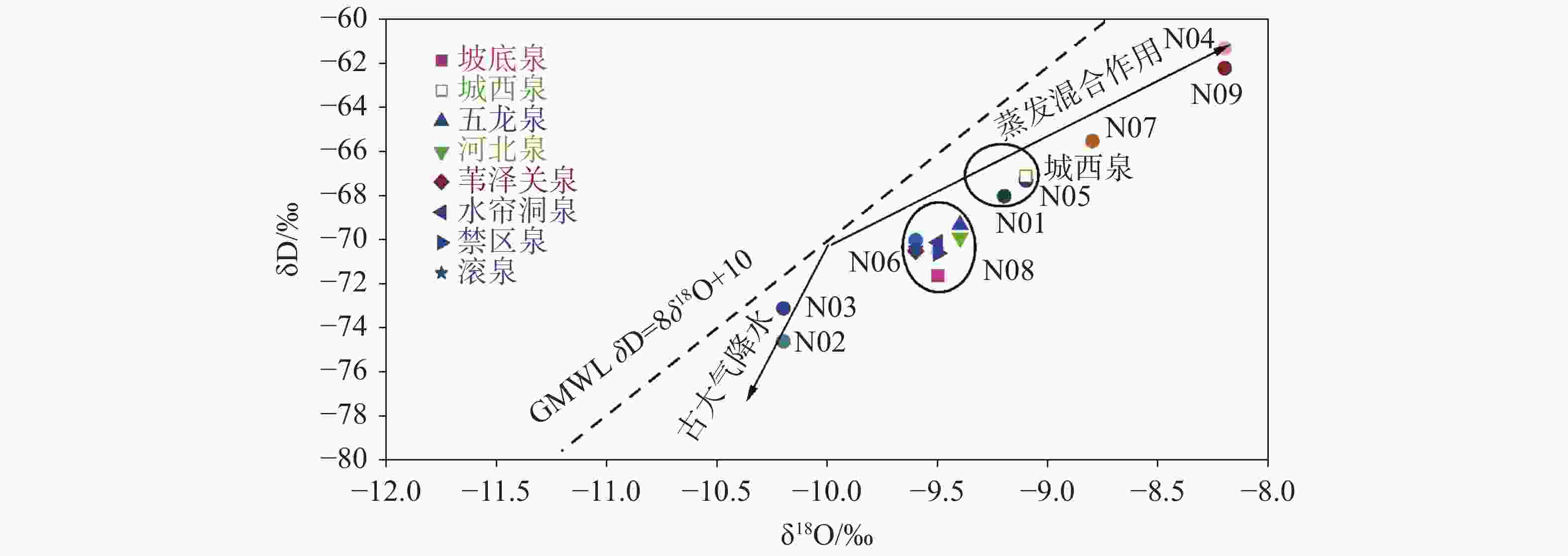 地岩溶井7.55 75.8 18.9 1.2 6.6 9.0 44.9 262.0 0.38 −74.6 −10.2 7.2 HCO3-Ca·Mg N03 寿阳岩溶井 7.21 123.7 40.9 1.5 14.1 8.2 284.4 240.6 2.96 −73.1 −10.2 23.1 HCO3·SO4-Ca·Mg N04 小河村斜井岩溶井 7.24 235.0 45.7 4.9 124.2 111.1 596.0 320.2 1.17 −61.3 −8.2 4.7 HCO3-Ca·Mg N05 盂县岩溶井 7.36 291.6 44.4 1.6 95.0 34.9 744.7 359.0 1.26 −67.3 −9.1 18.1 HCO3·SO4-Ca N06 温池水源地岩溶井 7.60 90.6 22.6 0.9 9.6 12.2 90.4 277.5 0.63 −70.0 −9.6 8.5 HCO3·SO4-Ca·Mg N07 河底镇岩溶井 7.08 312.5 85.2 2.0 31.0 40.2 816.5 293.0 1.89 −65.5 −8.8 12.8 SO4-Ca·Mg N08 神子山岩溶井 7.56 82.3 25.0 1.3 11.7 12.3 68.8 262.9 0.54 −70.5 −9.5 3.7 HCO3-Ca·Mg N09 程家泉岩溶井 7.28 165.5 45.1 6.5 128.9 125.7 405.8 291.1 0.79 −62.2 −8.2 5.3 HCO3·SO4-Ca·Na N10 坡底泉 7.35 135.2 41.8 2.1 42.9 55.7 271.8 263.9 2.14 −71.6 −9.5 15.5 HCO3·SO4-Ca·Mg N11 城西泉 7.40 112.1 34.8 2.1 39.5 48.0 185.6 260.0 1.59 −67.1 −9.1 9.2 HCO3·SO4-Ca·Mg N12 五龙泉 7.36 131.4 39.7 2.1 42.1 55.7 251.7 263.9 1.97 −69.3 −9.4 16.7 HCO3·SO4-Ca·Mg N13 河北泉 7.32 134.1 41.2 2.1 43.1 57.7 262.0 267.8 2.10 −69.9 −9.4 17.4 HCO3·SO4-Ca·Mg N14 苇泽关泉 7.19 134.5 42.2 2.1 44.6 57.8 268.2 265.8 2.09 −70.5 −9.6 17.8 HCO3·SO4-Ca·Mg N15 水帘洞泉 7.31 135.0 42.0 2.1 44.5 57.9 267.3 265.8 2.10 −70.1 −9.5 17.4 HCO3·SO4-Ca·Mg N16 禁区泉 7.47 134.5 42.3 2.1 44.2 58.0 266.6 263.9 2.12 −70.6 −9.5 17.5 HCO3·SO4-Ca·Mg N17 滚泉 7.44 134.2 42.2 2.1 44.0 58.2 269.9 262.0 2.07 −70.4 −9.6 16.7 HCO3·SO4-Ca·Mg -