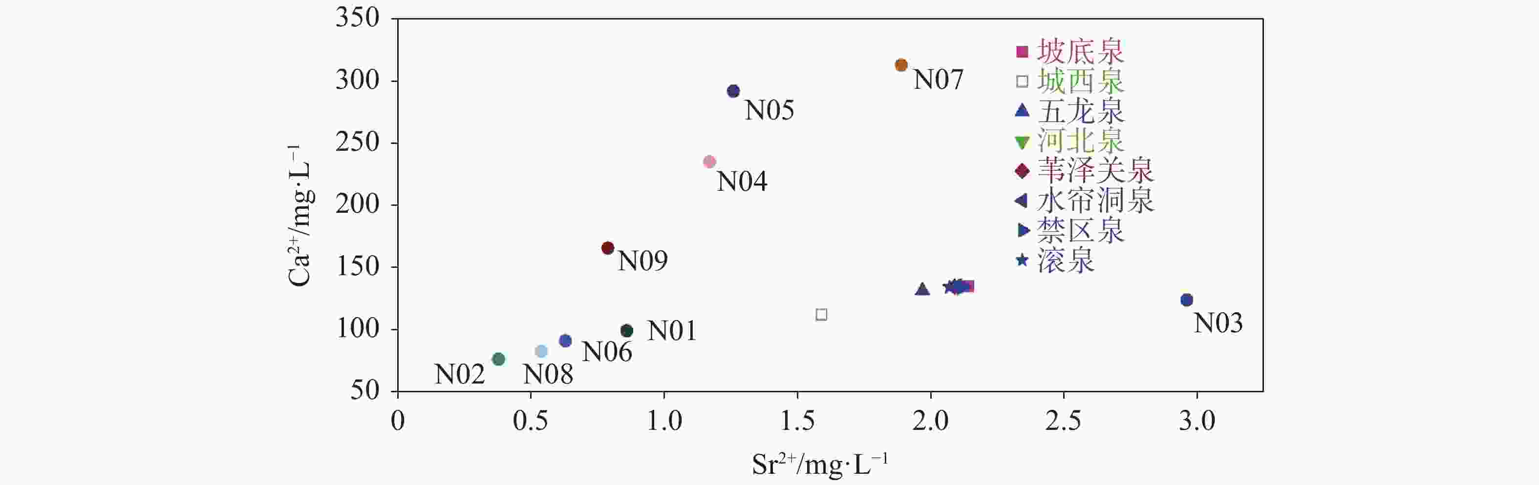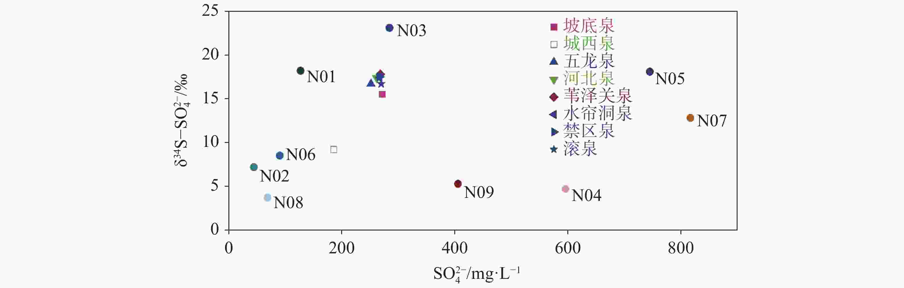 编号 类型 pH Ca2+ Mg2+ K+ Na+ Cl− ${\rm{SO}}_4^{2-} $ $ {\rm{HCO}}_3^{-}$ Sr δD δ18O 34S 水化学类型 /mg·L−1 /mg·L−1 /mg·L−1 /mg·L−1 /mg·L−1 /mg·L−1 /mg·L−1 /mg·L−1 /‰ /‰ /‰ N01 左权石港村 7.70 98.7 24.6 1.5 11.7 11.1 127.2 244.5 0.86 −68.0 −9.2 18.2 HCO3·SO4-Ca·Mg N02 昔阳大寨水源