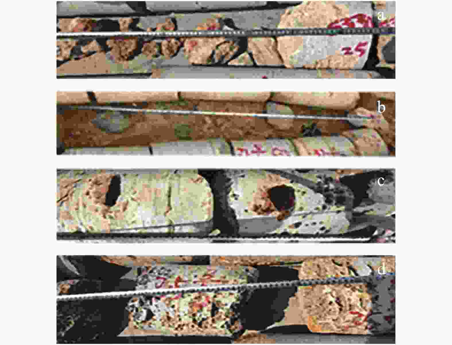 a.小型溶洞(16.0~17.7 m,黏性土充填) b.小型溶洞(21.4~23.8 m,无充填) c.溶孔(26.8~30.7 m) d.溶孔(35.1~35.9 m)