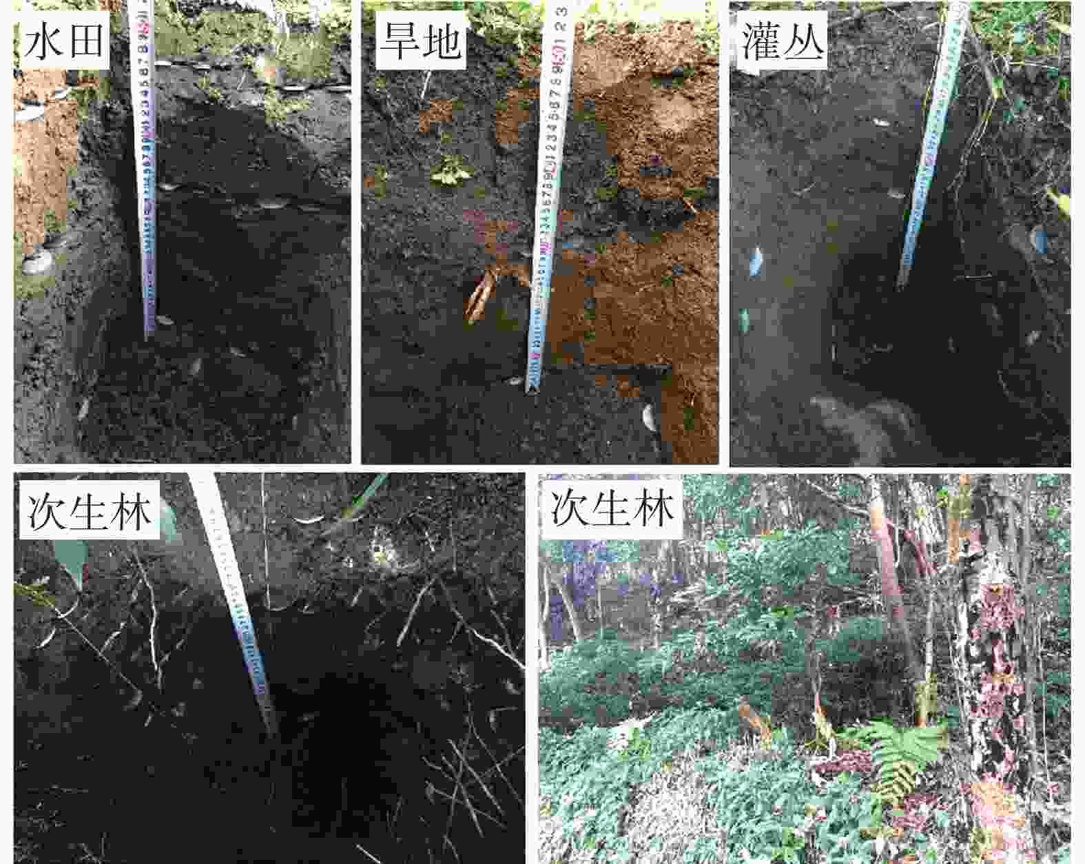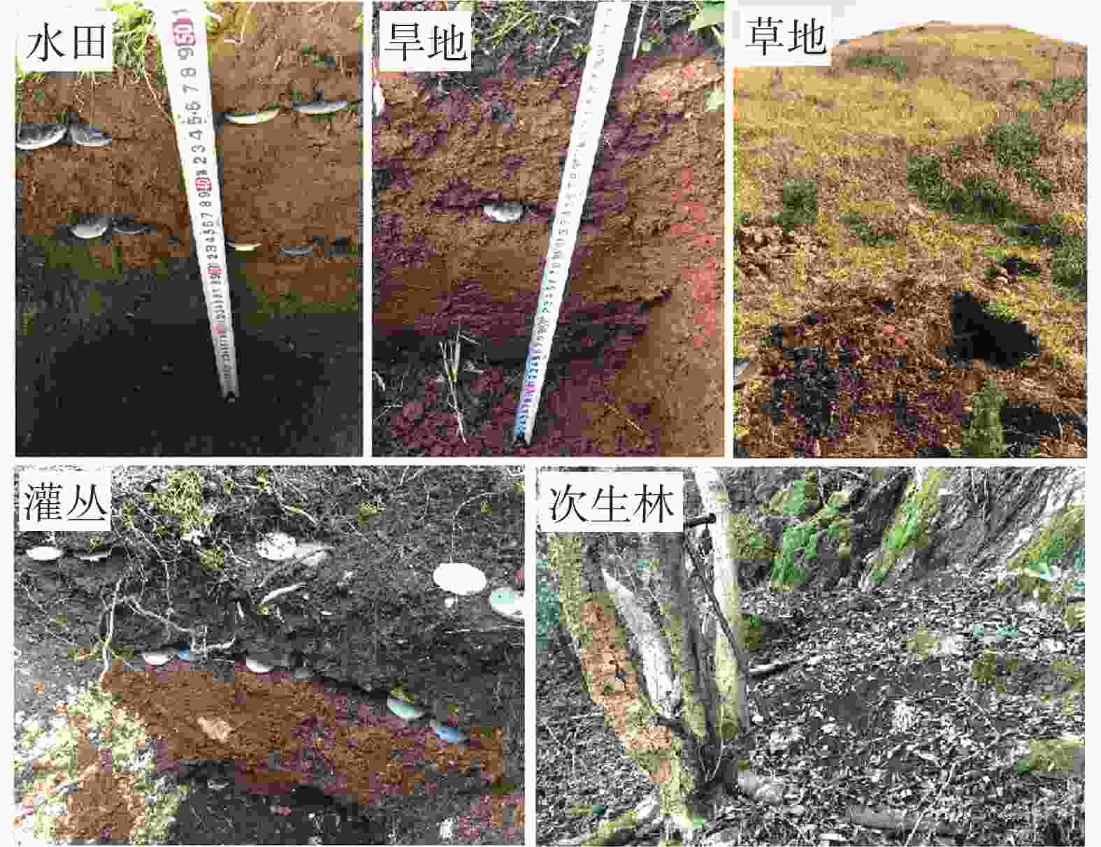 地点 土地利用类型 土壤剖面基本情况 位置及其他 天龙山 次生林 A层为25 cm黑色石灰土,碎石比30%,B层为黄土未见底 半山腰处 灌丛 碎石比4%,草根发达, A层为18 cm黑色石灰土,B层为黄色土壤,不见底 山脚处,土壤疏松度低 水田 A层38 cm黑色石灰土,B层为黄色土,未见底 洼地,南部为峰丛,水稻交替种植,夏季长时间处于淹水状态 旱地 A层为40 cm为黑色石灰土,B层为黄色土未见底 洼地,四周为峰丛,种植玉米及蔬菜,人为干扰较多 讲义村 次生林 A层35 cm,为黑色石灰土,根系发达,B层未见底 山腰处,植被丰富,枯枝落叶多 灌丛 碎石比20%; A层21 cm,黑色石灰土,B层黄色土壤,未见底 山脚处,土壤疏松度低 草地 碎石比50%,A层20~30 cm黑色石灰土,根系发达,B层厚度10~15 cm,以下为基岩 山坡草地上,土壤疏松度低 旱地 A层5~20 cm,为黑色石灰土;B层为黄色土壤,未见底 山下洼地处,种植玉米及蔬菜,人为干扰较多 水田 A层43 cm,为黑色石灰土,以下为黄色土壤 山下洼地处,油菜地、水稻交替种植,夏季长时间处于淹水状态 表 2 不同土地利用下不同深度的试片日均溶蚀速率