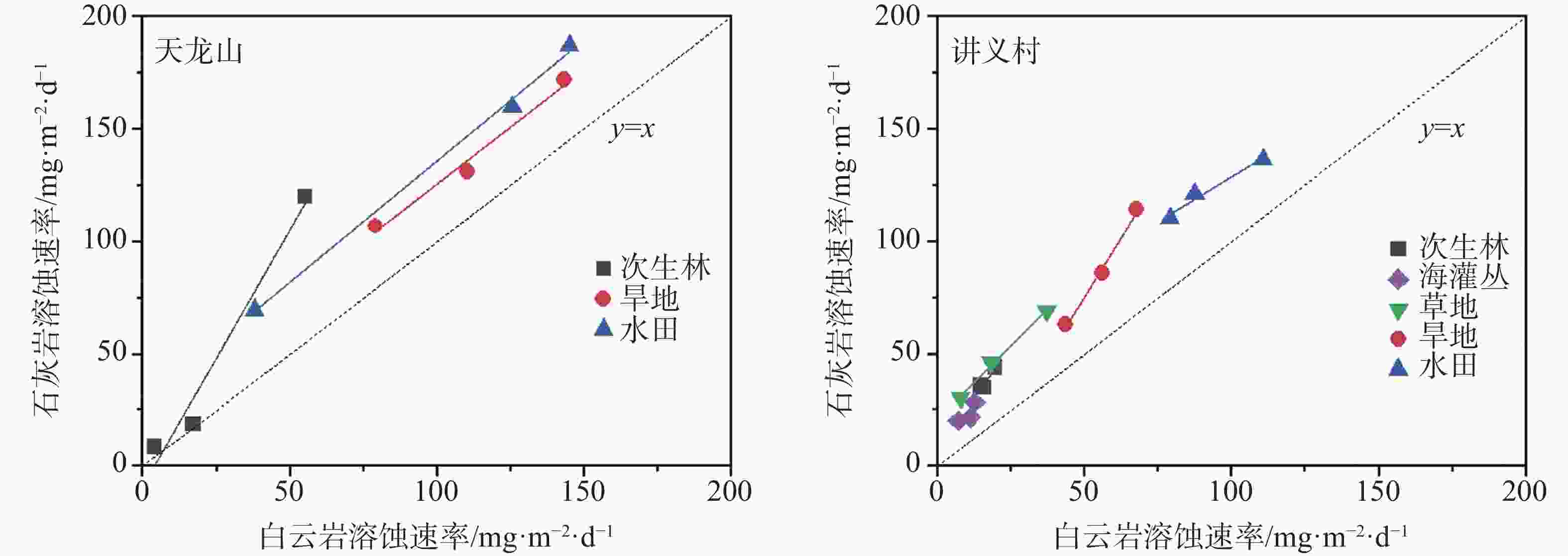 地点 项目 次生林 灌丛 草地 旱地 水田 天龙山 试片溶蚀速率/mg·m−2·d−1 49.19 − − 136.60 138.85 岩溶碳汇强度/tCO2·km−2·a−1 7.47 − − 20.73 21.07 讲义村 试片溶蚀速率/mg·m−2·d−1 16.69 10.33 21.11 55.80 92.29 岩溶碳汇强度/tCO2·km−2·a−1 2.84 1.75 3.40 9.48 15.68 表 5 地下50 cm处不同岩性试片估算的岩溶碳汇强度