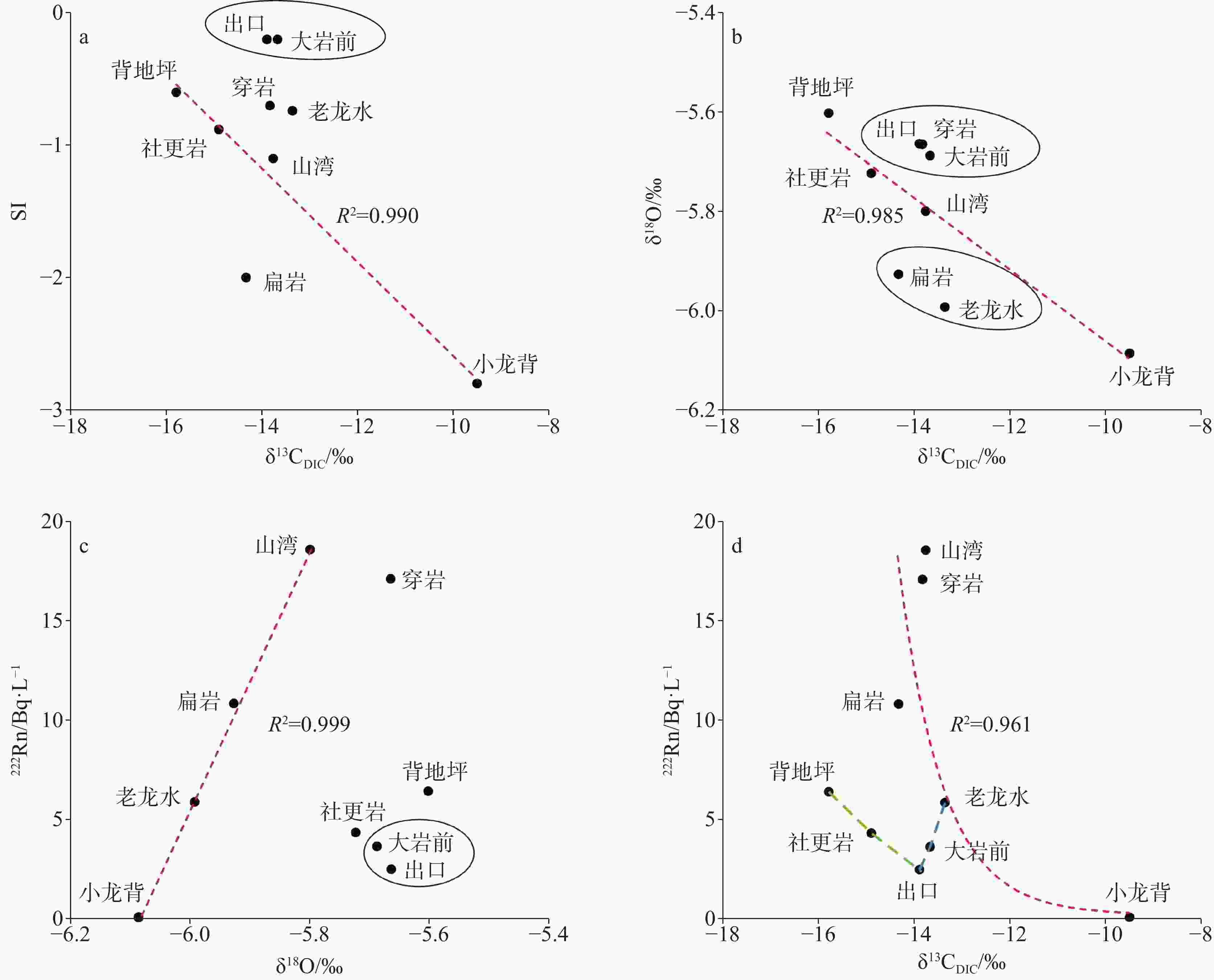 a.δ13CDIC ‒ SI b.δ13CDIC ‒ δ18O c.δ18O ‒ 222Rn d.δ13CDIC222Rn