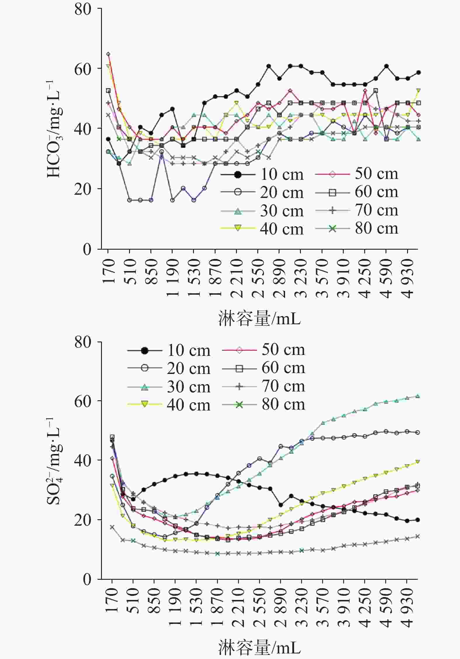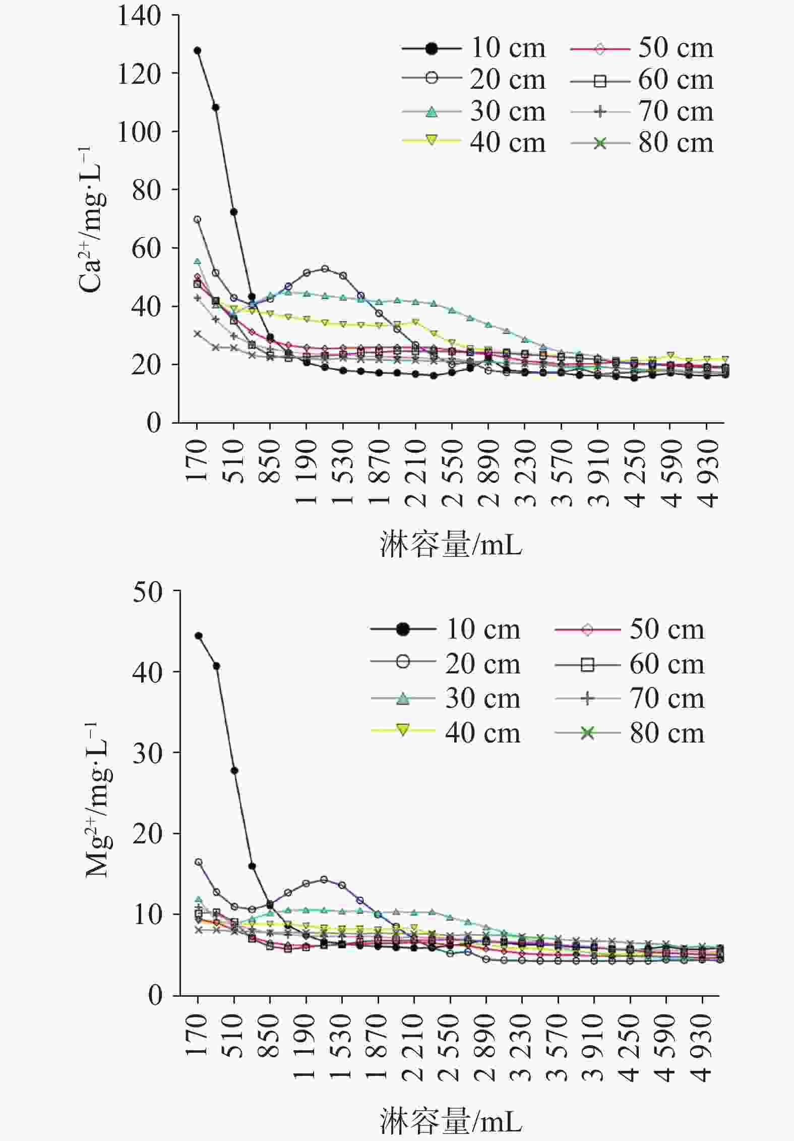 石灰土厚度/cm 10 20 30 40 50 60 70 80 单层水溶性Ca2+/mg 21.48 39.78 28.03 35.61 34.04 12.84 48.12 32.04 累积水溶性Ca2+/mg 21.48 61.26 89.29 124.90 158.94 171.78 219.90 251.94 水溶性Ca2+可参与淋溶量/L 1.07 3.06 4.46 6.24 7.95 8.59 11.00 12.60 单层水溶性Mg2+/mg 13.00 13.23 14.91 20.97 22.59 19.43 24.06 24.05 累积水溶性Mg2+/mg 13.00 26.22 41.13 62.10 84.70 104.13 128.19 152.24 水溶性Mg2+可参与淋溶量/L 2.17 4.37 6.86 10.35 14.12 17.36 21.37 25.37 表 4 不同厚度土壤累积Ca2+、Mg2+含量及淋失比