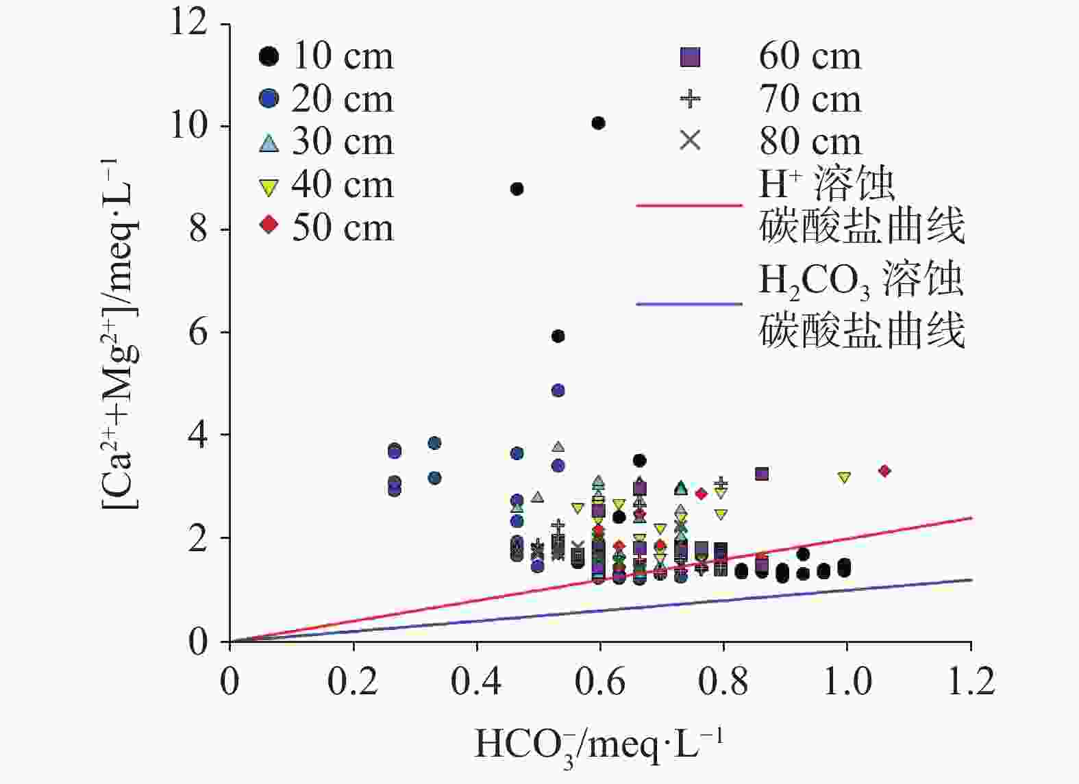 石灰土厚度/cm 10 20 30 40 50 60 70 80 累积土壤水溶性Ca2+/meq 1.07 3.06 4.46 6.24 7.95 8.59 11.00 12.60 累积土壤水溶性Mg2+/meq 1.08 2.19 3.43 5.18 7.06 8.68 10.68 12.69 累积土壤水溶性Ca2++Mg2+/meq 2.16 5.25 7.89 11.42 15.00 17.27 21.68 25.28 淋出液水溶性Ca2++Mg2+/meq 6.95 8.23 8.65 6.81 5.25 5.43 5.47 5.46 水溶性Ca2++Mg2+淋失比/% 321.76 156.76 109.63 59.63 35.00 31.44 25.23 21.60 累积土壤交换性Ca2+/mg 11056 17448 22698 28709 38511 46466 54622 63091 累积土壤交换性Ca2+/meq 553 872 1135 1435 1926 2323 2731 3155 累积土壤交换性Mg2+/mg 2151 3702 4977 6623 8829 11315 13957 16738 累积土壤交换性Mg2+/meq 179 308 415 552 736 943 1163 1395 累积土壤交换性Ca2++Mg2+/meq 732 1180 1550 1987 2662 3266 3894 4550 淋出液交换性Ca2++Mg2+/meq 4.36 2.80 3.44 3.75 3.88 3.74 3.40 3.11 交换性Ca2++Mg2+淋失比/% 0.60 0.24 0.22 0.19 0.15 0.11 0.09 0.07 表 5 不同厚度石灰土可缓冲酸雨(pH=4.5)容量