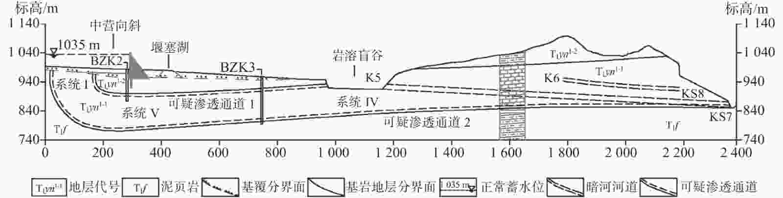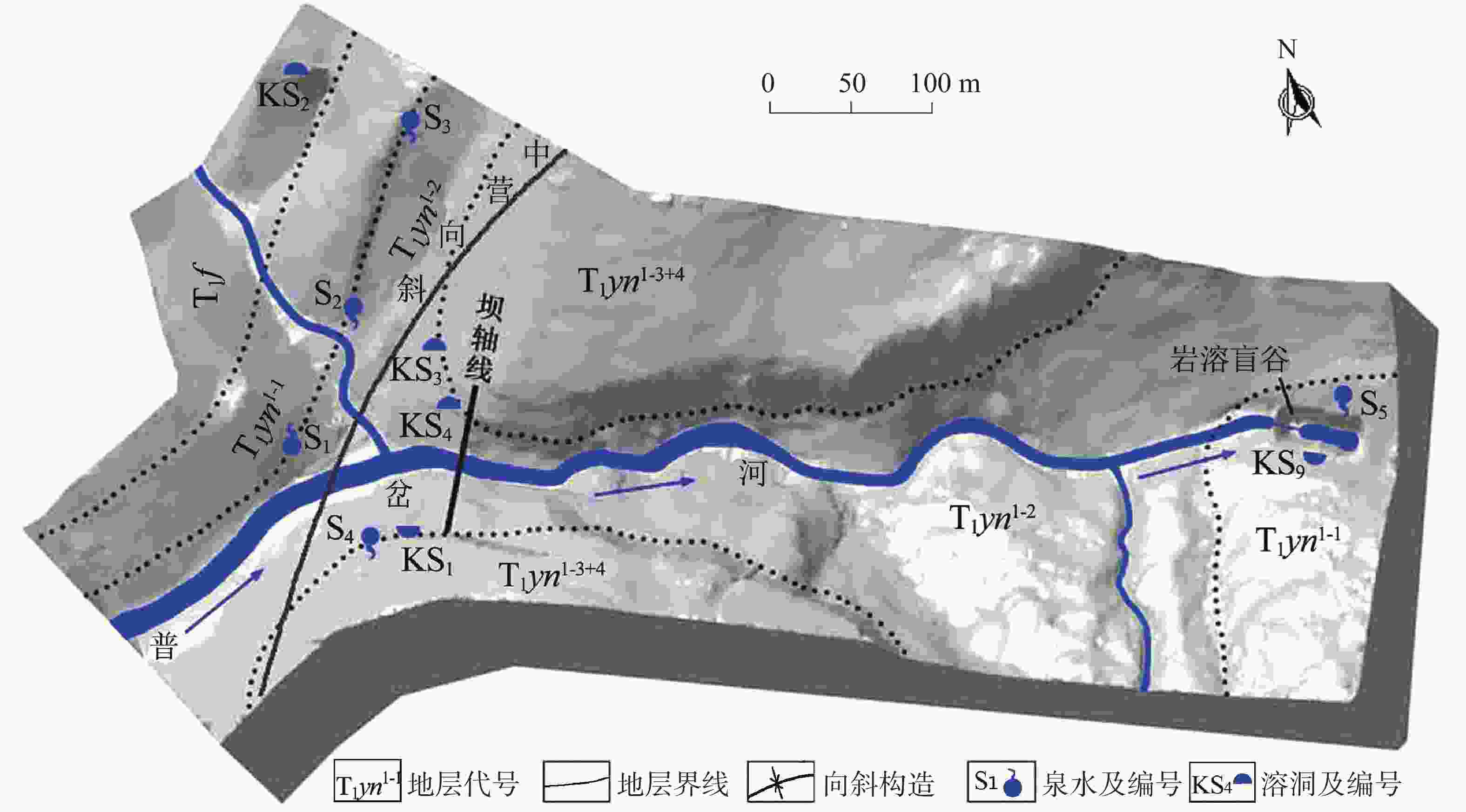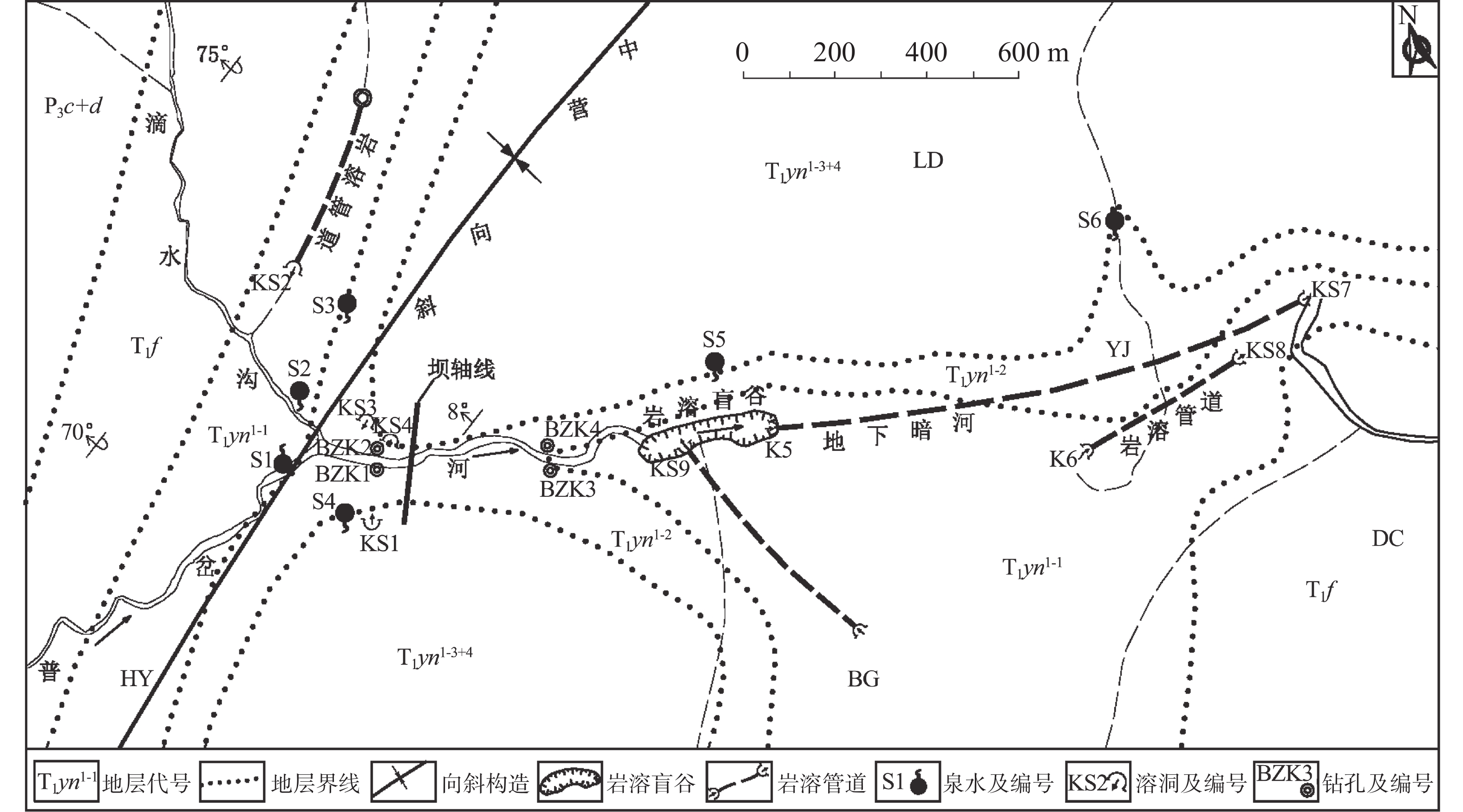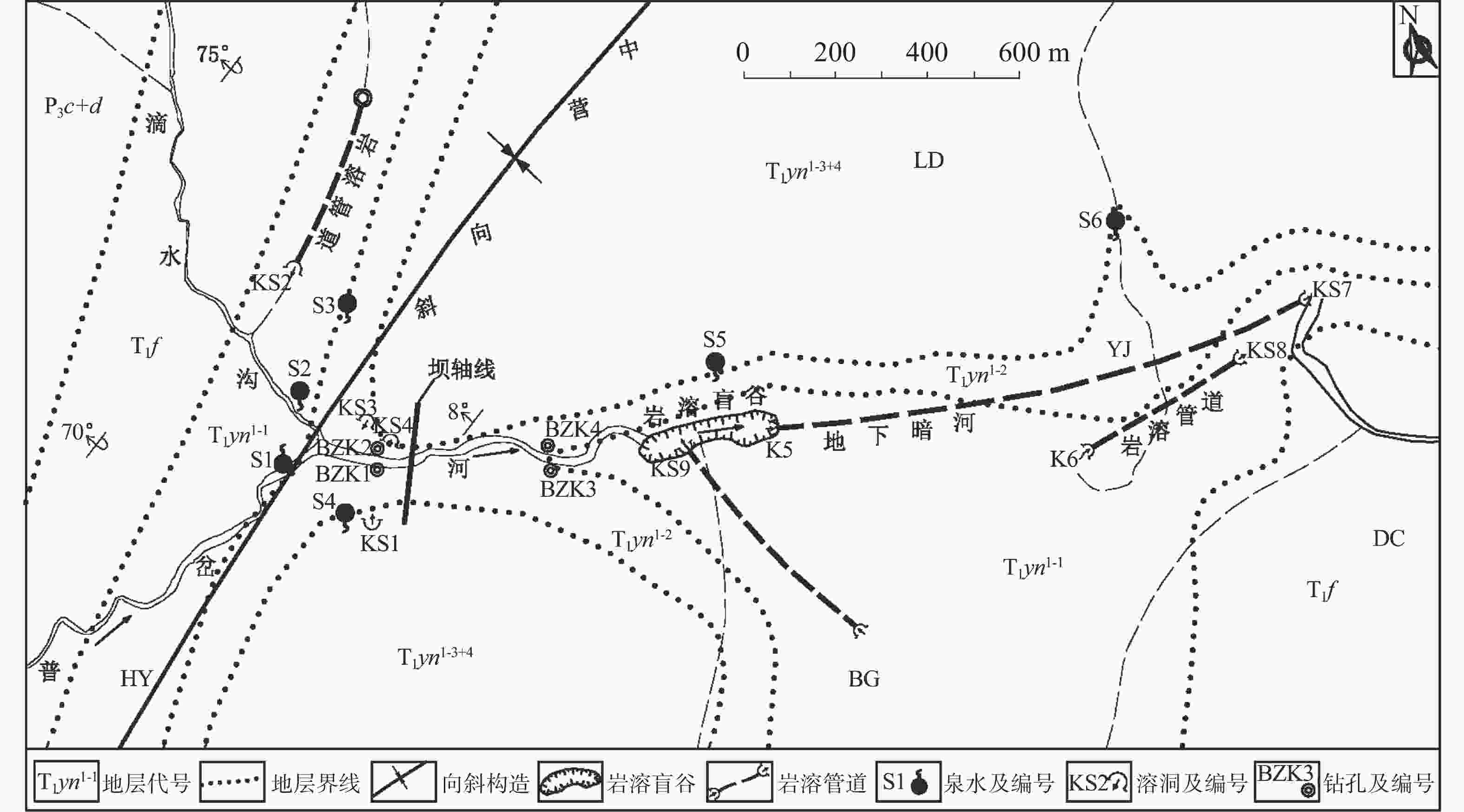 编号 分布位置 出口高程/m 流量/L·s−1 汛期 枯期 极枯 S1 普岔河干支汇合处 990 75 50 17 S2 滴水沟左岸1#冲沟上游 1 017 5 1 0 S3 左岸1号冲沟源头 1 125 2 1 0 S4 坝轴线右岸上游侧 1 019 5 1 0 S5 岩溶盲谷左岸后坡 1 004 15 15 15 KS1 坝轴线右岸 1 130 10 3 0 KS2 滴水沟左岸吊水岩 1 100 50 10 0.5 KS3 坝轴线左岸 1 035 8 3 0 KS4 坝轴线左岸 995 5 2 0 KS7 坝址下游暗河出口 851 300 200 40 KS8 坝址下游岩溶管道出口 900 12 5 1.5 KS9 岩溶盲谷内侧右壁 945 7 2 0 表 2 工程区岩溶水系统区划表
