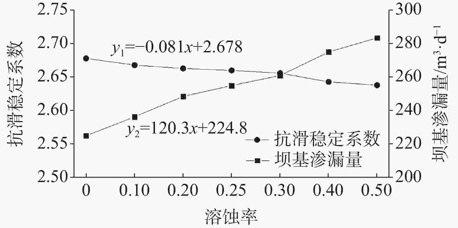 /cm·s−1tgϕ c/Kpa T1yn1-1 岩体 灰岩 2.65 1.00 850 10−4 T1yn1-2 岩体 泥灰岩 2.60 0.80 650 10−5 层面 岩屑夹泥 2.15 0.45 50 10−3 T1f 岩体 泥页岩 2.55 0.65 550 10−6 Qal 冲积 砂卵砾石 2.20 0.45 0 10−2 Ql 湖积 淤泥质粉土 2.15 0.25 10 10−5 Qcol 崩积 块碎石土 2.20 0.55 10 10−1 表 4 溶蚀率模拟计算结果表