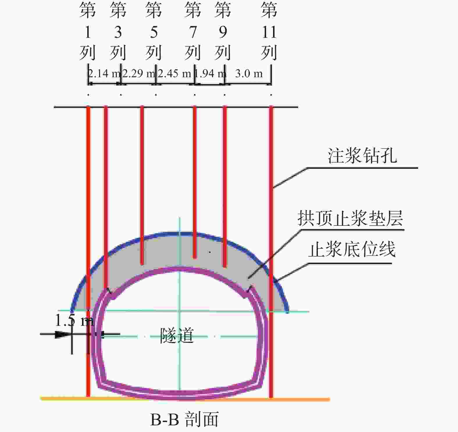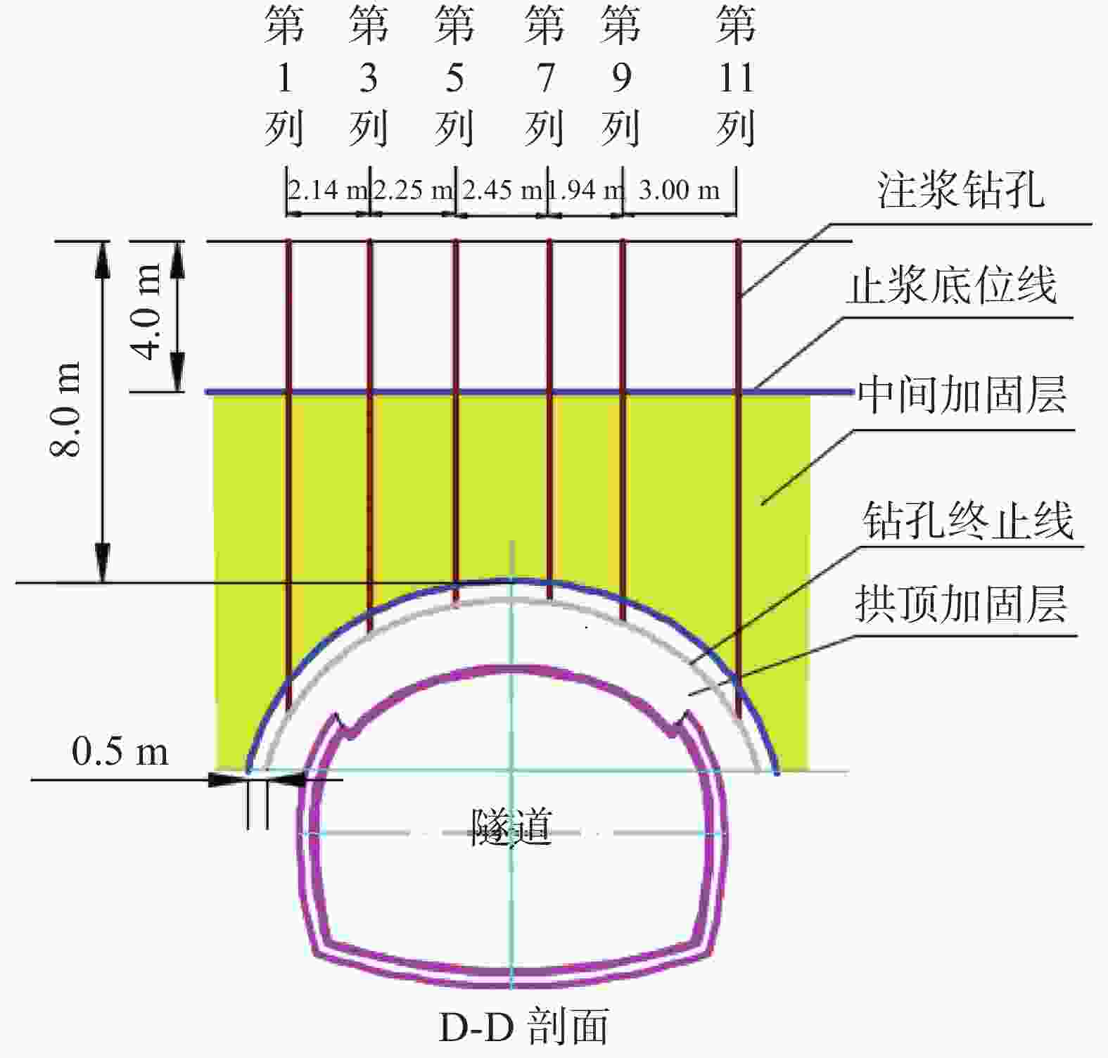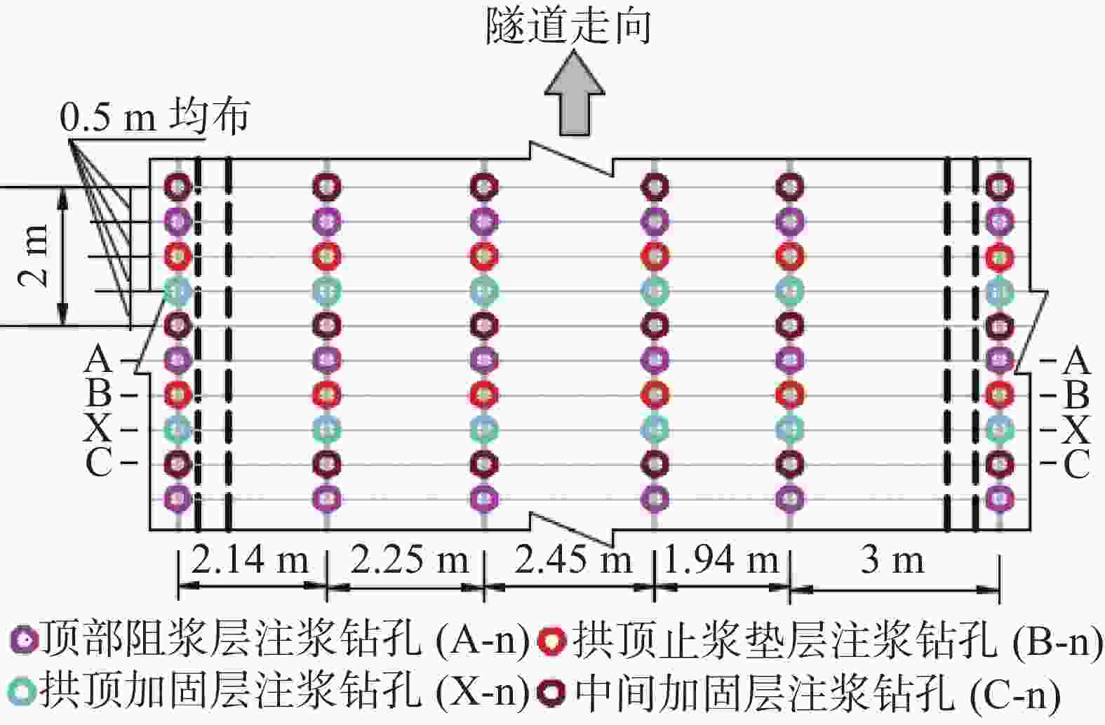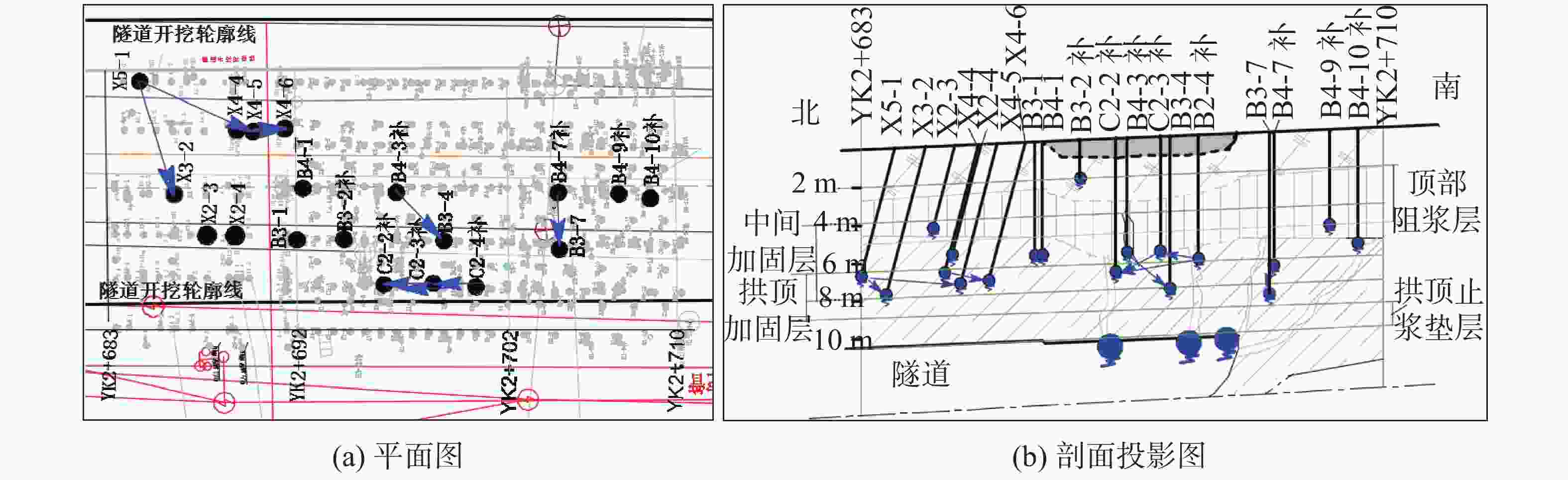 钻孔种类 设计钻孔数/个 优化后钻孔数/个 注浆量/m3 注浆终压范围/MPa 顶部阻浆层(A序)/垂直孔 30 26 91.59 0.3~0.8 拱顶止浆垫层(B序)/垂直孔 30 28 42.72 0.3~0.5 拱顶加固层(C序)/定向斜孔 35 31 96.60 0.5~1.0 中间加固层(D序)/垂直孔 30 24 108.63 1.0~1.5 补强孔/垂直孔 6 6 10.06 0.8~1.0 共计 131 115 349.54 -