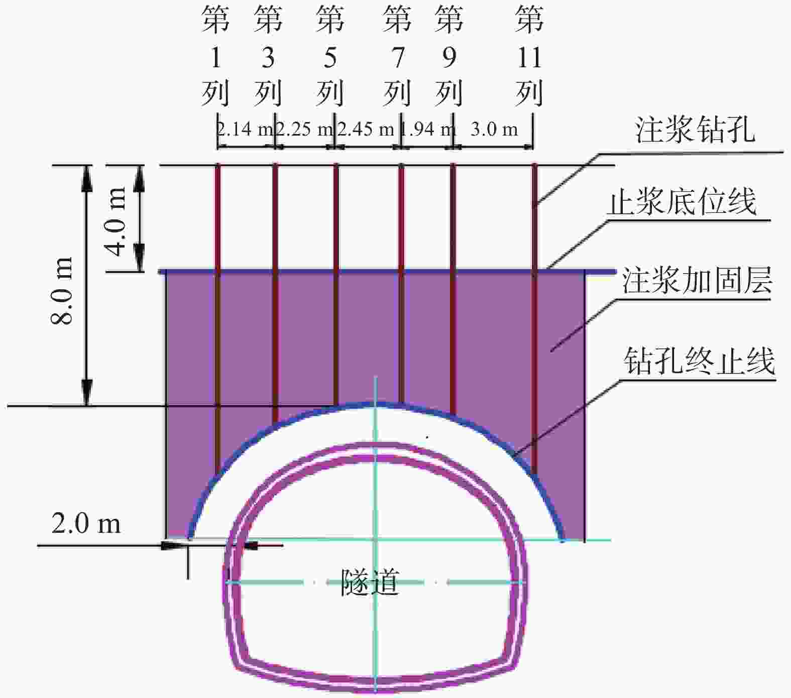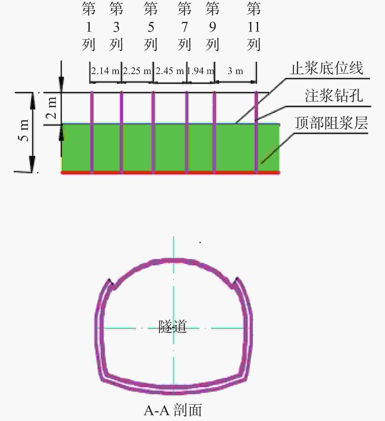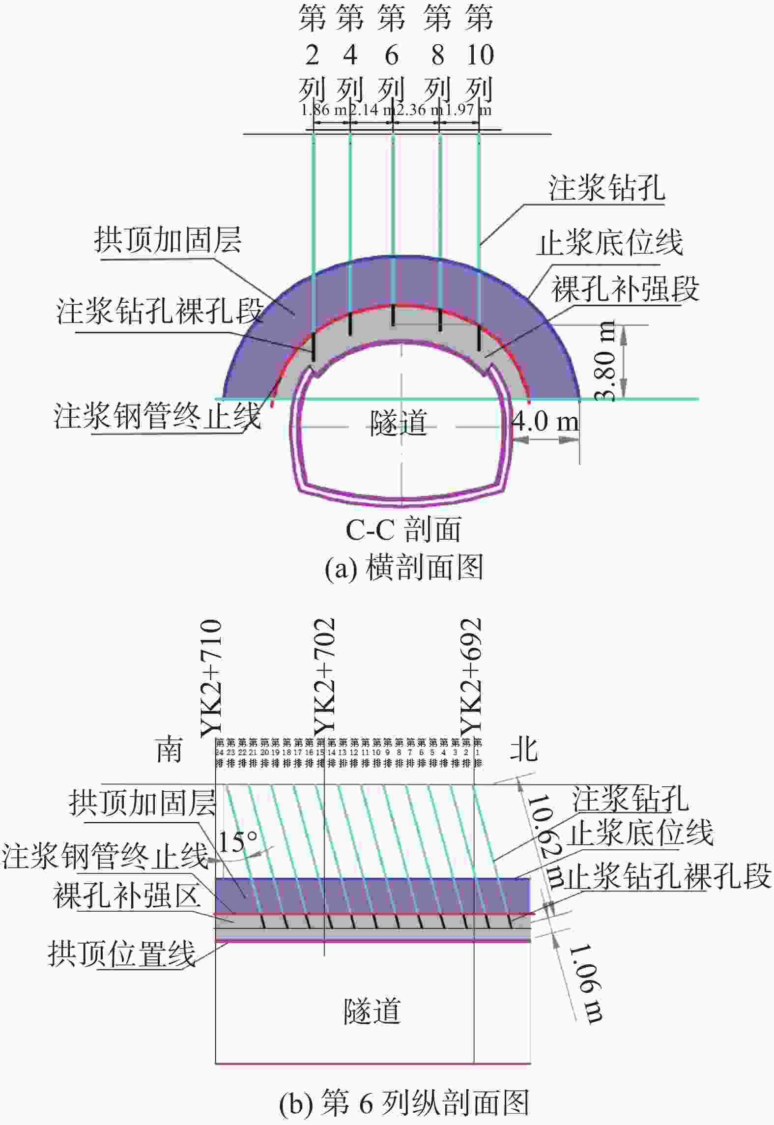 钻孔种类 设计钻孔数/个 优化后钻孔数/个 注浆量/m3 注浆终压范围/MPa 顶部阻浆层(A序)/垂直孔 30 26 91.59 0.3~0.8 拱顶止浆垫层(B序)/垂直孔 30 28 42.72 0.3~0.5 拱顶加固层(C序)/定向斜孔 35 31 96.60 0.5~1.0 中间加固层(D序)/垂直孔 30 24 108.63 1.0~1.5 补强孔/垂直孔 6 6 10.06 0.8~1.0 共计 131 115 349.54 -