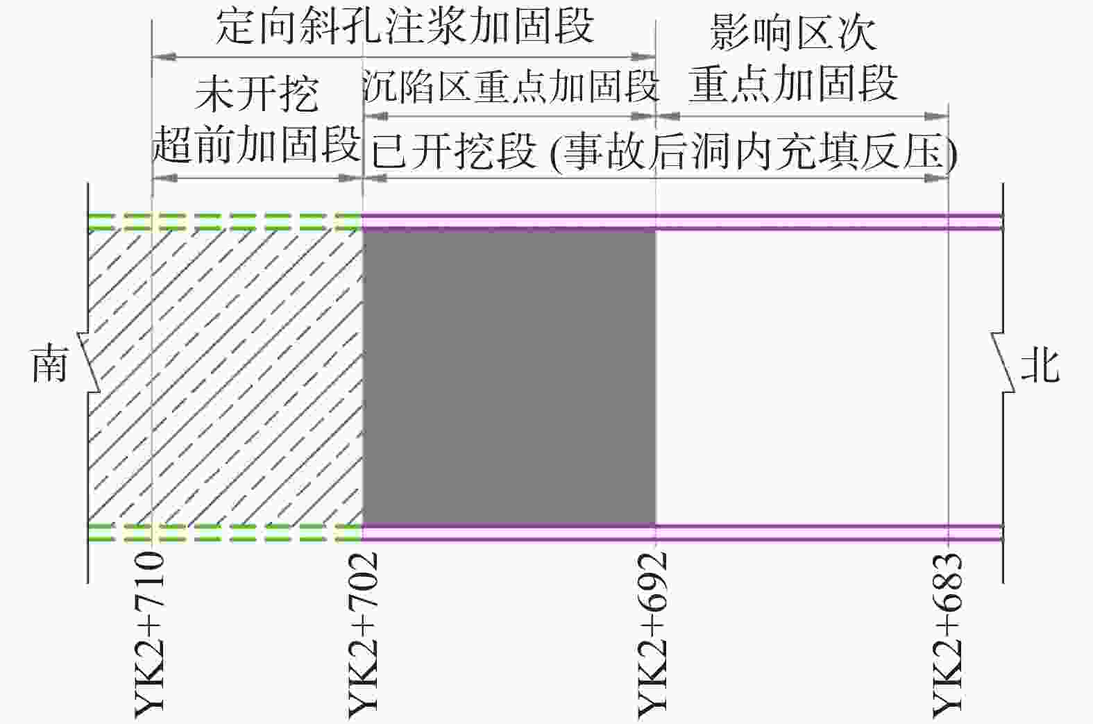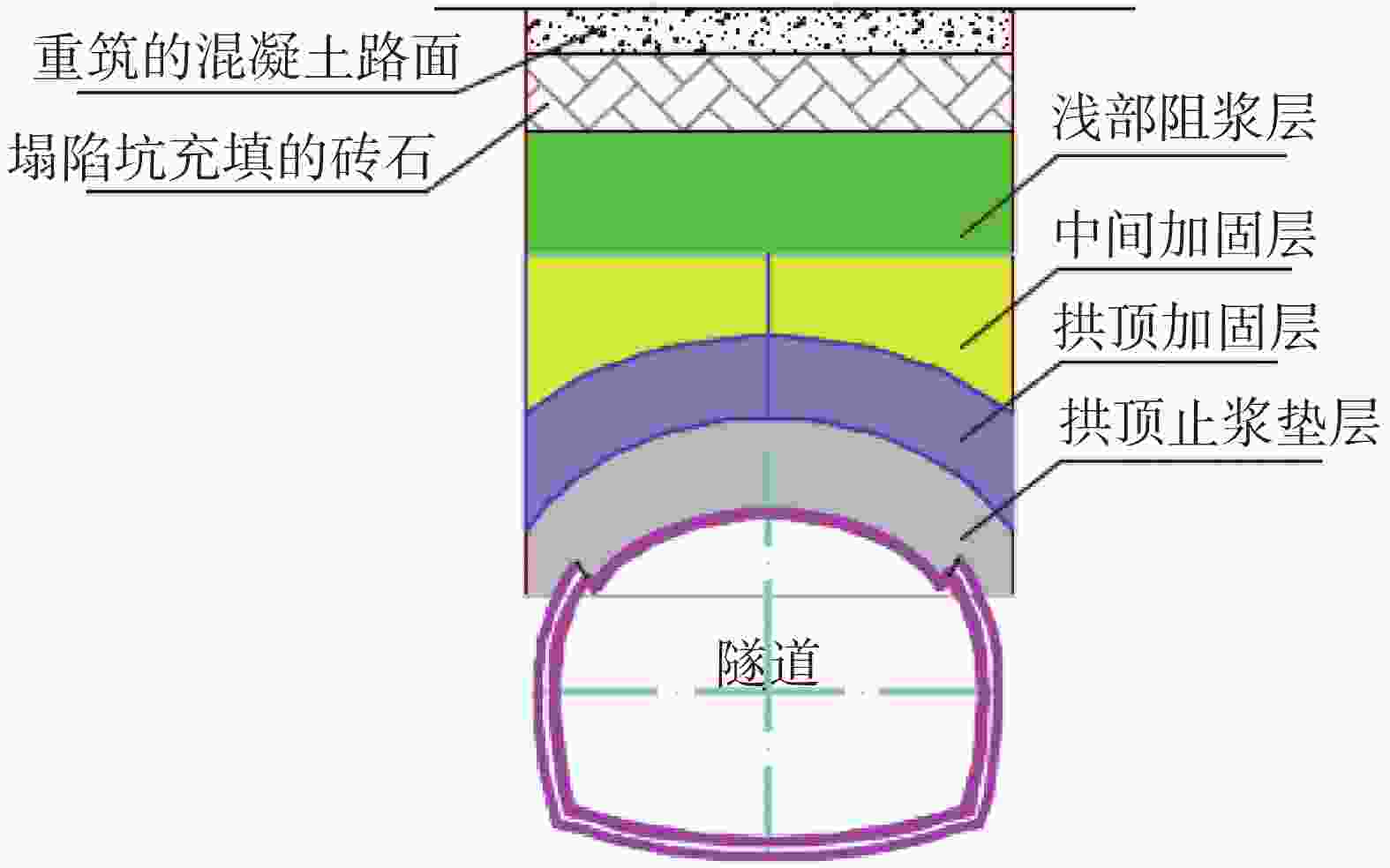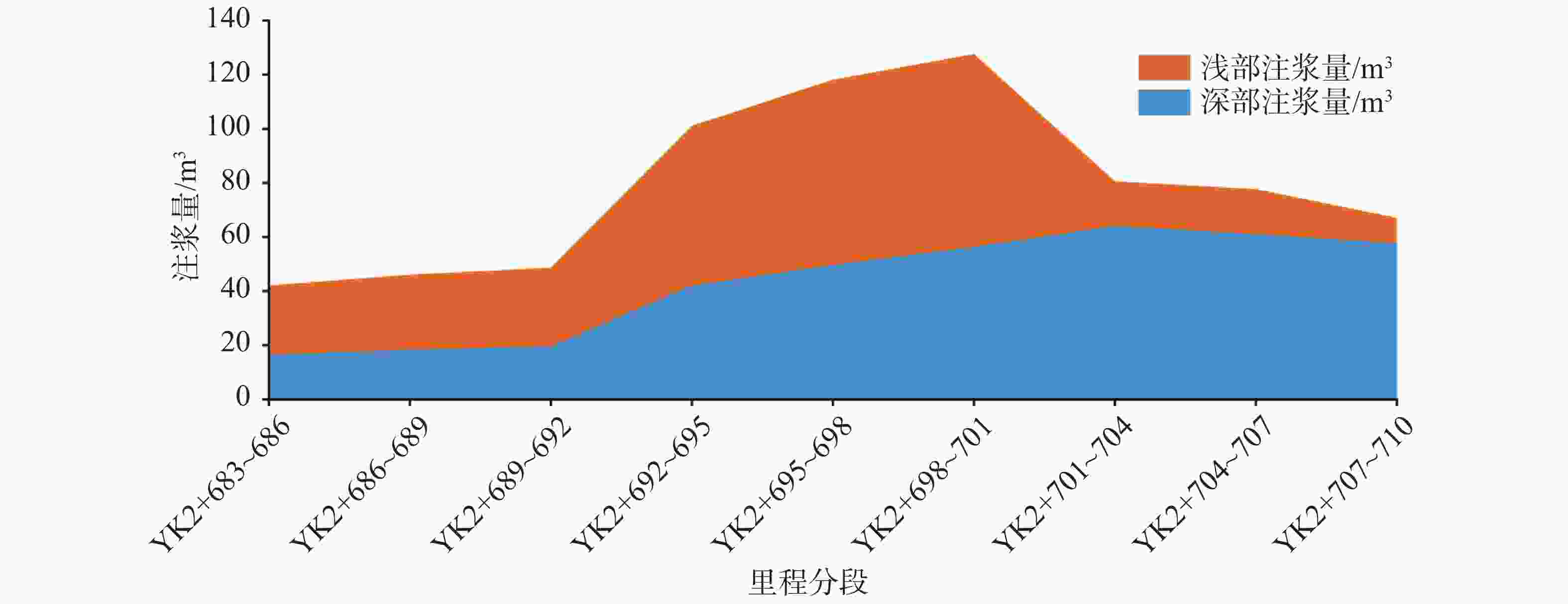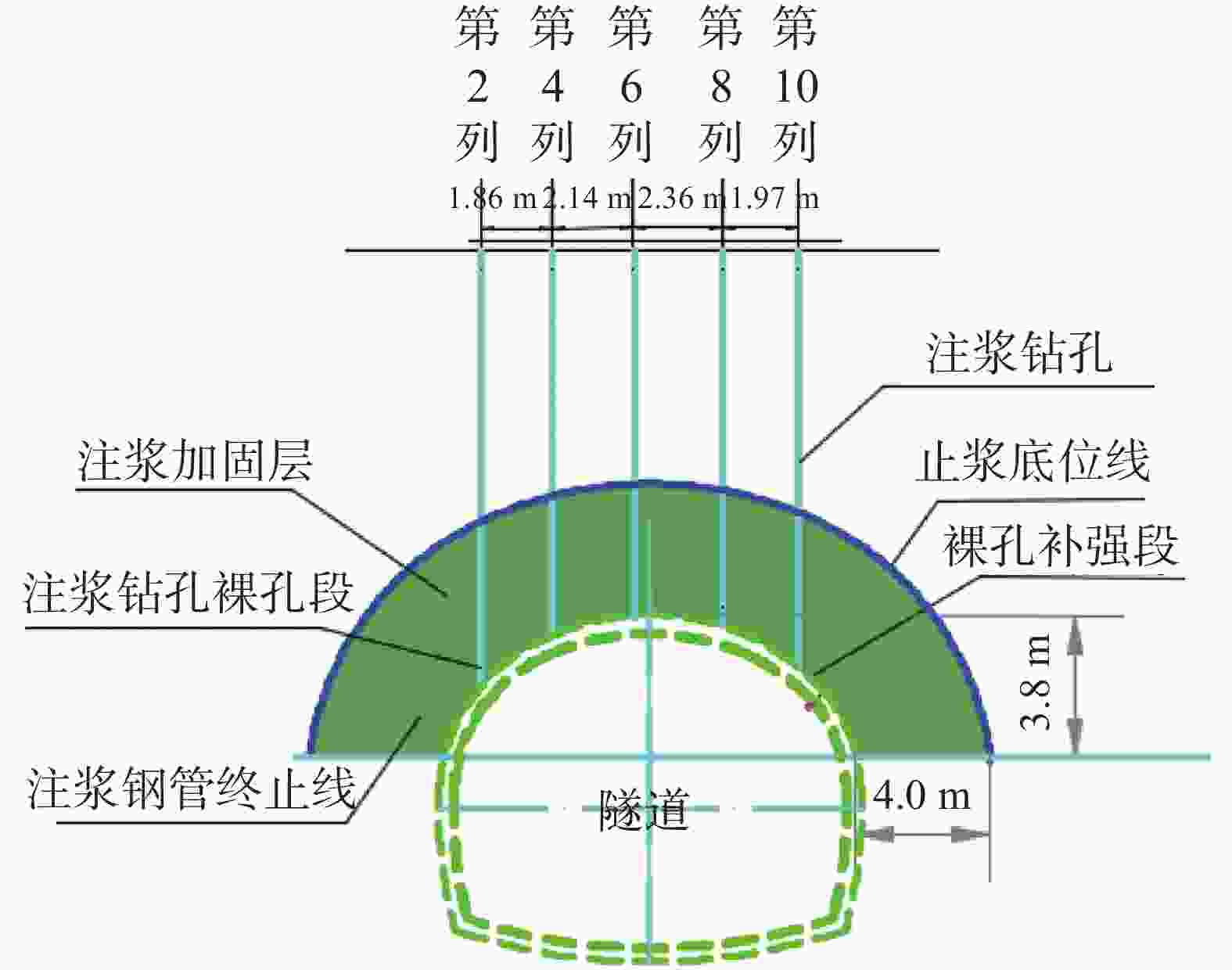 钻孔种类 设计钻孔数/个 优化后钻孔数/个 注浆量/m3 注浆终压范围/MPa 顶部阻浆层(A序)/垂直孔 30 26 91.59 0.3~0.8 拱顶止浆垫层(B序)/垂直孔 30 28 42.72 0.3~0.5 拱顶加固层(C序)/定向斜孔 35 31 96.60 0.5~1.0 中间加固层(D序)/垂直孔 30 24 108.63 1.0~1.5 补强孔/垂直孔 6 6 10.06 0.8~1.0 共计 131 115 349.54 -
