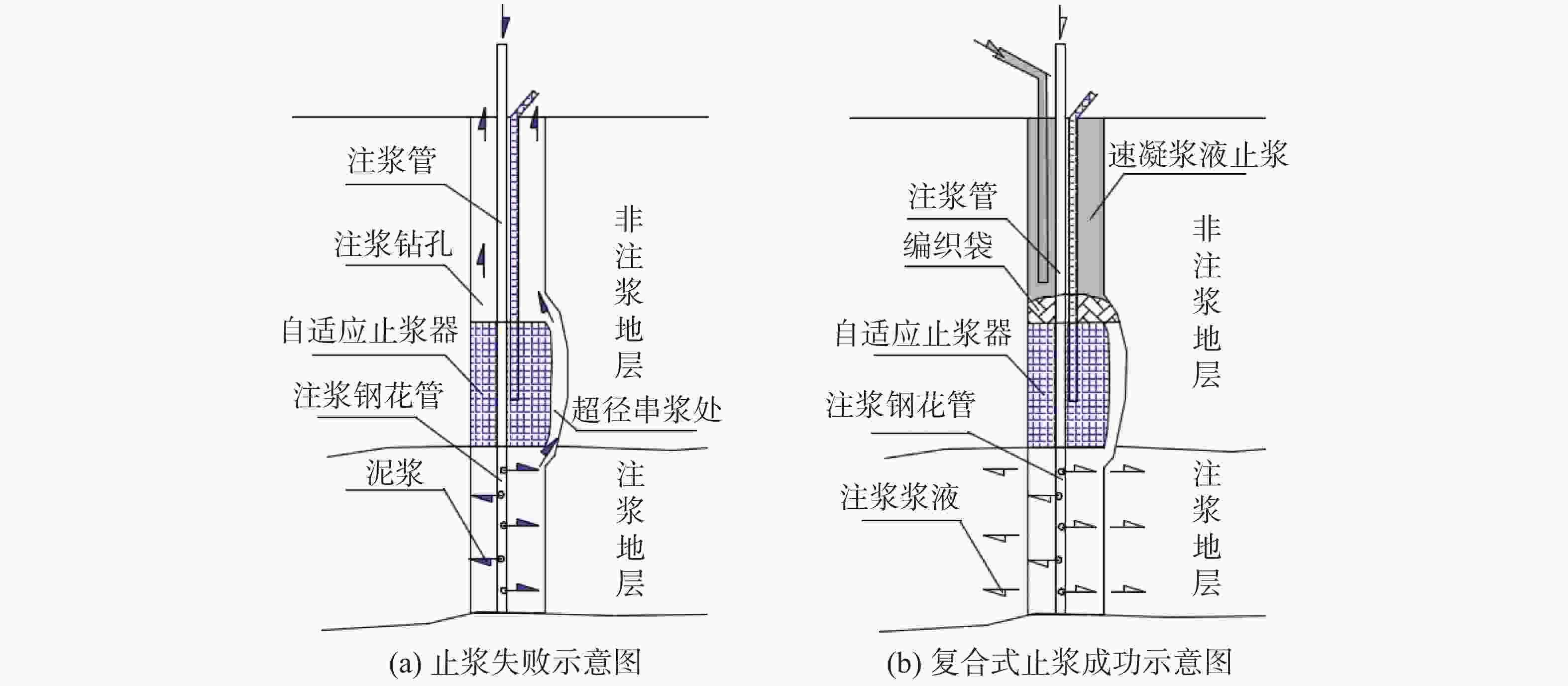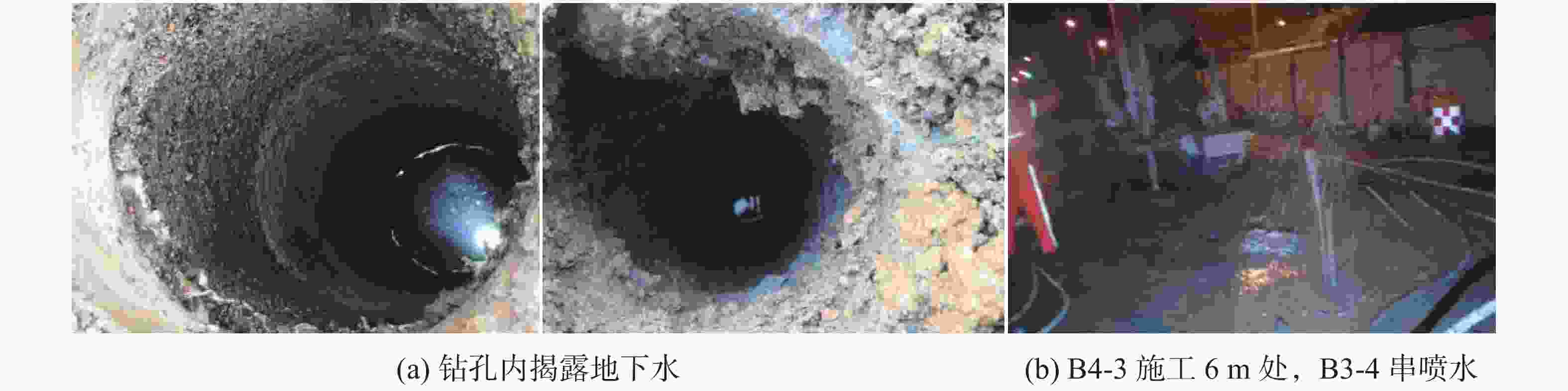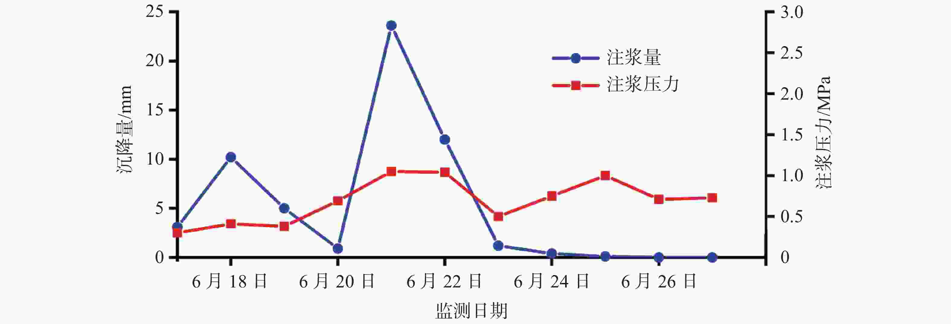 7.5B4-7补 6.9 B3-7 8.5 X2-4 6.3 B4-10补 6.3 B4-9补 5.0 B4-3补 6.1 B3-4 8.0 X2-3 4.5 注:B3-2补是指原设计B3-2孔遇到障碍无法施工,移位重打的钻孔编号,以下同。 表 2 各加固层注浆机理、浆液类型和控制注浆参数表
