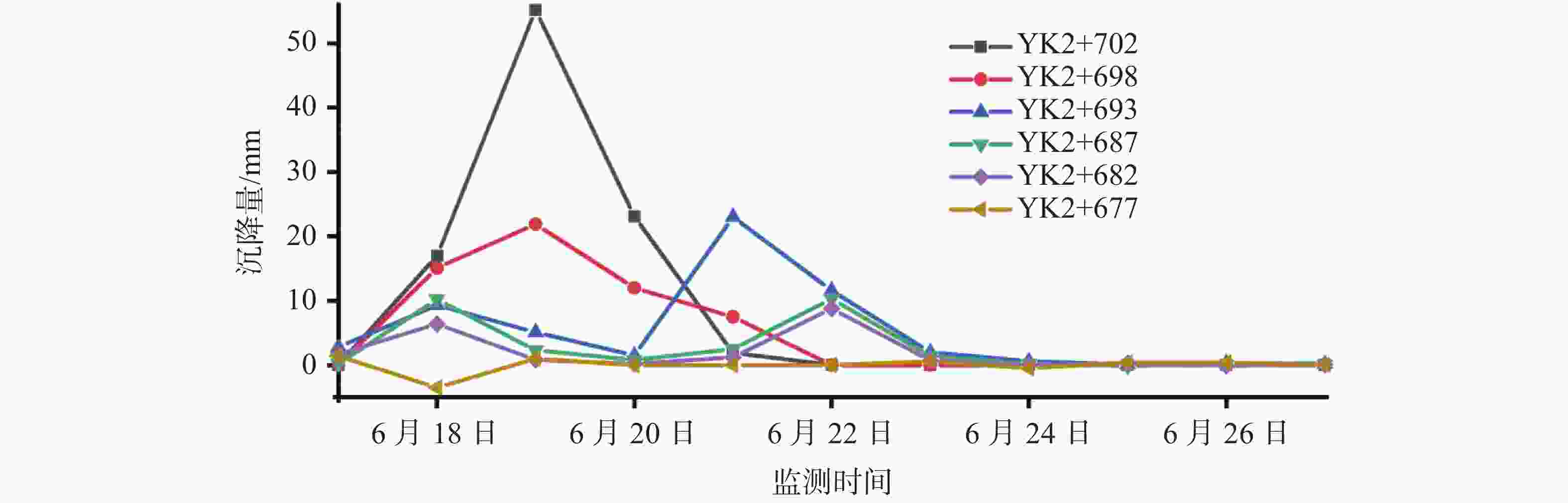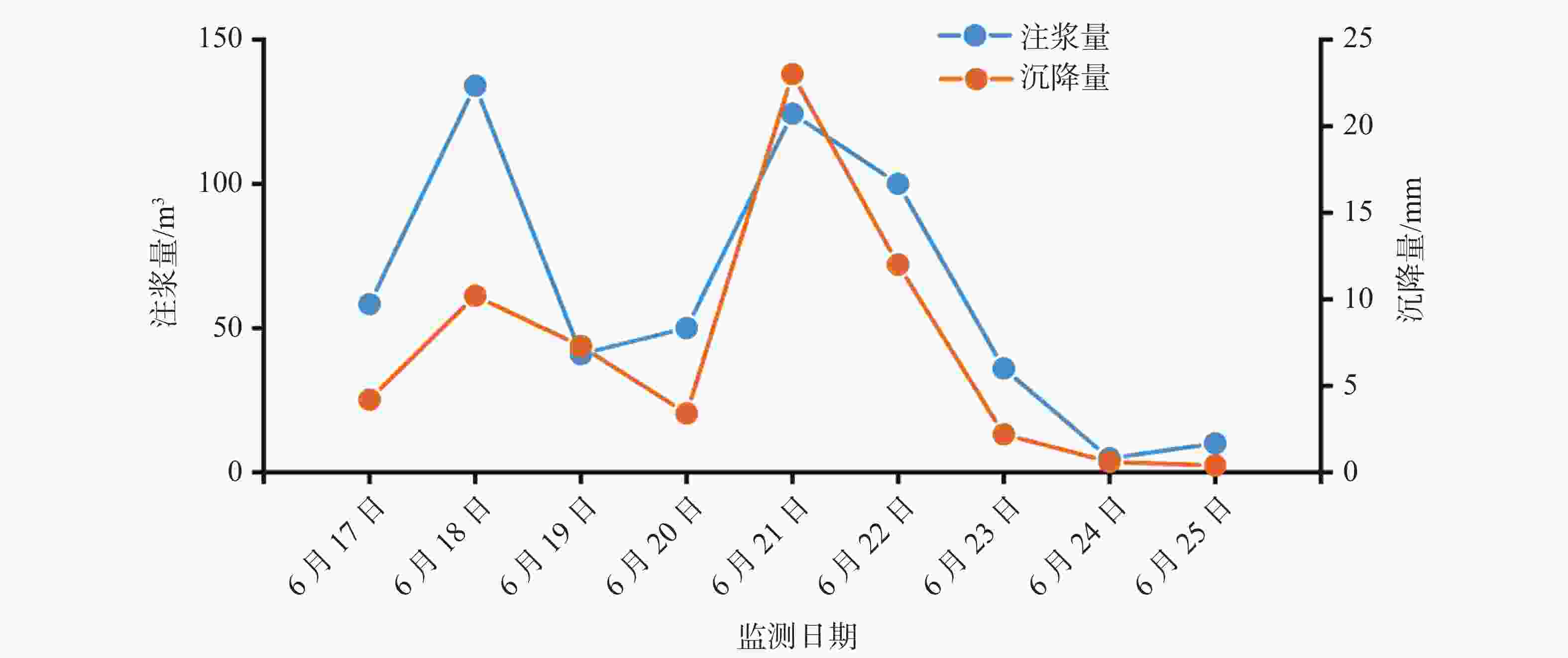 (不大于)/MPa1 顶部阻浆层 充填注浆 C-Gt混合浆液 1.5 1∶1 50~90 40 0.3 2 劈裂—挤密注浆 C-Gt混合浆液 1.6 2∶1 30~50 20 0.8 3 拱顶止浆垫层 充填注浆 C-Gt混合浆液 1.6 1∶1~2∶1 30~50 20 0.5 4 拱顶加固层 充填注浆 C-Gt混合浆液 1.5 1∶1 50~90 40 0.5 5 劈裂—挤密注浆 C-Gt混合浆液 1.5 1∶1 30-50 20 0.8~1.0 6 中间加固层 充填—劈裂—挤密 单双液交替 1.5 1∶1 90~150 20~40 1.0~1.5 7 未开挖超前加固层 劈裂—挤密 单双液交替 1.5 1∶1 50~90 20~40 1.0~1.2 8 影响区加固层 劈裂—挤密 单双液交替 1.5 1∶1 50~90 20~40 1.0~1.2 注:配浆使用普通硅酸盐水泥,水泥标号P.O 42.5R;GT浆液密度控制在1.2-1.3 g·cm−3。单液浆密度平均1.5 g·cm−3。 表 3 沉陷区重点加固段各加固层钻孔数量、注浆量和注浆终压统计表