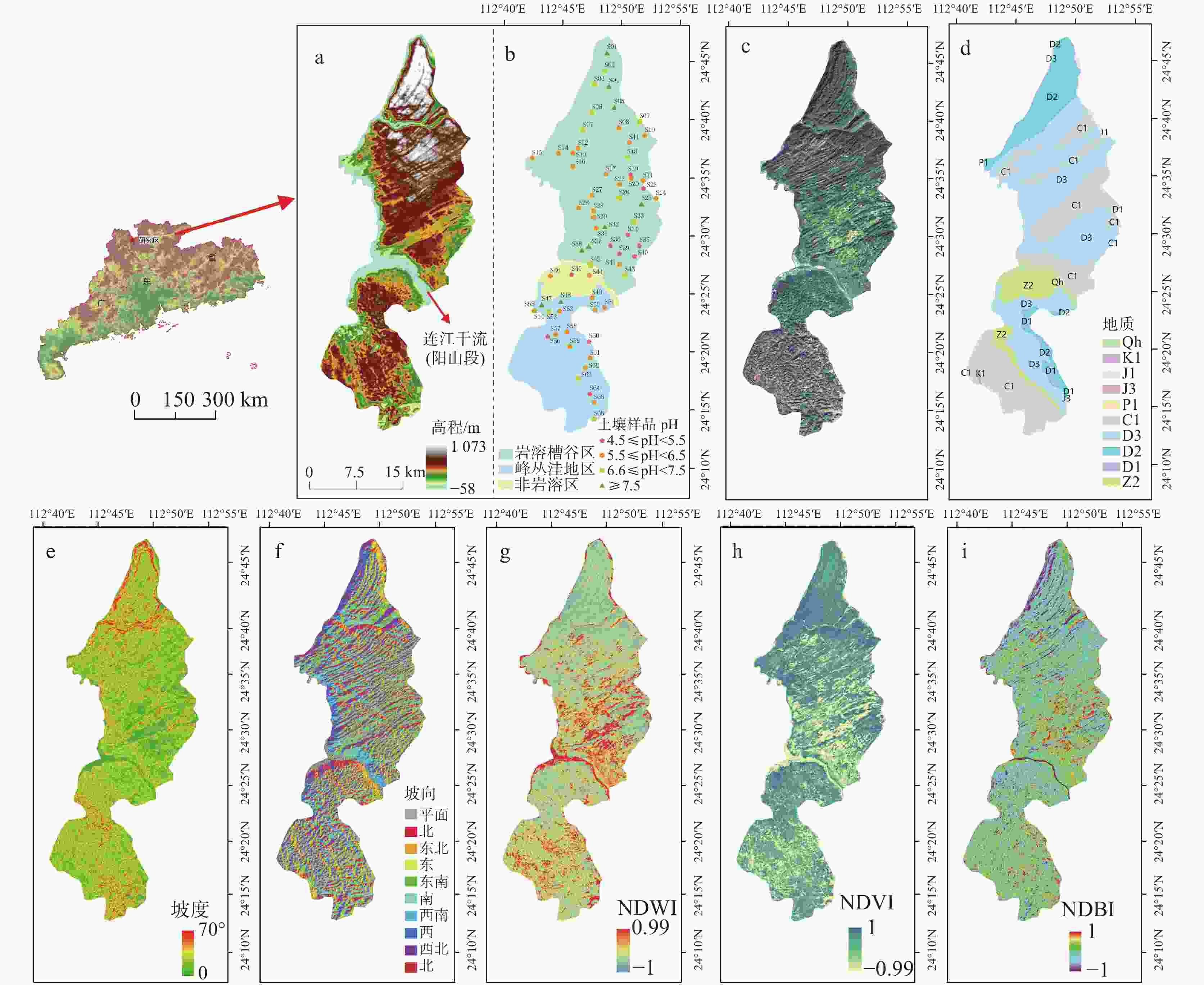 a.研究区DEM分布图 b.样点分布图 c.研究区的遥感影像 d.研究区的水文地质图,其地层代码分别为:Qh为第四纪,K1为白垩纪下统,J1为侏罗纪下统,J3为侏罗纪上统,P1.二叠纪下统,C1.石炭纪下统,D3.泥盆纪上统,D2.泥盆纪中统,D1为泥盆纪下统,Z2.震旦纪中统 e,f. 由DEM提取的坡度和坡向图 g,h,i.通过遥感图提取的归一化水体指数(NDWI)、归一化植被指数(NDVI)和归一化建筑指数(NDBI)等指数的空间分布图