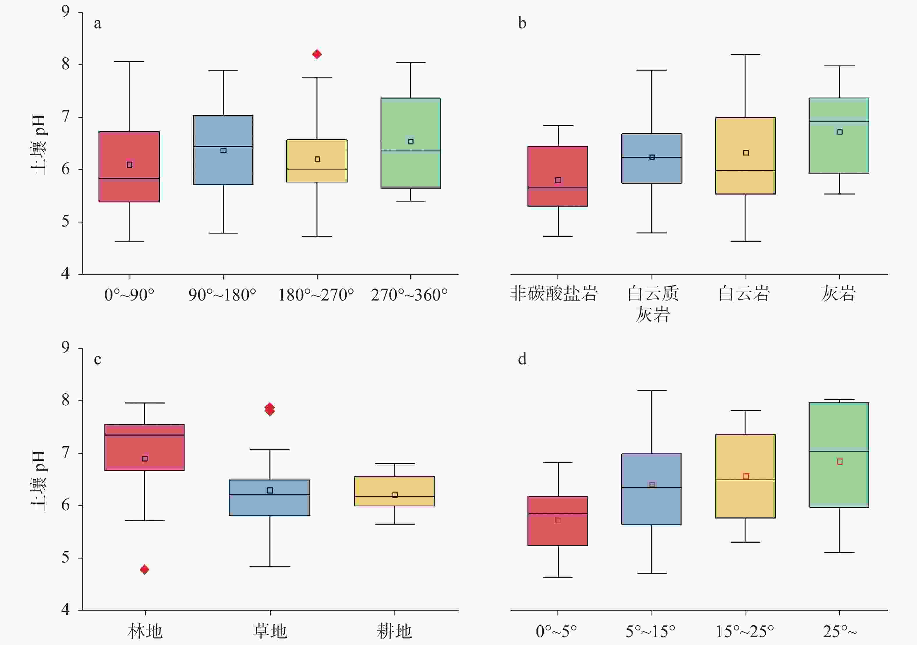 交互作用 判据 加强 q(x1∩x2)>q(x1)或q(x2) 加强,双线性 q(x1∩x2)>q(x1)和q(x2) 加强,非线性 q(x1∩x2)>q(x1)+ q(x2) 减弱 q(x1∩x2)<q(x1)+ q(x2) 减弱,单线性 q(x1∩x2)<q(x1)或q(x2) 减弱,非线性 q(x1∩x2)<q(x1)和q(x2) 独立 q(x1∩x2)= q(x1)+ q(x2) 表 2 不同地貌类型土壤pH的统计表