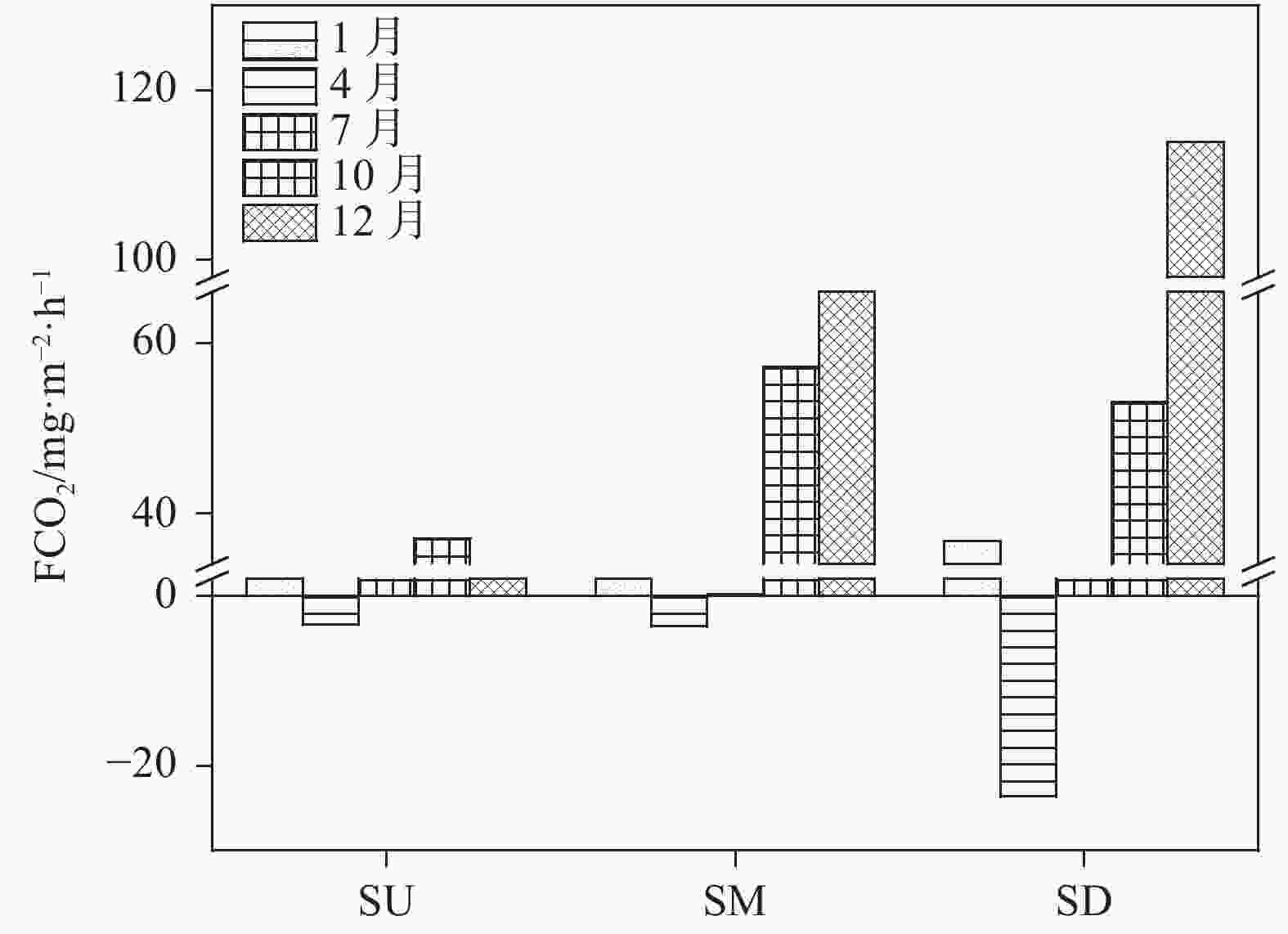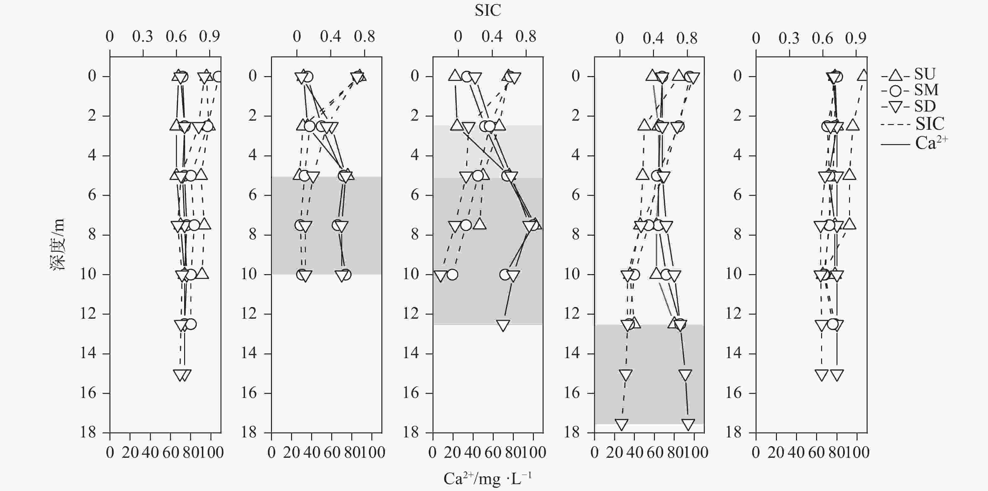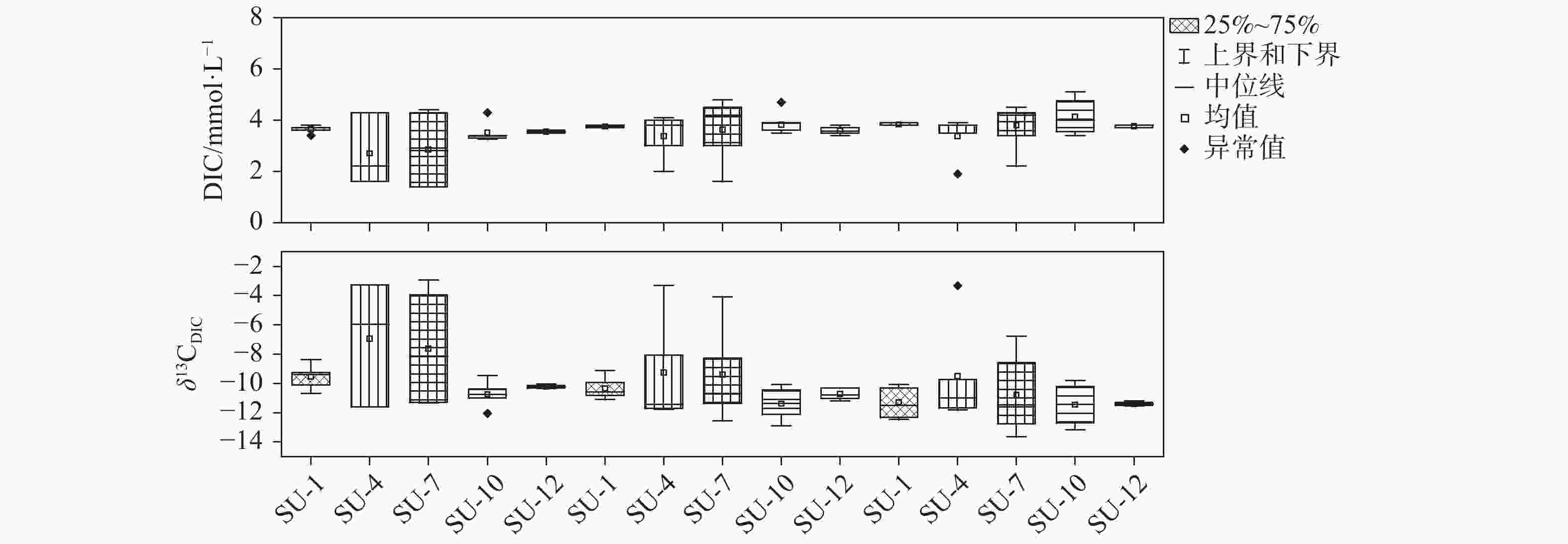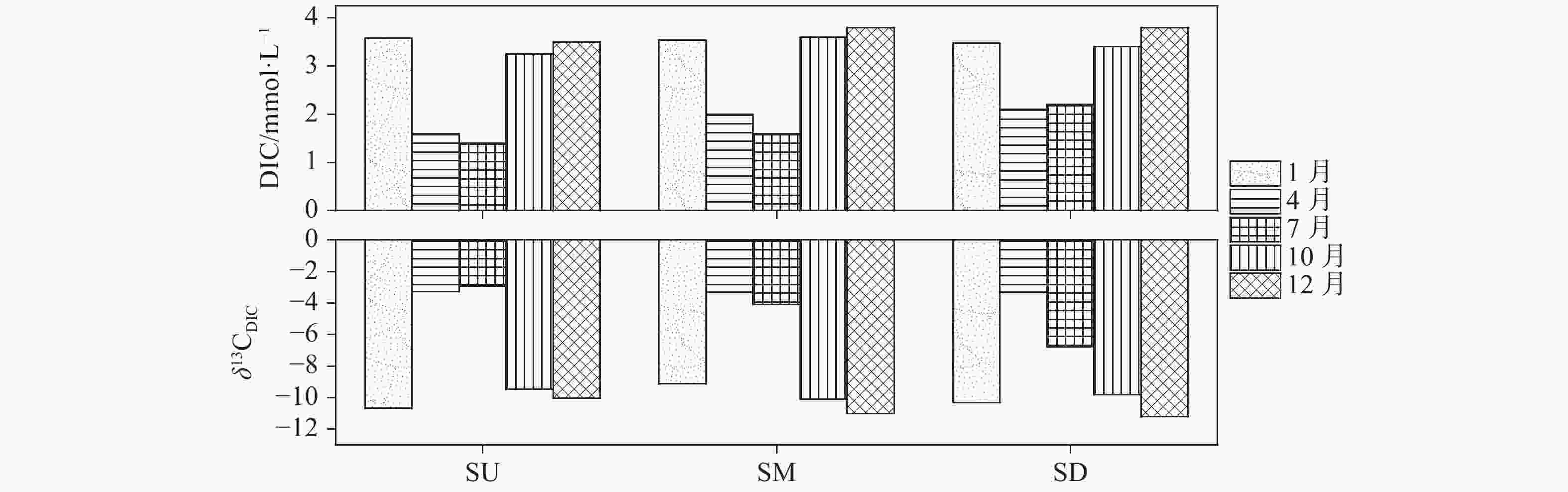 0.62注:SU(上游), SM(中游), SD(下游), E(表水层), T(温跃层), H(底水层),Mix(混合期)。 表 2 观测期间大龙洞水库各水层DIC浓度与δ13CDIC值变化梯度