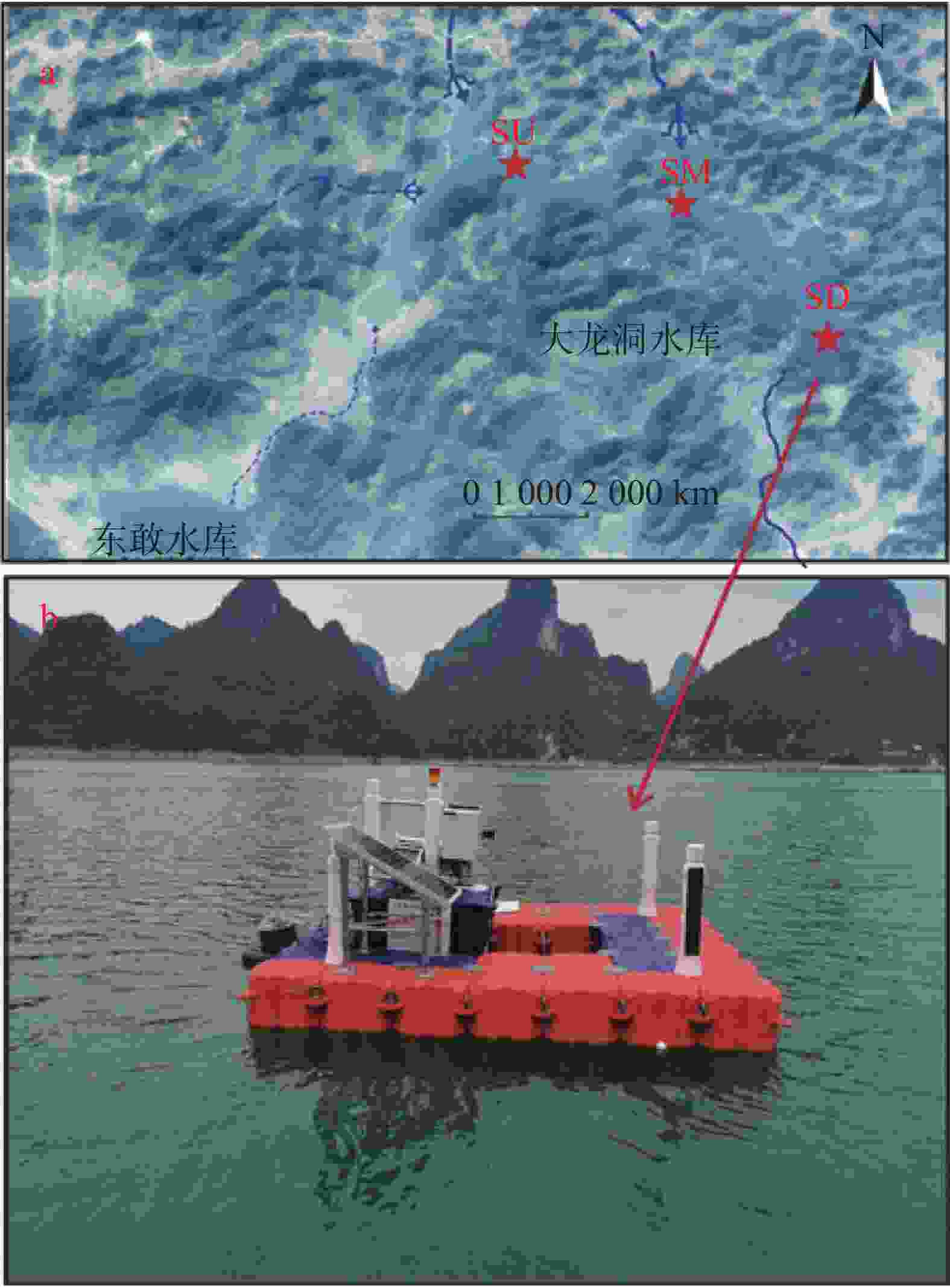 摘要: 以中国南方亚热带地区典型的地下水补给型水库——大龙洞水库为对象,于2018年1月、4月、7月、10月、12月分别在上、中、下游三个监测点进行采样,探究水库热结构变化对于水体无机碳及其同位素的影响过程及机理。结果表明:(1)大龙洞水库水体在一个水文年中呈现周期性的混合期—分层期—混合期的热结构变化,4月热分层开始显现,7月逐渐显著呈现完整的热分层,10月以后热分层逐渐消失,水体逐渐实现混合;(2)水体热分层是溶解无机碳(DIC)浓度与碳稳定同位素(δ13CDIC)值变化的主要驱动力。表水层中DIC主要受水—气界面二氧化碳脱气、水生生物光合作用控制,其DIC浓度与δ13CDIC值分别为3.22 mmol·L−1和−9.15‰;温跃层中DIC主要受有机质降解过程影响,其DIC浓度与δ13CDIC值分别为3.43 mmol·L−1和−9.70‰;底水层中DIC主要受碳酸盐沉淀过程影响,其DIC浓度与δ13CDIC值分别为4.32 mmol·L−1和−11.89‰;(3)三种过程伴随水库热结构的变化而变化,驱动DIC浓度及其同位素的变化梯度 G (DIC)与 G (δ13CDIC)的变化,表现为底水层<表水层<温跃层。热分层结束进入混合期后,DIC浓度与δ13CDIC值的时空差异均逐渐消失,最终表现出DIC浓度与δ13CDIC值的均一化。Abstract: Dalongdong Reservoir, a typical groundwater recharge reservoir in karst area of southwest China, is located at 23°30′01″−23°40′08″N and 108°30′02″−108°36′04″E in Shanglin county, Nanning City, Guangxi. This large reservoir was built mainly for irrigation and power generation by blocking caves, sinkholes and some fissures in a karst valley in 1958. It covers a rainwater collecting area of 310 km2, totaling storage capacity of 151 million m3. Approximately 95% of the recharge water comes from two karst subterranean streams. The principal strata in the reservoir catchment are carbonate rocks of Carboniferous (C1) and Devonian (D2d3) era. Influenced by the subtropical monsoon climate, the average temperature in the reservoir area is 21℃ and the average rainfall is 1,837.3 mm. The rainy season in this area is from April to September. Samples were collected respectively by the plankton method at the upper, middle and downstream monitoring sites in January, April, July, October and December, 2018. Based on DIC concentration, δ13CDIC value, water temperature, DO, SIC, partial pressure of carbon dioxide, carbon dioxide diffusion flux and other indicators, the thermal structure change on DIC concentrations and isotope composition δ13CDIC in each water layer of reservoir and its influencing factors are systematically studied. The gradient differences of DIC concentrations and isotopic composition δ13CDIC in different water layers and their causes are also discussed.In order to provide scientific and technological support for accurate assessment of carbon budget of land and water, the carbon cycle process of karst reservoirs was deeply revealed. The results show that Dalongdong reservoir presents periodic thermal structure changes in the mixing stage−stratification stage−in a hydrological year. The thermal stratification begins to appear in April, gradually presents complete thermal stratification in July, and gradually disappears after October.Besides, thermal stratification is an important driving force of DIC concentration and δ13CDIC value. After the formation of thermal stratification, DIC concentrations in the upper, middle and lower reaches show the same characteristics as those of the δ13CDIC values at the same layer, and DIC concentrations increase with depth, while δ13CDIC values become negative. DIC concentrations and δ13CDIC values are respectively 3.22 mmol·L−1 and −9.15‰ in surface water, 3.43 mmol·L−1 and −9.70‰ in thermocline, and 4.32 mmol·L−1 and −11.89‰ in bottom water. After thermal stratification, the vertical, horizontal and seasonal variations of DIC concentrations and δ13CDIC values gradually disappear, and finally show their homogenization.Finally, carbon dioxide degassing and photosynthesis dominate the water-air interface in the surface water layer. Degradation of organic matter is the main process in thermocline, and carbonate precipitation can be mostly found in the bottom water layer. The change of these three processes with the reservoir thermal structure may drive the variation of DIC concentrations and isotope gradient G (DIC) and G (δ13CDIC), which shows the characteristics of bottom water layer < surface water layer < thermocline layer.