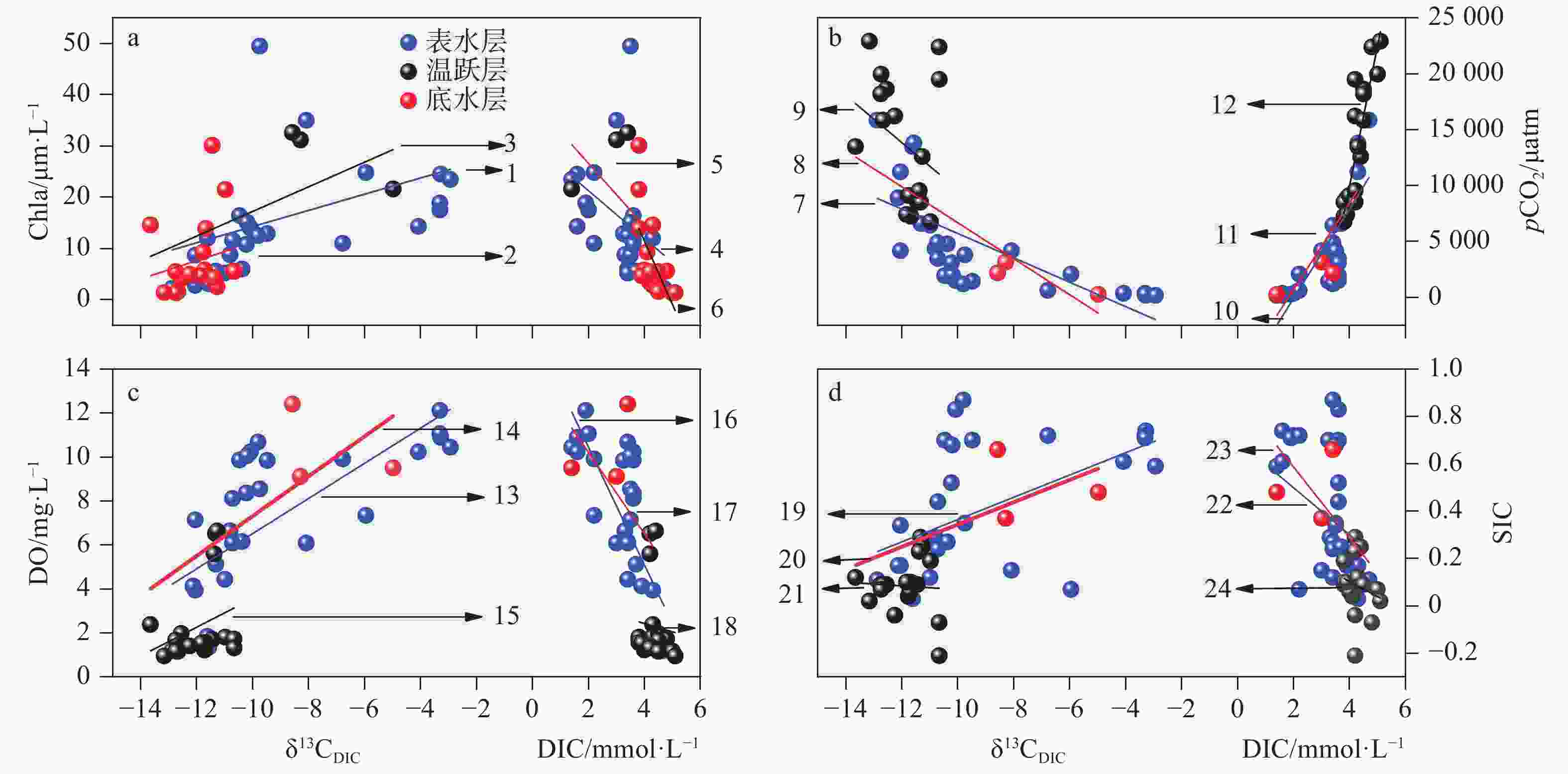 图 9 大龙洞水库各采样点分层期间各水层DIC浓度及δ13CDIC值与主要指标相关关系