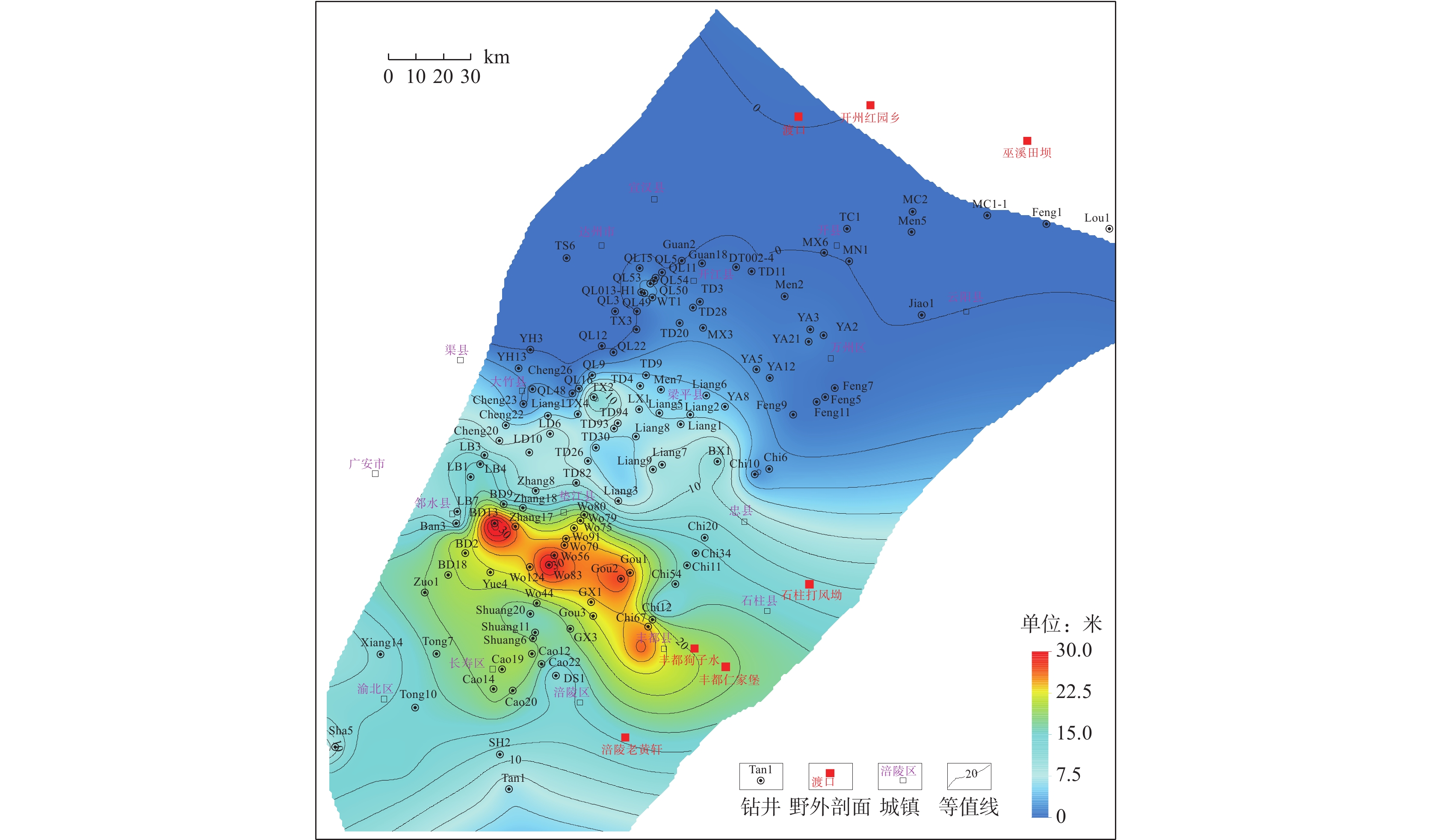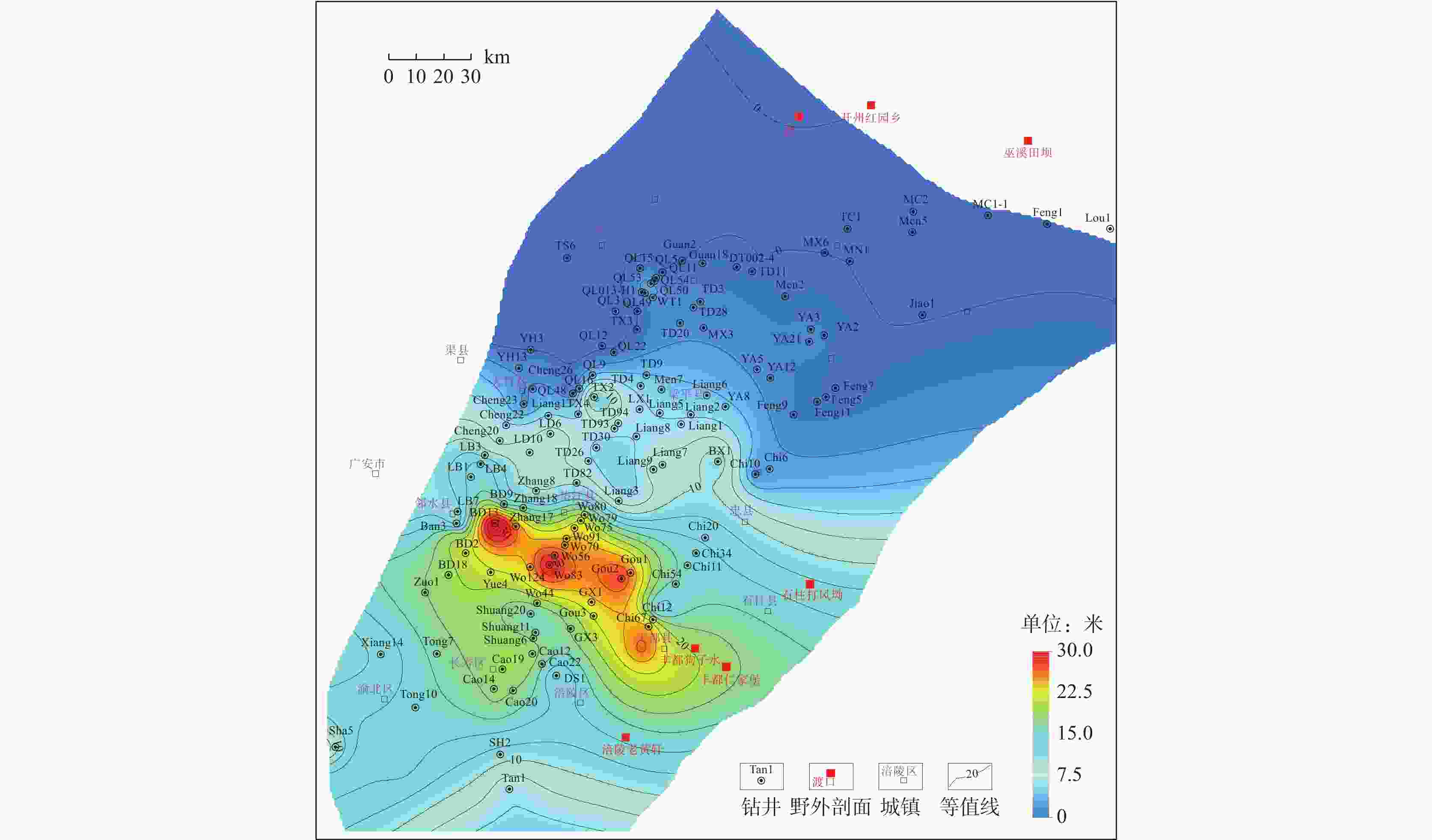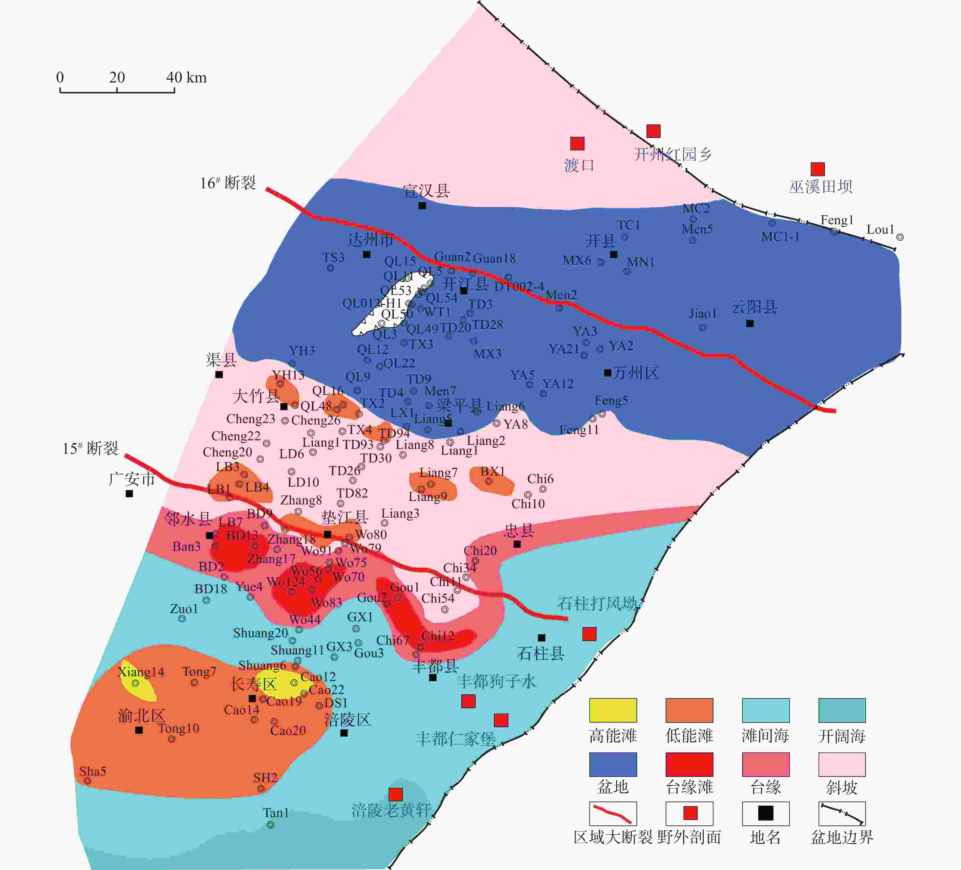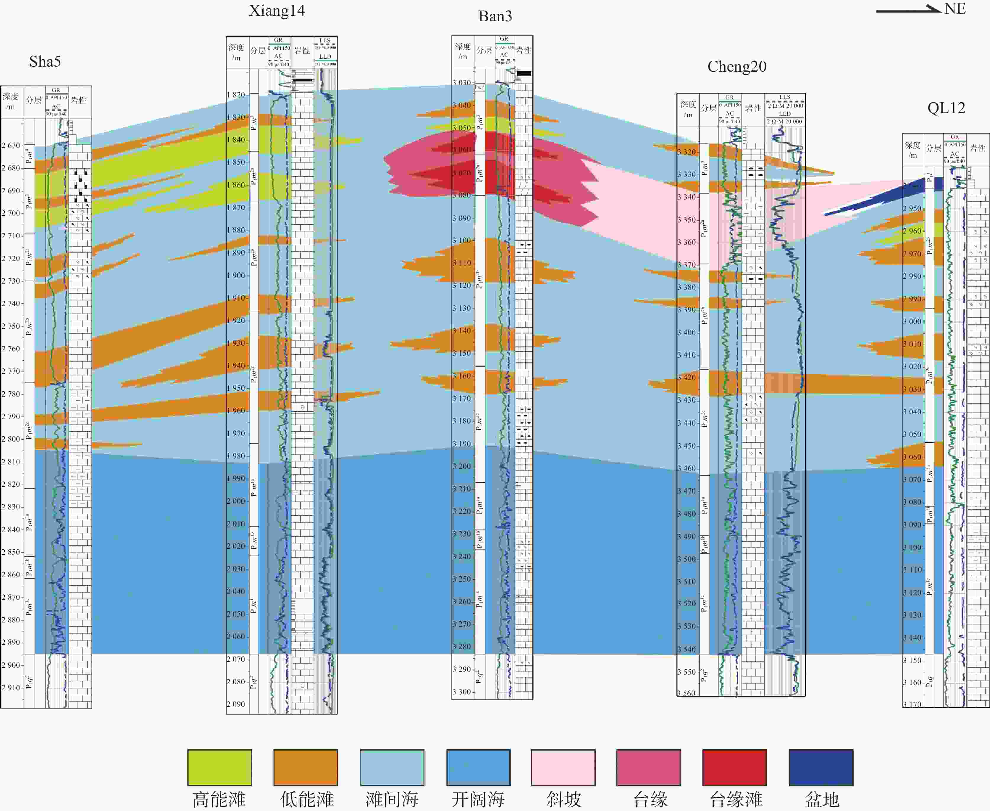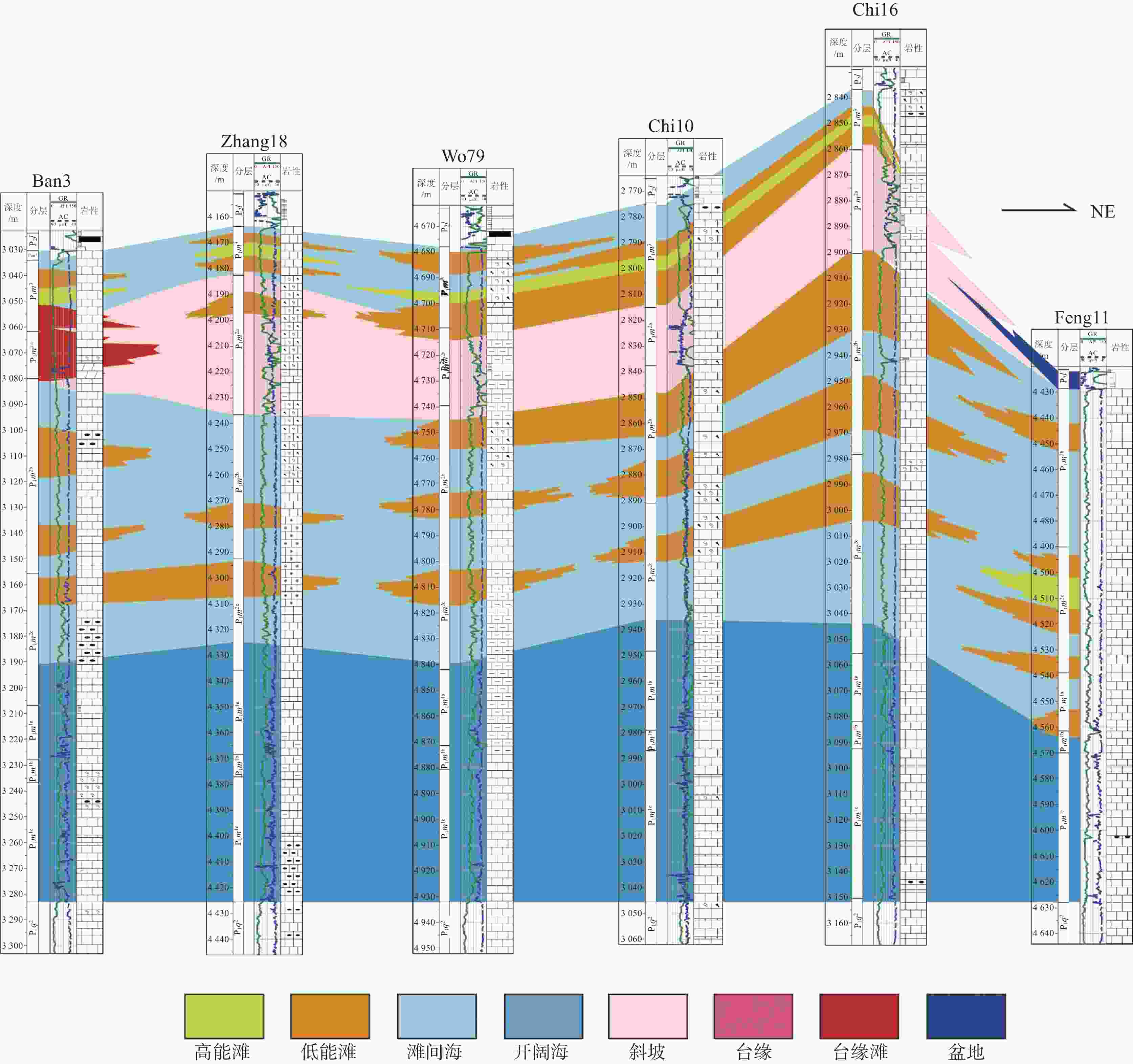 摘要: 为了精细描述碳酸盐岩储层展布,对滩相沉积刻画的精度要求日益增高。针对川东地区茅口组地层因抬升遭受剥蚀,难以统计颗粒滩真实厚度的问题,提出结合滩地比技术刻画碳酸盐岩滩相类型及分布范围,进而开展碳酸盐岩沉积相描述。利用丰富的钻井资料,通过滩相识别标志建立、连井沉积对比、滩地比统计以及沉积相平面展布等一系列研究,揭示川东地区茅二a亚段从南西到北东沉积相带展布依次为开阔台地-台地边缘-斜坡-盆地,其中台地边缘在邻水县-丰都县-忠县一带近似呈东西条带状展布;台内低能滩和斜坡低能滩主要分布在滩地比0.3~0.5的区域,台内高能滩在滩地比0.5~0.6的区域发育,台缘滩主要分布在滩地比0.6~0.8的区域,钻井试气结果表明滩相沉积对油气产能具有一定的控制作用,且台缘滩比台内高能滩更具有勘探潜力。本次研究表明在碳酸盐岩地层被剥蚀地区,相比滩体厚度,利用滩地比能够更准确的分析颗粒滩的类型及展布范围,从而判断研究层段颗粒滩发育情况。Abstract: The accurate description of the distribution of carbonate reservoirs requires increasing precision for the characterization of beach facies sedimentation. In view of the difficulty in calculating the real thicknesses of granular beaches on Maokou formation in eastern Sichuan due to uplift and erosion of strata, we characterized the types and distribution range of carbonate beaches based on the ratios of shoal thicknesses to the whole stratum thickness, and then described the carbonate sedimentary facies. Based on abundant drilling data, we conducted a case study by the establishment of identification marks of beach facies, the correlation of inter-well sedimentation, ratios of shoal thickness to stratum thickness and the planar distribution of sedimentary facies. This study indicates that the distribution of sedimentary facies in layer a of Mao2 submember from southwest to northeast in eastern Sichuan is respectively open platform, platform margin, slope and basin, among which the platform margin is approximately east-west banded in the area of Linshui-Fengdu-Zhongxian. The low-energy beaches both in the platform and in the slope are mainly distributed in the area with ratios of shoal thickness to stratum thickness of 0.3-0.5; the high-energy beach in the platform is developed in the area with ratios of 0.5-0.6; and the marginal platform beach is mainly distributed in the area with ratios of 0.6-0.8. The results of well gas test show that beach facies have a certain controlling effect on oil-gas productivity, and the marginal platform beach has more exploration potential than the high-energy beach in the platform. The study shows that in the area where carbonate strata are eroded, compared with the thickness of beach, the use of the ratios of shoal thickness to the whole stratum to accurately analyze the type and distribution range of granular beach so as to judge the development of granular beaches in the layer section.