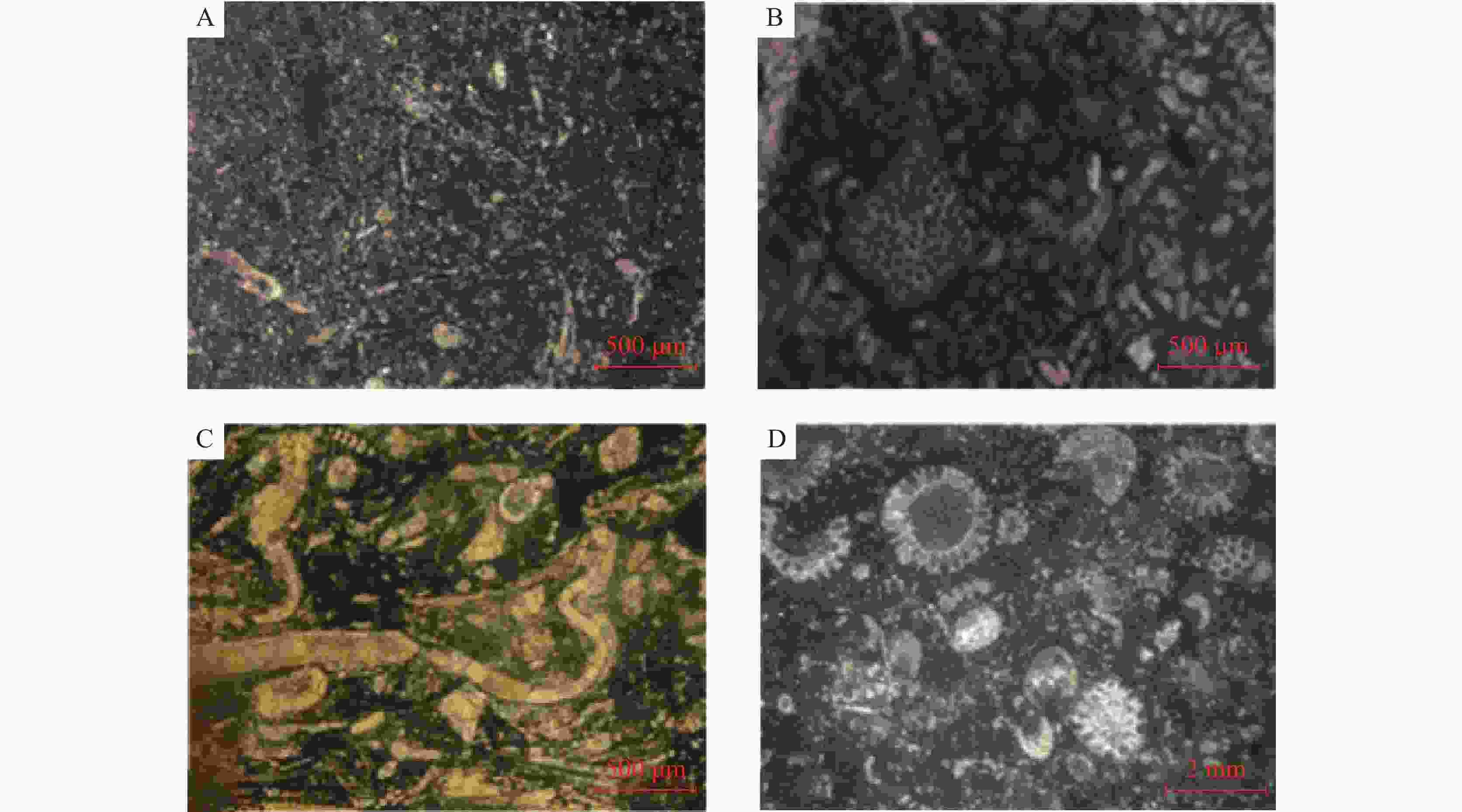 A-生屑泥晶灰岩,Chi10井 B-亮晶生屑灰岩,Wo56井 C-泥晶生屑灰岩,Chi6井 D-泥晶藻屑灰岩,涪陵老黄轩剖面