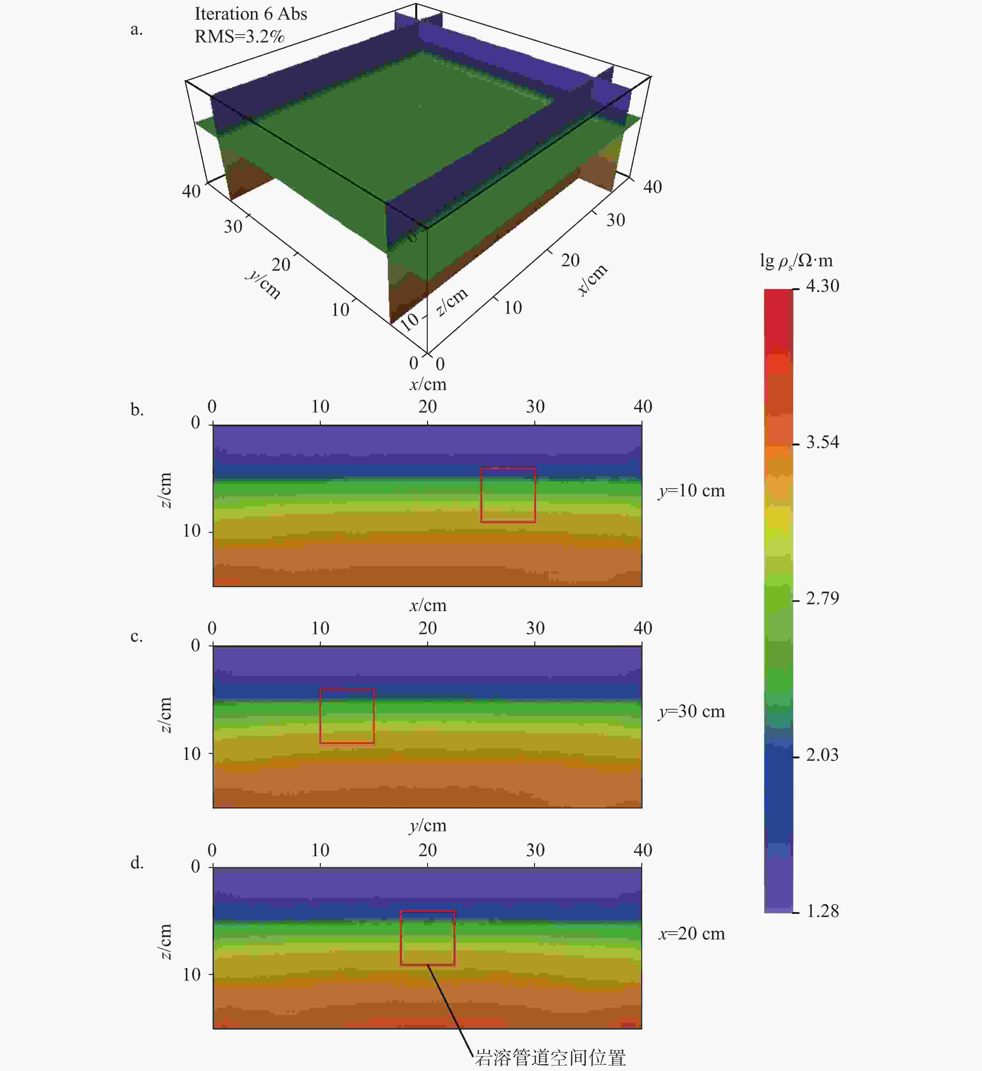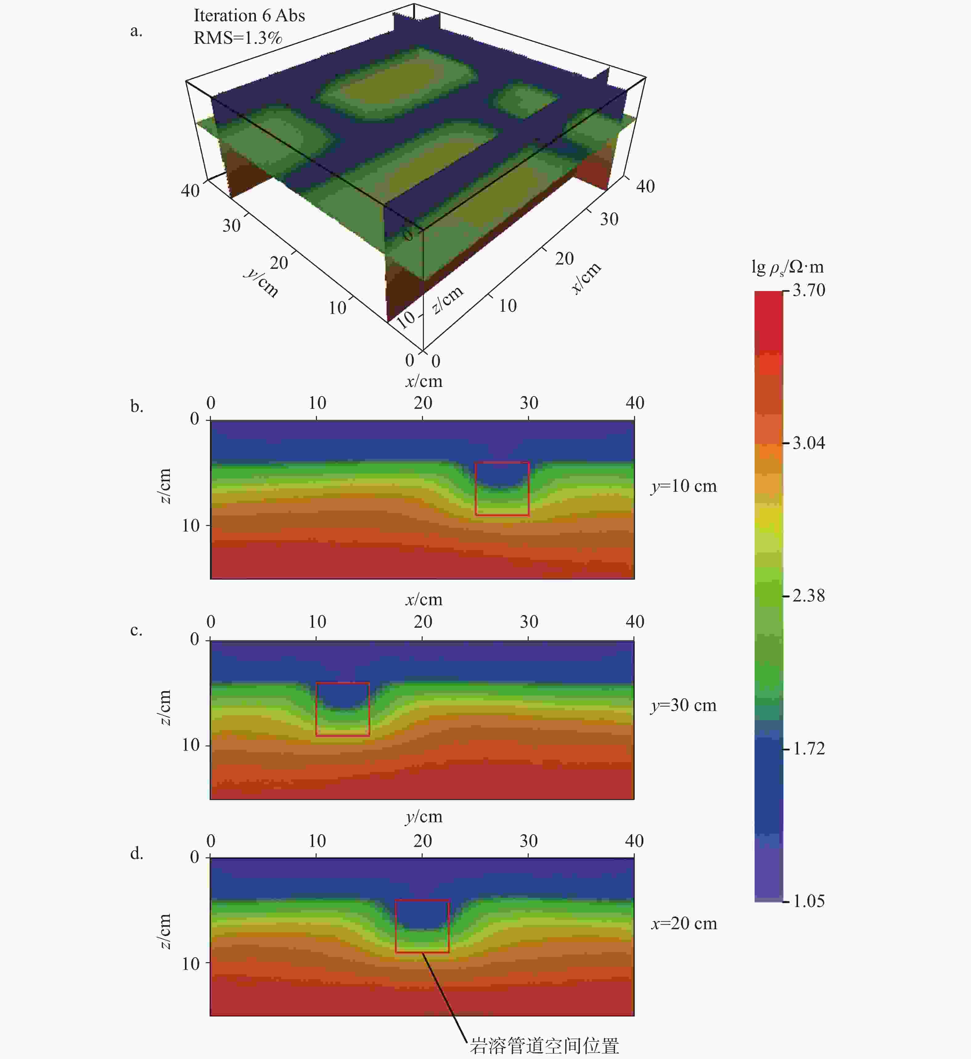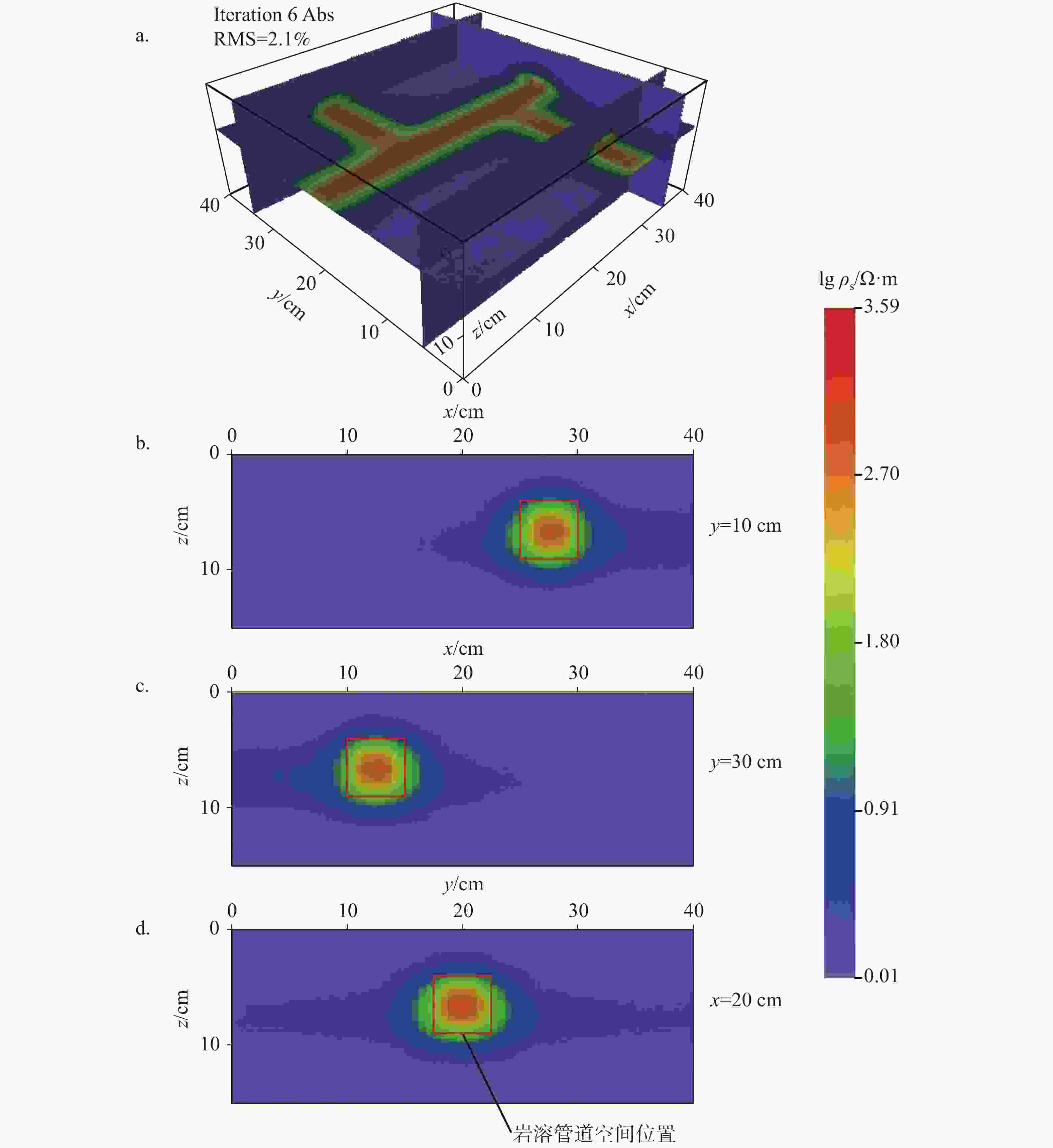 (a. 立体视角图,b. y=10 cm时xz方向切片,c. y=30 cm时xz方向切片,d. x=20 cm时yz方向切片)