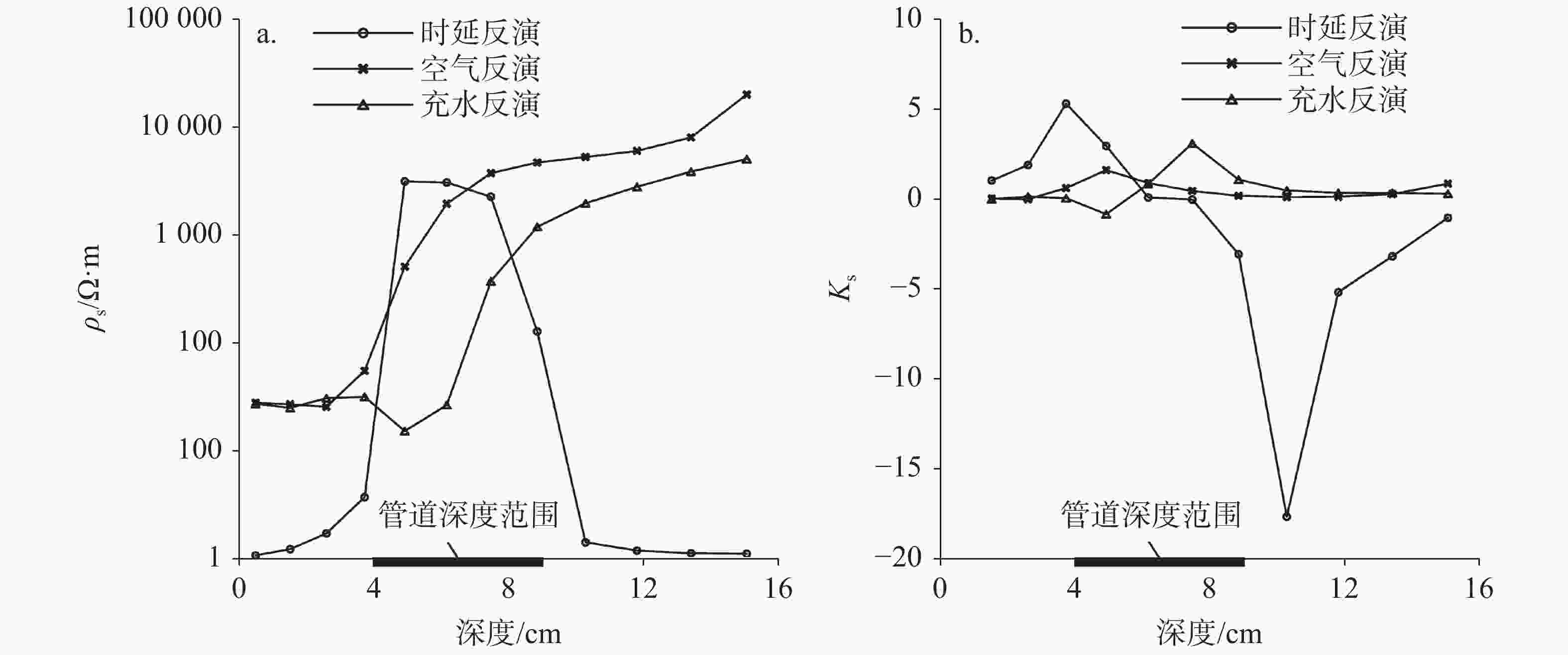 图 6 地下河管道中心处时延反演、充水反演以及充填空气反演时电阻率测深曲线对比图(x=20 cm, y=20 cm)