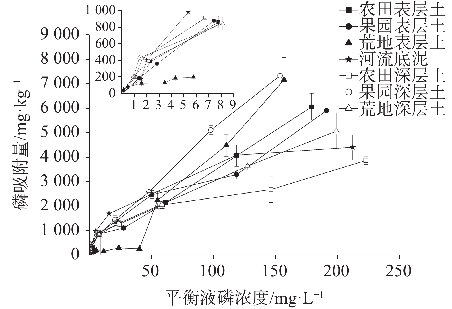 土地利用类型 pH 总磷(TP)/mg·kg−1 有效磷(AP)/mg·kg−1 总有机碳(TOC)/g·kg−1 总氮(TN)/g·kg−1 黏粒/% 粉粒/% 砂粒/% 农田表层土 7.64±0.05 591.93±64.03 63.11±6.79 35.54±4.55 3.56±0.27 66.42 27.45 6.13 果园表层土 7.37±0.10 389.73±26.09 12.27±1.28 13.38±1.75 1.44±0.15 61.23 36.53 2.25 荒地表层土 6.15±0.04 223.31±11.05 25.19±5.80 20.83±8.15 2.20±0.64 76.50 20.18 3.32 河流底泥 7.20±0.08 345.55±32.31 30.37±3.79 46.57±4.26 4.84±0.55 / / / 农田深层土 7.75±0.04 407.23±93.01 71.23±5.39 16.32±14.35 1.49±1.05 64.96 31.27 3.77 果园深层土 6.96±0.22 354.54±82.16 26.52±4.66 10.96±2.29 1.17±0.20 54.62 30.27 15.11 荒地深层土 7.48±0.18 315.25±86.20 7.95±0.88 7.30±2.31 0.97±0.18 66.11 29.22 4.68 注:表中数值为平均值±标准差。 表 2 不同土地利用类型下土壤对磷的等温吸附参数