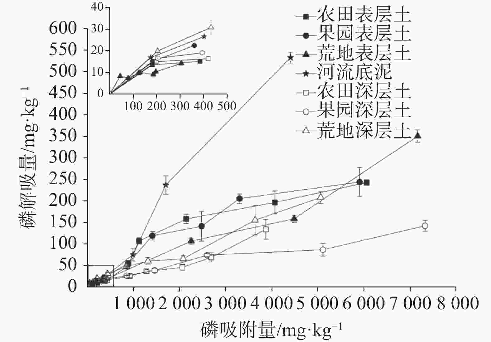 土地利用类型 R2 吸附能(K)/kJ·mol−1 最大吸附容量(Qm)/mg·kg−1 最大缓冲容量(MBC) 农田表层土 0.95** 0.146 1 388.89 202.84 果园表层土 0.97** 0.032 4 049.61 129.87 荒地表层土 0.91** 0.709 359.71 255.10 河流底泥 0.98** 0.034 4 961.61 171.82 农田深层土 0.93** 0.062 2 777.78 170.94 果园深层土 0.93** 0.119 1 923.08 228.83 荒地深层土 0.93** 0.086 2 325.58 200.40 注:** P < 0.01;MBC = K*Qm。 表 3 不同土地利用类型下土壤对磷的吸附量与解吸量的关系