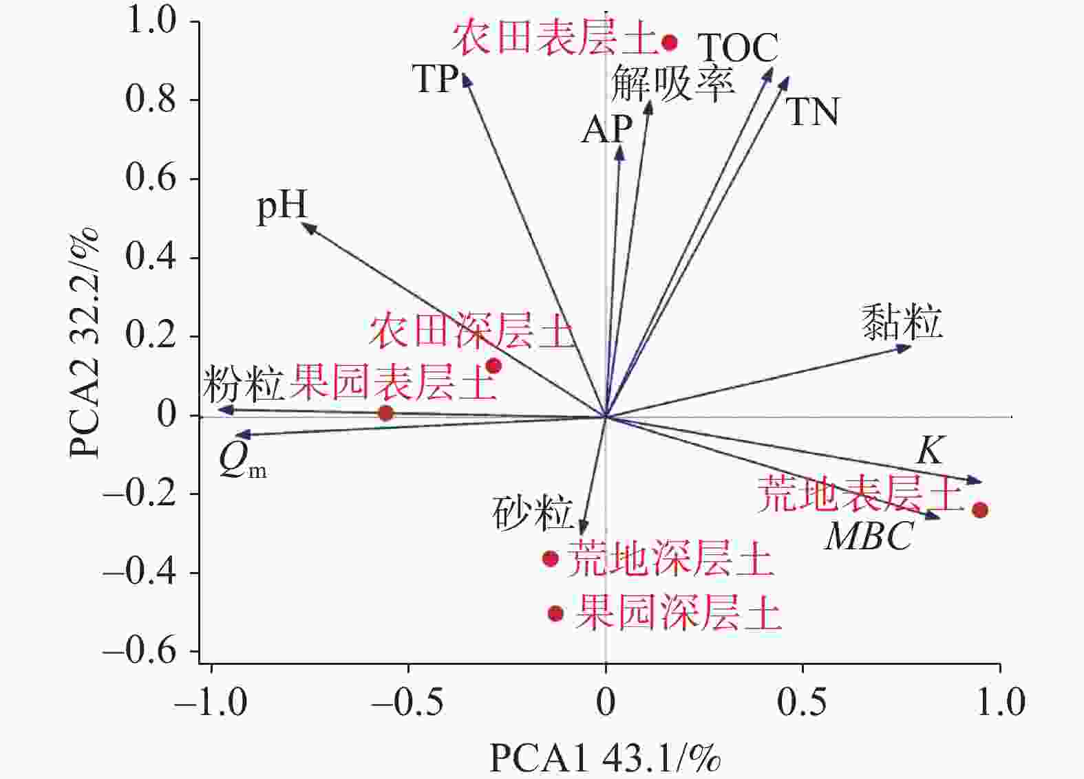 参数 pH 总磷 有效磷 总有机碳 总氮 黏粒 粉粒 砂粒 K −0.845* −0.525 −0.144 0.043 0.058 0.827* −0.889* −0.249 Qm 0.619 0.208 0.266 −0.285 −0.330 −0.577 0.821* −0.056 MBC −0.508 −0.388 −0.079 0.177 0.208 0.764 −0.917* −0.122 解吸率(a) 0.468 0.518 0.852* 0.124 0.043 0.102 0.189 −0.371 注:* P < 0.05。 -
