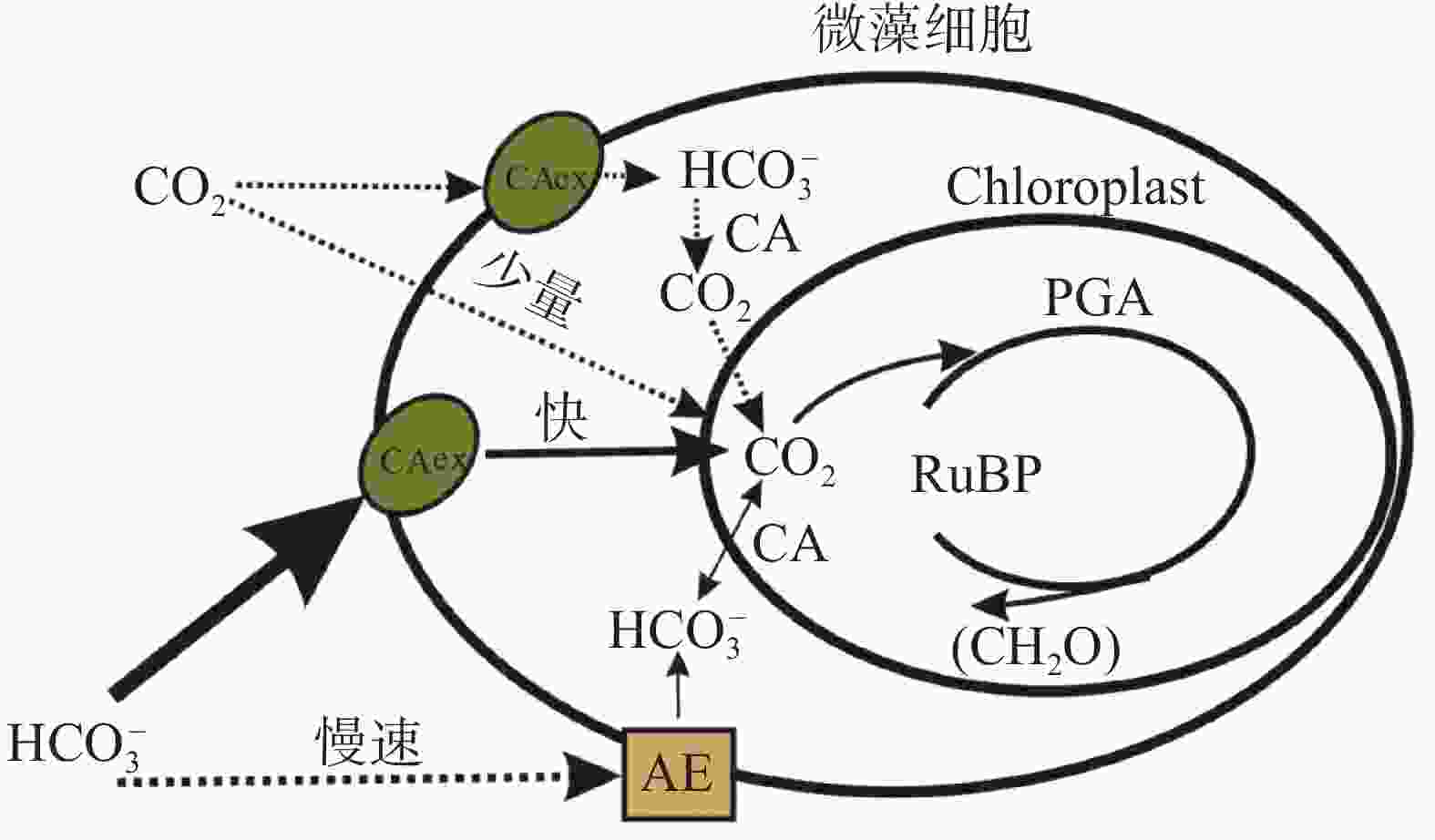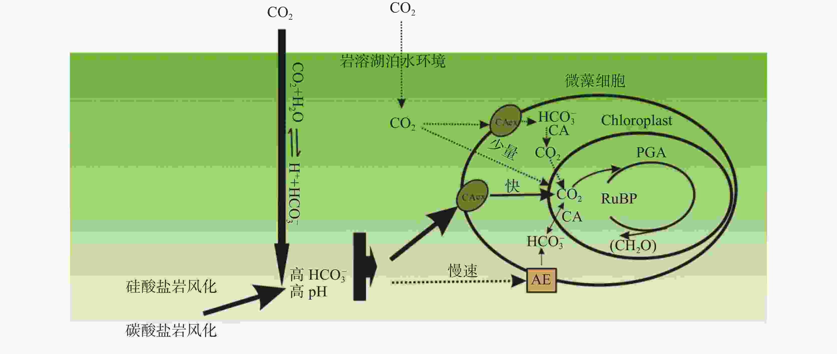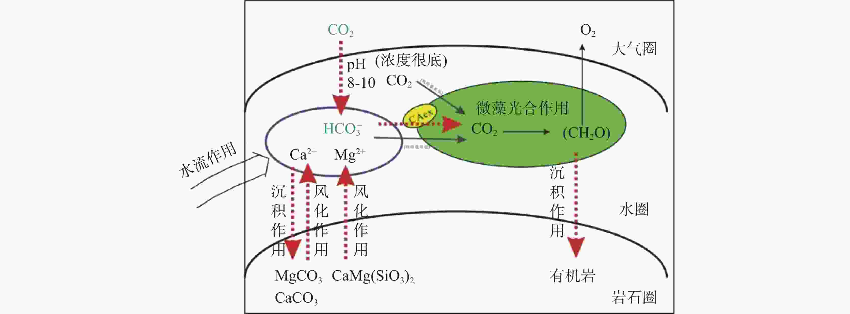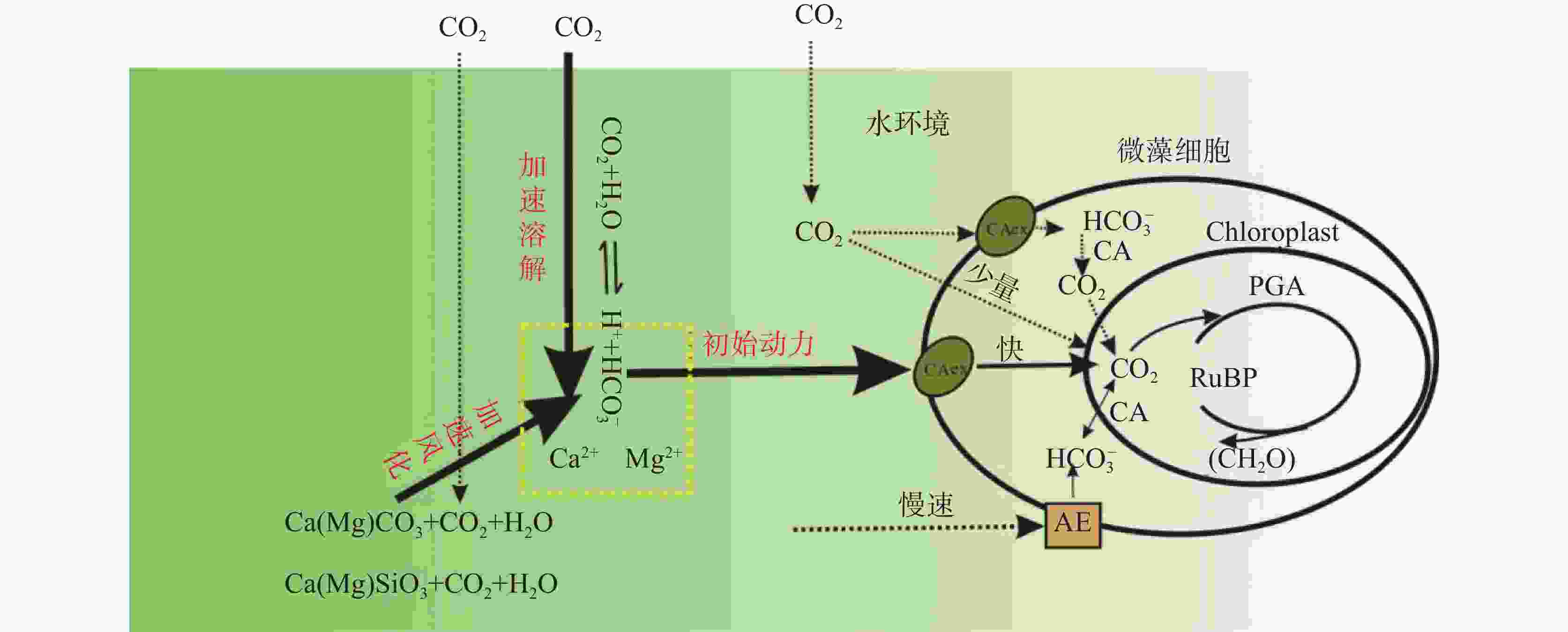 ${\rm{HCO}}_3^{-}$ )实现光合作用,从动力学上加速了岩溶风化过程,促进大气CO2的溶解。(2)岩溶区碳酸盐岩的风化作用,产生${\rm{HCO}}_3^{-}$ ,随后产生等量的阳离子在海洋中进行碳酸盐岩的沉积作用,这仅仅体现的是碳酸盐岩的搬运作用,不能体现碳汇,在长期尺度上仅仅有硅酸盐岩风化产生净碳汇。文章抓住岩石风化产生${\rm{HCO}}_3^{-}$ 与微藻光合作用利用${\rm{HCO}}_3^{-}$ 的耦合点,分析了典型代表性水生生物——微藻在无机碳利用上对岩石风化及碳汇的影响。从微藻光合无机碳利用机制以及光合作用关键性酶-碳酸酐酶(CA)作用两方面,论证了微藻生长对岩石风化及其碳汇的的促进作用;同时论述高pH、高${\rm{HCO}}_3^{-}$ 的风化环境对微藻生长影响。获得以下新认识:(1)微藻通过胞外碳酸酐酶(CAex) 利用了大量${\rm{HCO}}_3^{-}$ ,加速岩石风化,并促使风化朝着形成${\rm{HCO}}_3^{-}$ 的方向进行;(2)微藻加速钙镁硅酸盐岩风化,风化溶出的Ca2+、Mg2+会促使碳酸盐岩的沉积,因此微藻加速硅酸盐岩风化形成净碳汇;(3)长时间尺度下,单纯的碳酸盐岩化学风化并不能直接产生净碳汇,但微藻对${\rm{HCO}}_3^{-}$ 利用使得碳酸盐岩风化朝着${\rm{HCO}}_3^{-}$ 转化方向进行,微藻参与碳酸钙沉积作用的同时转化无机碳为惰性有机碳,产生碳汇。故微藻通过CAex的作用,催化加速${\rm{HCO}}_3^{-}$ 与CO2之间的转化,形成水体${\rm{HCO}}_3^{-}$ 消耗的动力基础,微藻无机碳利用对岩石风化具有促进作用,从而调节大气CO2、浓度变化。基于当前研究,提出三点展望:(1)开展岩溶区区域水体系统的岩石风化、水生生物碳汇评估成为解决当前区域碳收支不平衡问题的关键;(2)查明岩石风化作用中生物作用碳转化机理及转化量,解决单纯的水化学径流法计算岩石风化碳汇精度不够问题;(3)构建光合生物参与下的新的评估方法,评估当前岩石风化在水生生物、水循环作用下的碳汇的时间尺度问题,厘清岩石风化碳汇在碳收支中的贡献。-