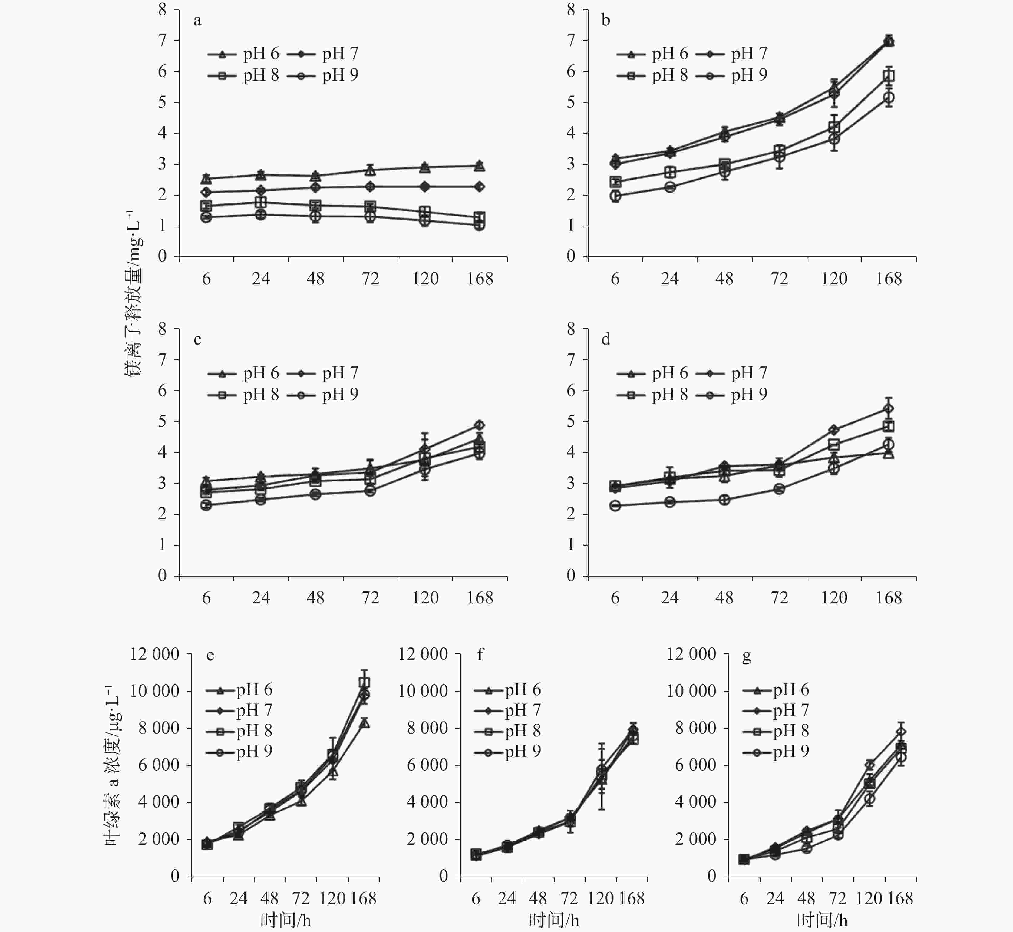 图 5 不同时间下方解石的镁离子释放量(mg·L−1)和叶绿素a的含量(μg·L−1)(a)对照组;(b、e)莱茵衣藻;(c、f)蛋白核小球藻;(d、g)铜绿微囊藻(据Xie Tengxiang等,2017[67])