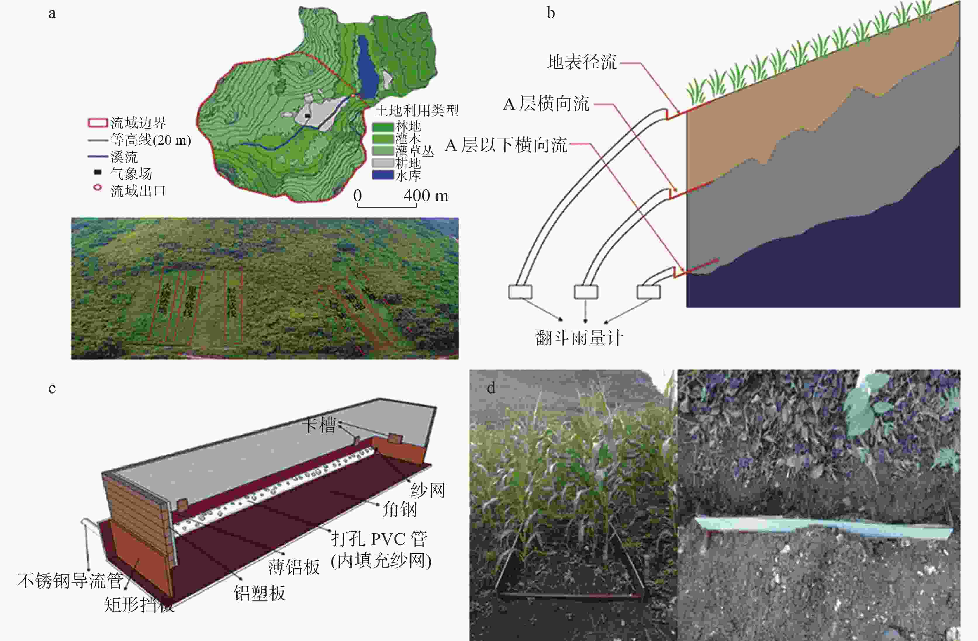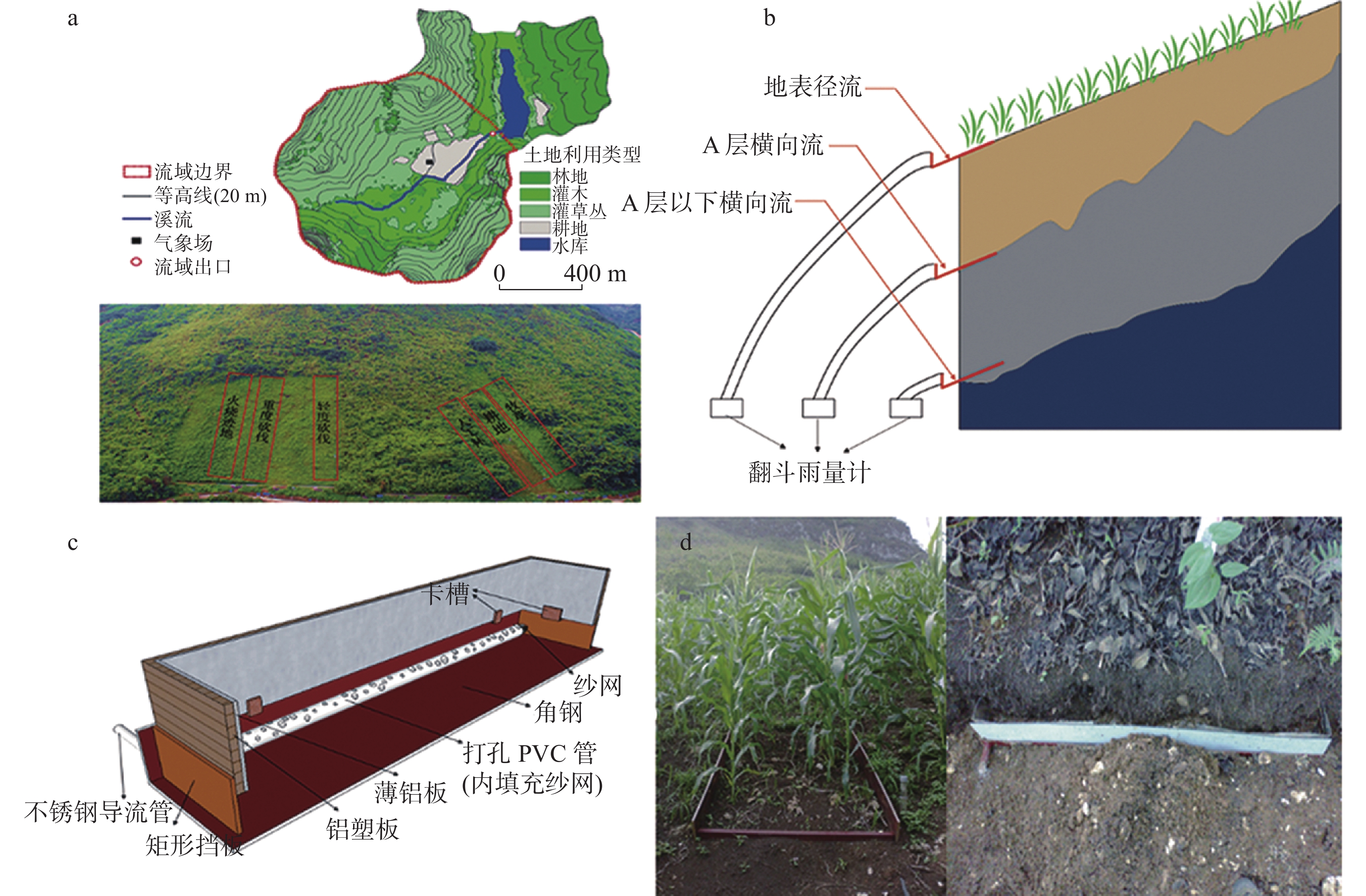 图 1 (a)环江流域以及径流场地形图;(b)土壤剖面图,通过集流槽收集地表、A层、A层以下水流;(c)径流收集装置示意图;(d)微区布设图