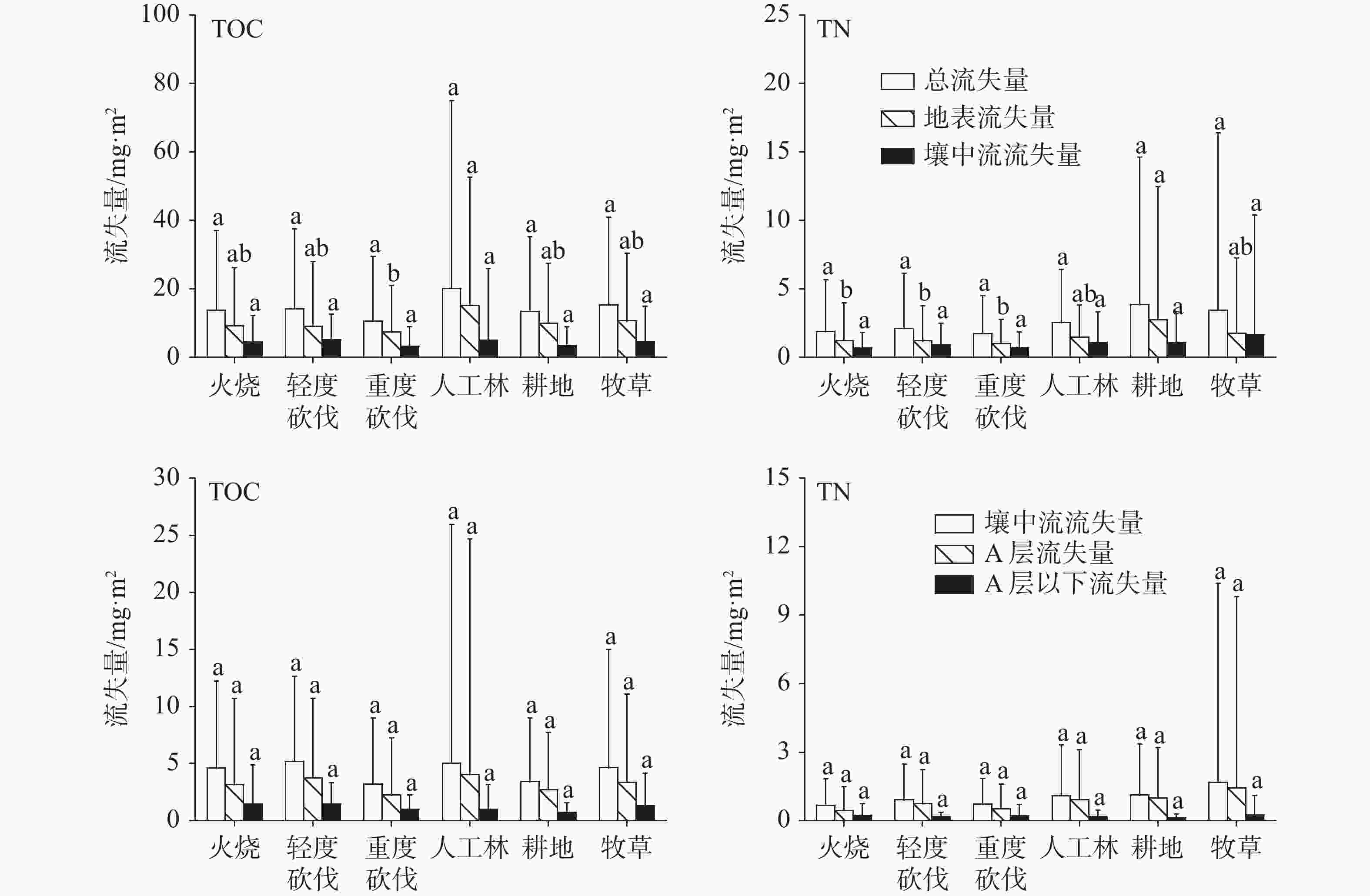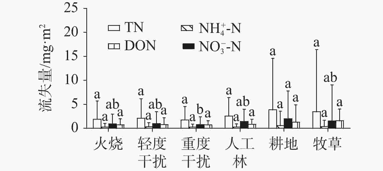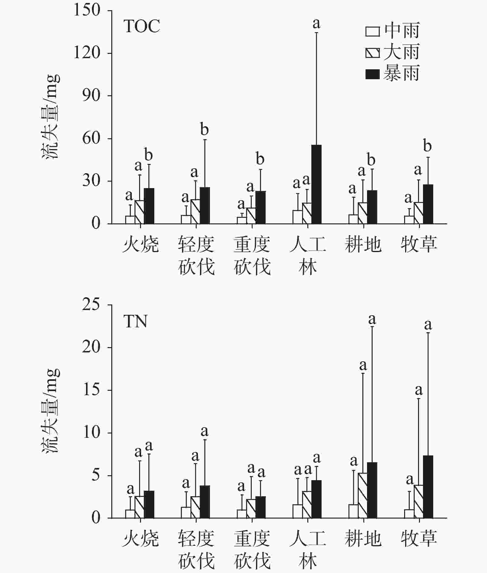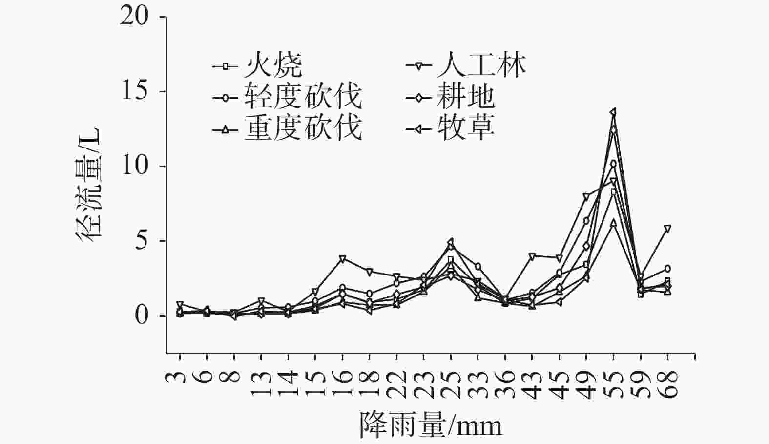 g·cm−3土壤机械组成/% 0.02~2 mm 0.002~0.02 mm <0.002 mm 火烧 50 3.12 30.59 1.32 61.28 18.43 20.29 轻度砍伐 34 1.70 28.43 1.32 65.16 14.16 20.68 重度砍伐 49 1.77 27.26 1.34 62.93 15.82 21.25 人工林 28 2.23 30.00 1.26 48.90 15.81 35.29 耕地 44 2.18 22.27 1.40 64.48 14.47 21.05 牧草 40 1.69 25.37 1.29 70.58 11.07 18.35 表 3 不同土地利用方式土壤TN流失量与流失浓度、产流量、降雨量的关系