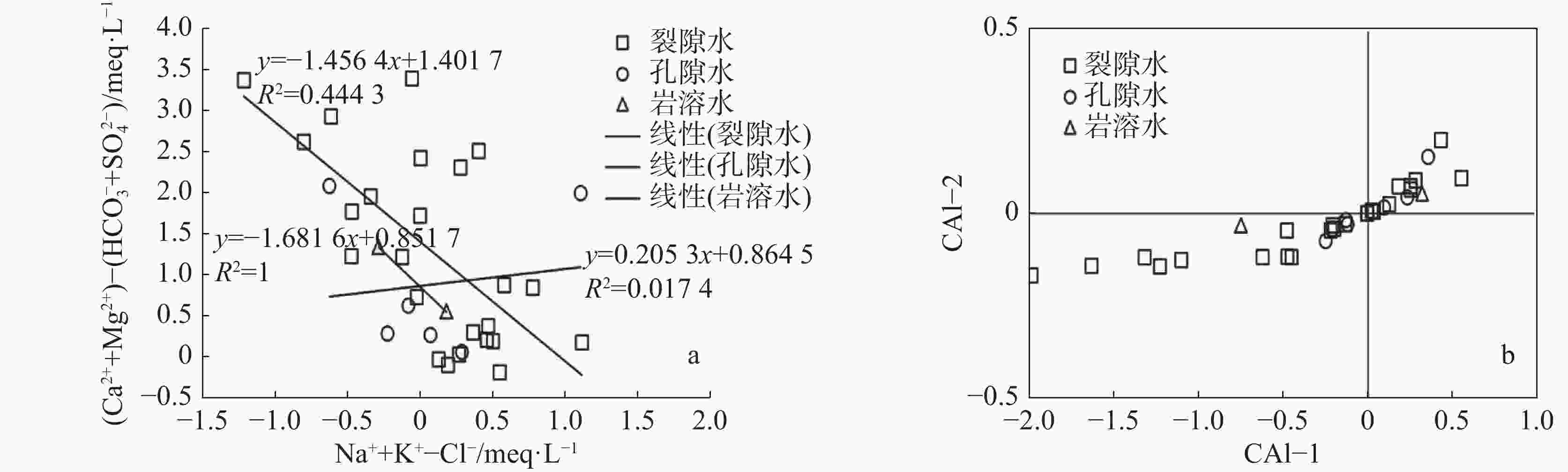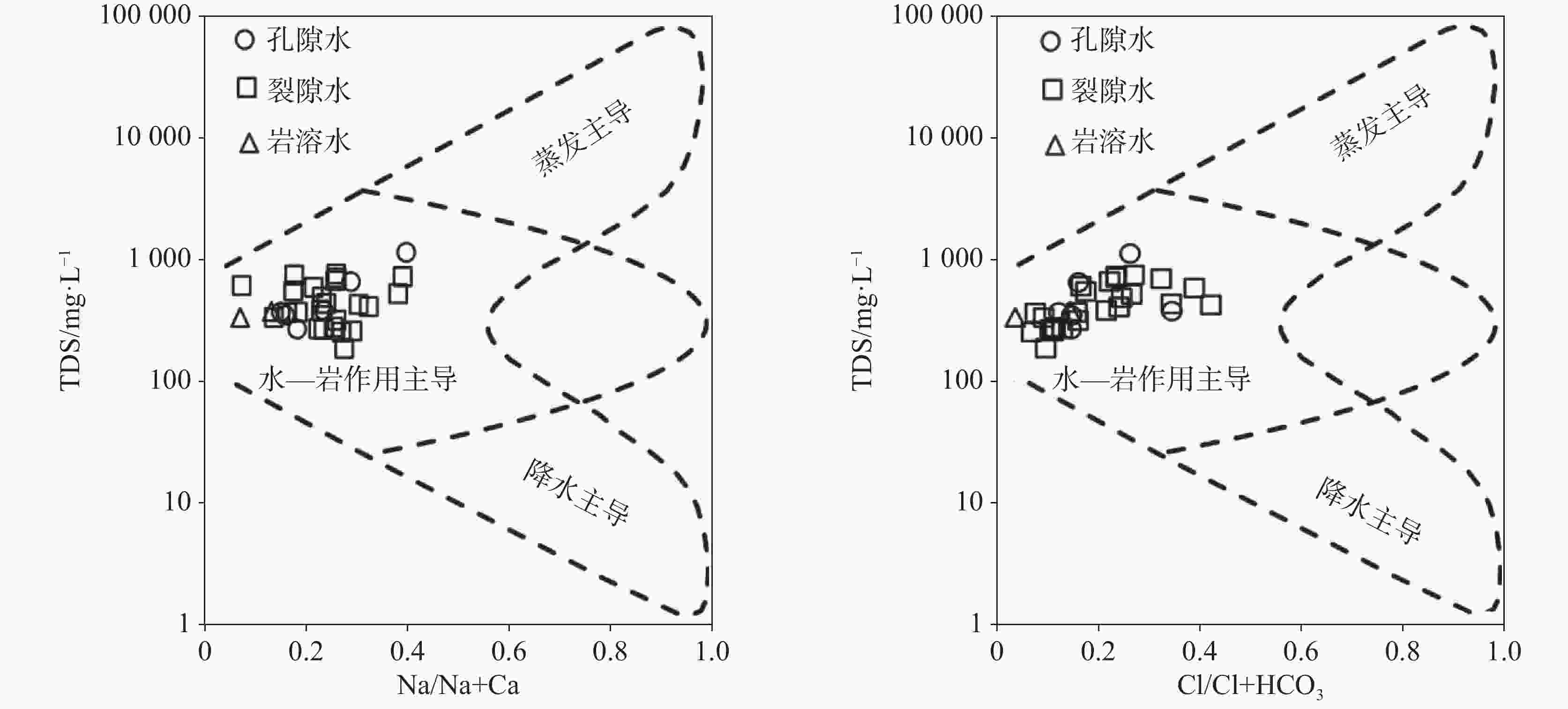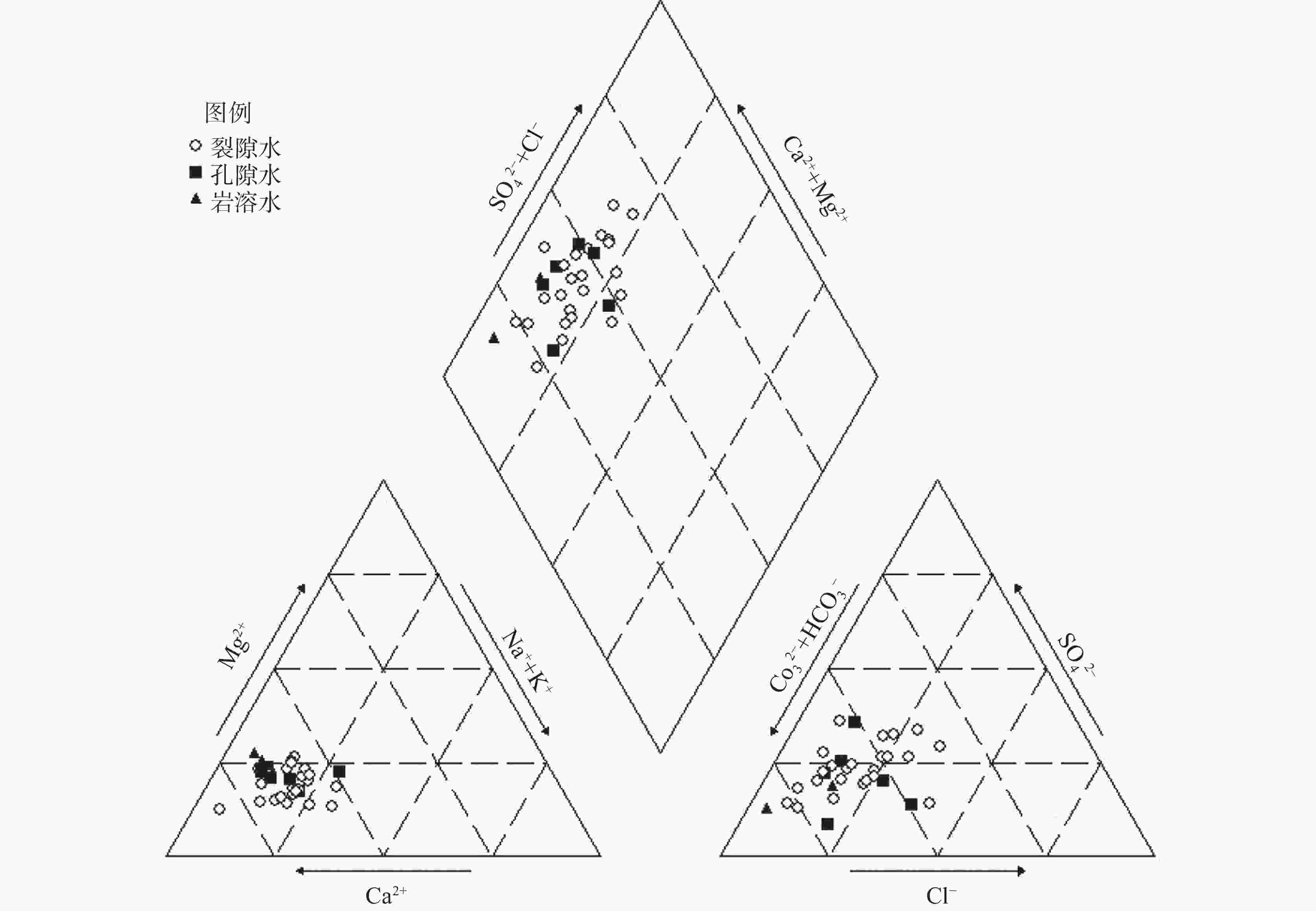 ${\rm{SO}}_4^{2-}$ 、${\rm{HCO}}_3^{-}$ 、${\rm{NO}}_3^{-}$ 、F−、TH和TDS等化学指标,综合利用图解法、相关性分析和主成分分析等方法探讨其地下水的水化学特征和形成机制。结果表明:(1)研究区裂隙水、孔隙水与岩溶水具有相似的水化学特征,裂隙水和孔隙水的水化学类型以HCO3-Ca型为主,而岩溶水水化学类型为HCO3 -Ca · Mg型;(2)孔隙水、裂隙水和岩溶水水化学形成机制主要以水−岩相互作用为主,其次还受到人类活动的影响。孔隙水受水−岩相互作用和人类活动影响的比例分别为77.7%和10.5%,而裂隙水受影响的比例分别为63.9%和11.3%。Abstract:The study area is located in the southwest of Shandong Province, which is a typical water shortage area in Shandong Province, and groundwater is an important water supply source in this area. There are distributed pore groundwater, karst groundwater, and fissure groundwater. The distribution of pore groundwater is small and discontinuous, with poor water-richness. Although the karst aquifer is relatively in good water-richness, its distribution is more limited. The fissure water presents a wide distribution, but its water-richness is extremely poor. In recent years, with the rapid development of economy and the continuous growth of urban population, the demand for groundwater resources is increasing, thus exacerbating the contradiction between supply and demand of water resources, which is bound to seriously restrict the improvement of local people's living standard and economic and social development. Therefore, the study on the hydrochemical characteristics and formation mechanism of groundwater in the water-scarce mountainous area of eastern Zoucheng City can provide a strong theoretical basis for promoting the construction of new rural areas and the implementation of drinking water safety projects. Based on this, 32 samples of different types of groundwater (24 fracture water samples, 6 pore water samples and 2 karst water samples) were collected in this study, and the water chemistry indexes such as K+, Na+, Ca2+, Mg2+, Cl−, ${\rm{SO}}_4^{2-}$ ,${\rm{HCO}}_3^{-}$ ,${\rm{NO}}_3^{-}$ , F−, TH and TDS were measured in the water-scarce mountainous area in eastern Zoucheng city as a typical research area. The water chemistry characteristics and formation mechanism of groundwater in the region were explored in depth by graphical method, correlation analysis and principal component analysis.Results show that the cations of both fracture water and pore water are Ca2+ > Na+ > Mg2+ > K+, while the cations of karst water are Ca2+ > Mg2+ > Na+ > K+, and the anions of all three types of groundwater are ${\rm{HCO}}_3^{-}$ >${\rm{SO}}_4^{2-}$ > Cl− >${\rm{NO}}_3^{-}$ > F−. The water chemistry types of fracture water and pore water are mainly HCO3-Ca type, while the type of karst water is HCO3-Ca-Mg. The water chemistry formation mechanism of pore water, fracture water and karst water is mainly related to water-rock interaction, followed by the human activities. The results of principal component analysis show that water-rock interaction and human activities affect 77.7% and 10.5% of pore water, and 63.9% and 11.3% of fracture water, respectively. -