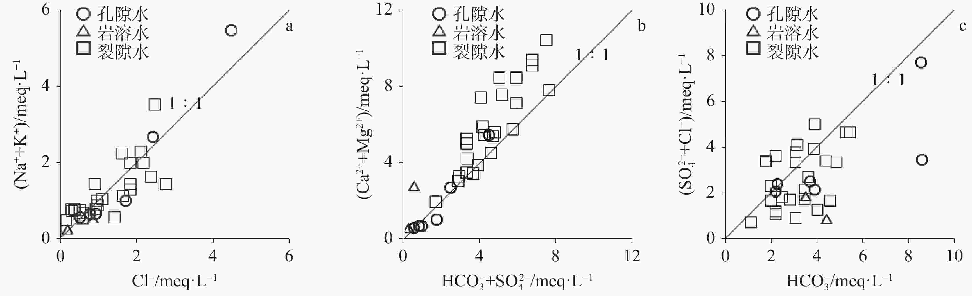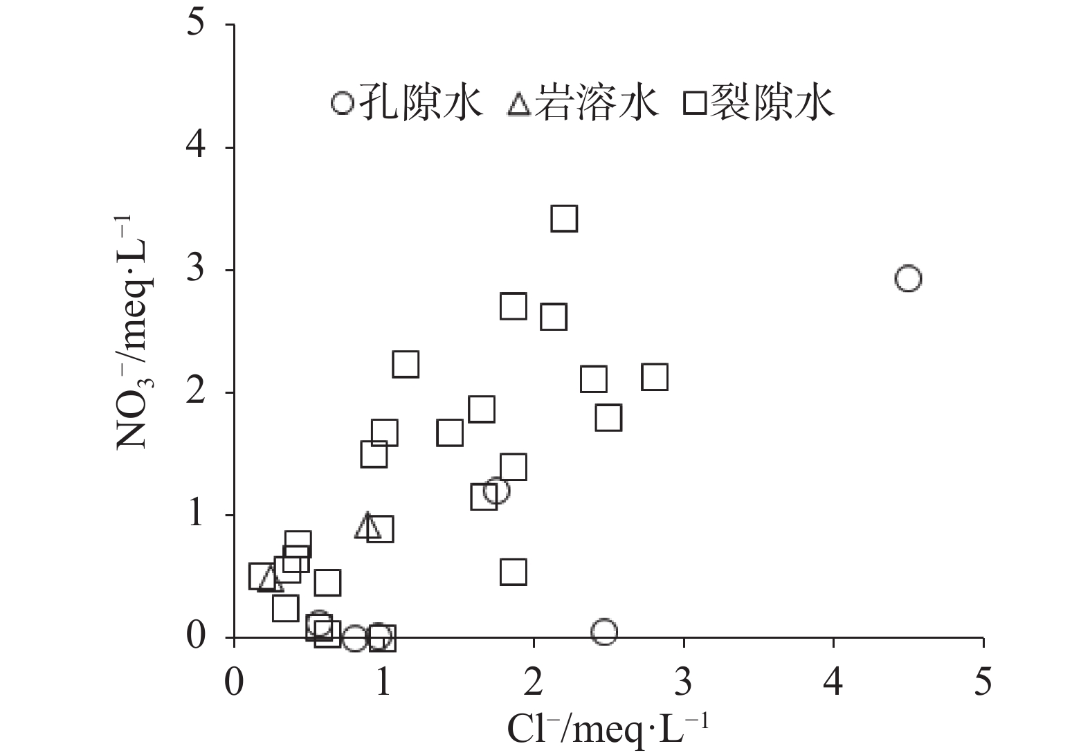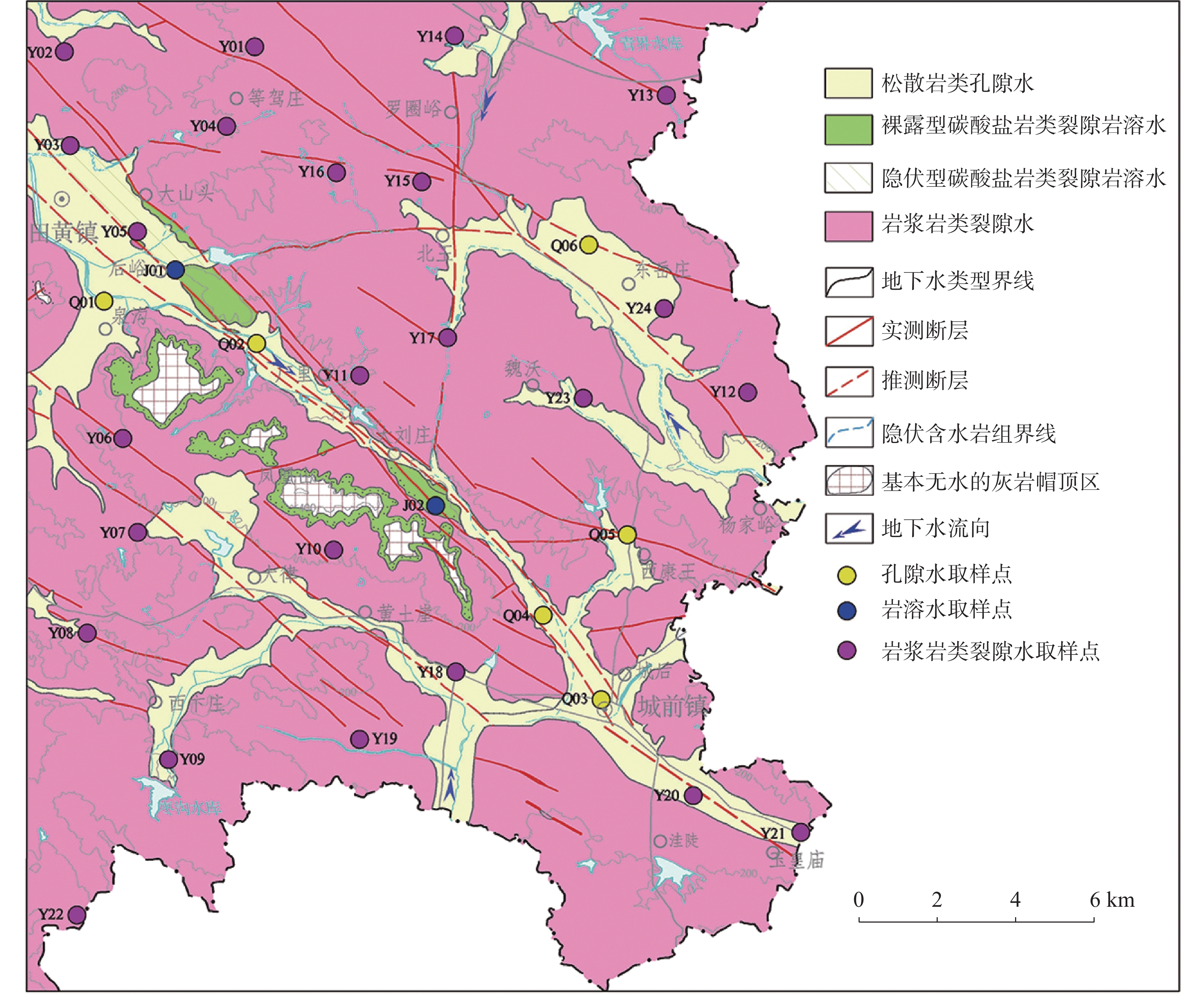 ${\rm{SO}}_4^{2-}$ 、${\rm{HCO}}_3^{-}$ 、${\rm{NO}}_3^{-}$ 、F−、TH和TDS等化学指标,综合利用图解法、相关性分析和主成分分析等方法探讨其地下水的水化学特征和形成机制。结果表明:(1)研究区裂隙水、孔隙水与岩溶水具有相似的水化学特征,裂隙水和孔隙水的水化学类型以HCO3-Ca型为主,而岩溶水水化学类型为HCO3 -Ca · Mg型;(2)孔隙水、裂隙水和岩溶水水化学形成机制主要以水−岩相互作用为主,其次还受到人类活动的影响。孔隙水受水−岩相互作用和人类活动影响的比例分别为77.7%和10.5%,而裂隙水受影响的比例分别为63.9%和11.3%。Abstract:The study area is located in the southwest of Shandong Province, which is a typical water shortage area in Shandong Province, and groundwater is an important water supply source in this area. There are distributed pore groundwater, karst groundwater, and fissure groundwater. The distribution of pore groundwater is small and discontinuous, with poor water-richness. Although the karst aquifer is relatively in good water-richness, its distribution is more limited. The fissure water presents a wide distribution, but its water-richness is extremely poor. In recent years, with the rapid development of economy and the continuous growth of urban population, the demand for groundwater resources is increasing, thus exacerbating the contradiction between supply and demand of water resources, which is bound to seriously restrict the improvement of local people's living standard and economic and social development. Therefore, the study on the hydrochemical characteristics and formation mechanism of groundwater in the water-scarce mountainous area of eastern Zoucheng City can provide a strong theoretical basis for promoting the construction of new rural areas and the implementation of drinking water safety projects. Based on this, 32 samples of different types of groundwater (24 fracture water samples, 6 pore water samples and 2 karst water samples) were collected in this study, and the water chemistry indexes such as K+, Na+, Ca2+, Mg2+, Cl−, ${\rm{SO}}_4^{2-}$ ,${\rm{HCO}}_3^{-}$ ,${\rm{NO}}_3^{-}$ , F−, TH and TDS were measured in the water-scarce mountainous area in eastern Zoucheng city as a typical research area. The water chemistry characteristics and formation mechanism of groundwater in the region were explored in depth by graphical method, correlation analysis and principal component analysis.Results show that the cations of both fracture water and pore water are Ca2+ > Na+ > Mg2+ > K+, while the cations of karst water are Ca2+ > Mg2+ > Na+ > K+, and the anions of all three types of groundwater are ${\rm{HCO}}_3^{-}$ >${\rm{SO}}_4^{2-}$ > Cl− >${\rm{NO}}_3^{-}$ > F−. The water chemistry types of fracture water and pore water are mainly HCO3-Ca type, while the type of karst water is HCO3-Ca-Mg. The water chemistry formation mechanism of pore water, fracture water and karst water is mainly related to water-rock interaction, followed by the human activities. The results of principal component analysis show that water-rock interaction and human activities affect 77.7% and 10.5% of pore water, and 63.9% and 11.3% of fracture water, respectively. -