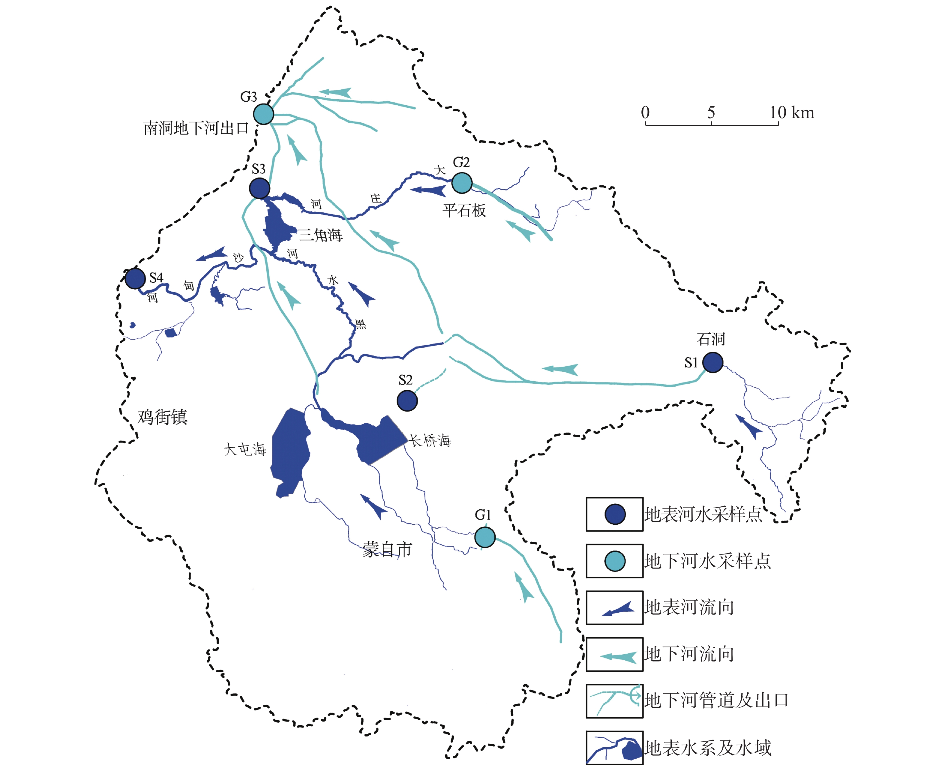 ${\rm{HCO}}_3^{-}$ 为主导型离子。地表河水,常规指标仅NH$_4^{+}$ 含量超过我国相关水质标准限值,金属元素Al、Pb、Mn和As含量超标,旱季超标率总体高于雨季。地下河水的金属元素Al、Pb、Zn、Cr、Mn和As含量超标,雨季超标率总体高于旱季。工矿业活动排放和裸露型岩溶水文地质是导致水体金属元素含量超标的重要原因。据水质评价结果,区内水质整体较好,旱季和雨季水质处于良好及以上级别分别占比89.29%和85.71%。灌溉适用性评价结果显示,区内水体灌溉适用性整体较好,仅在旱季地表河水As含量(54.70 μg·L−1)高于农田灌溉水质标准中蔬菜和水作标准限值,不适合周边蔬菜和稻田的灌溉。Abstract: The karst surface water and groundwater of Nandong underground river basin are vital water sources for agricultural and industrial production, and lives of residents in Honghe Hani and Yi Autonomous Prefecture in Yunnan, Southwest China. With a growing public awareness of water environment and water safety, the evaluation of karst water quality and irrigation applicability especially in agricultural regions is becoming increasingly necessary. In this study, 32 samples of karst surface river water and 24 samples of underground river water were collected from Nandong underground river basin during dry and rainy seasons. 11 inorganic regular ions (i.e., K+, Na+, Ca2+, Mg2+, Cl−,${\rm{SO}}_4^{2-}$ ,${\rm{HCO}}_3^{-}$ ,${\rm{NO}}_3^{-}$ , NO$_2^{−}$ , NH$_4^{+}$ , and F−) and 9 heavy metals (i.e., Al, Cu, Pb, Zn, Cr, Cd, Ni, Mn, and As) were analyzed in these samples to investigate the water quality and irrigation applicability. Based on the measured concentrations of the hydrochemical composition, the Nemerow composite index in combination with the four irrigation assessment systems of sodium concentration (SC), sodium adsorption ratio (SAR), residual sodium carbonate (RSC), and permeability index (PI) were applied to evaluate the karst water quality and irrigation applicability, respectively. Results show that Ca2+ and${\rm{HCO}}_3^{-}$ were identified as the major ions in both karst surface water and karst groundwater, indicating weakly alkaline karst water in the study area. For karst surface water, among the 11 inorganic regular ions, only NH$_4^{+}$ was found exceeding the maximum acceptable level for drinking water recommended by General Administration of Quality Supervision, Inspection and Quarantine of the People's Republic of China. Meanwhile, among the 9 heavy metals, the concentrations of Al, Pb, Mn, and As were evaluated as exceeding the maximum acceptable level. Moreover, the rates of measured ions exceeding permitted levels in the dry season were generally higher than those in the rainy season. For karst groundwater, the concentrations of Al, Pb, Zn, Cr, Mn, and As exceeded the maximum acceptable levels, and the rates of these metals exceeding permitted levels in the rainy season were generally higher than those in dry season. The nitrogen synthetic fertilizers might be a main cause of the increase of NH$_4^{+}$ concentration in karst surface water. High concentration of Al, Mn, and Cd in karst water were mainly caused by large amounts of discharge from metal smelting, waste residue of mining, and open-pit mining. Furthermore, an exposed surface environment of bedrock in some parts of this study area might be responsible for these components exceeding the permitted levels due to the lack of surface decontamination of pollutants. The karst water quality belonging to the good grade or above accounted for 89.29% and 85.71% of the total water samples collected during the dry season and the rainy season, respectively, and the quality belonging to poor grade or below accounted for 7.14% and 14.29%, respectively. Hence, the karst water quality in Nandong underground river basin was generally high based on the results of the assessment of karst water quality. However, some cases of poor-quality karst water were found in parts of our study area (e.g., G1 and S4 sampling sites in the dry season and G1, G2, and G3 sampling sites in the rainy season), accompanied by the seasonal differences in karst water pollution. According to the permitted level for irrigation water and the results of SC, SAR, RSC, and PI assessments, most of the karst water in Nandong underground river basin was generally suitable for irrigation. However, it is noted that the concentration of As (54.70 μg·L−1) in the sampling site of surface water (i.e., S3) exceeded the permitted level for the irrigation of vegetables and water crops in the dry season, thereby being no longer suitable for irrigation. Our results suggest that the high concentrations of metal compositions (e.g., Al, Pb, Mn, and As) should be controlled by some targeted measures to prevent further metal pollution in karst water of Nandong underground river basin. Our study also provides an integrated method for the comprehensive understanding of water quality in karst surface water and groundwater. -