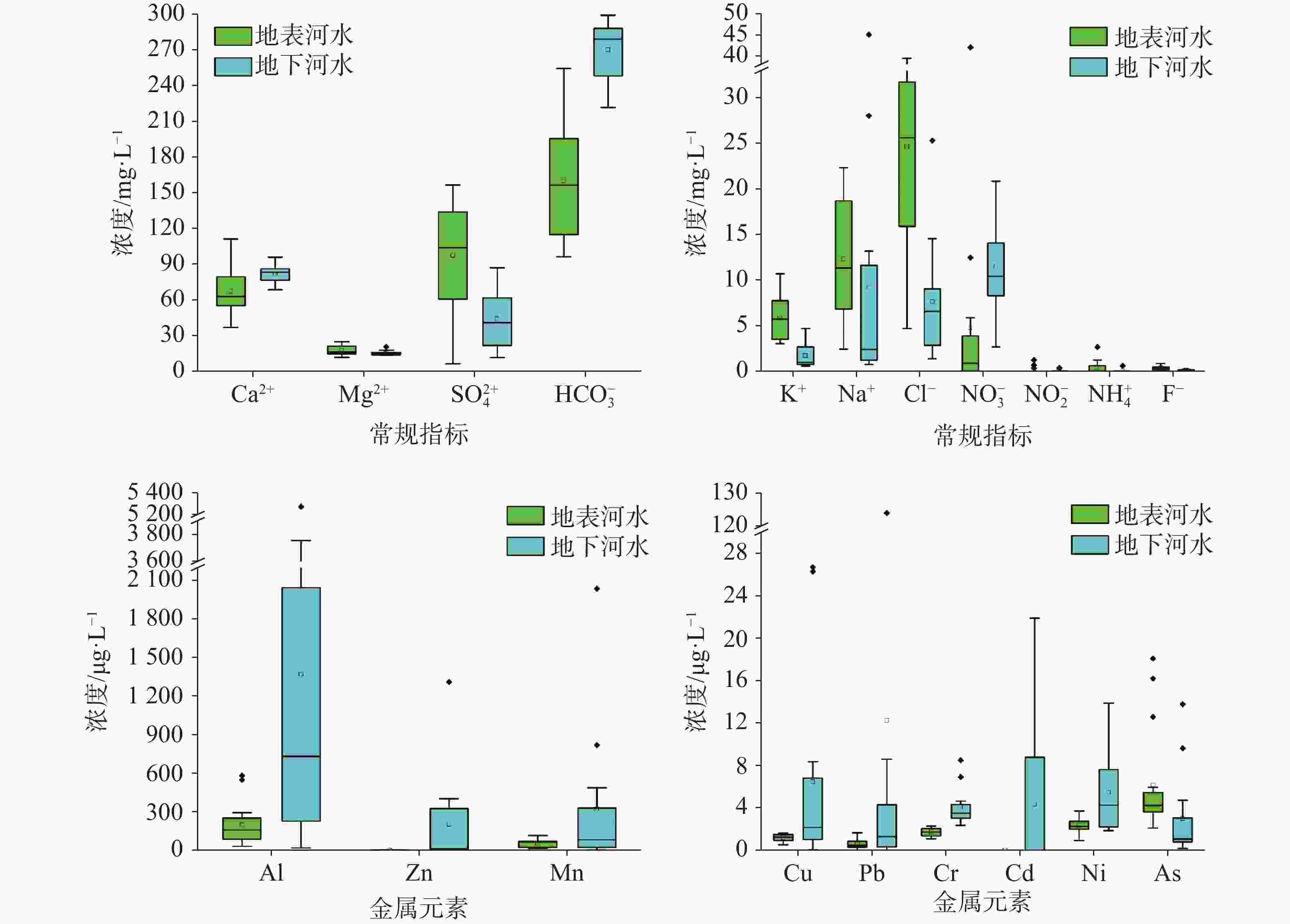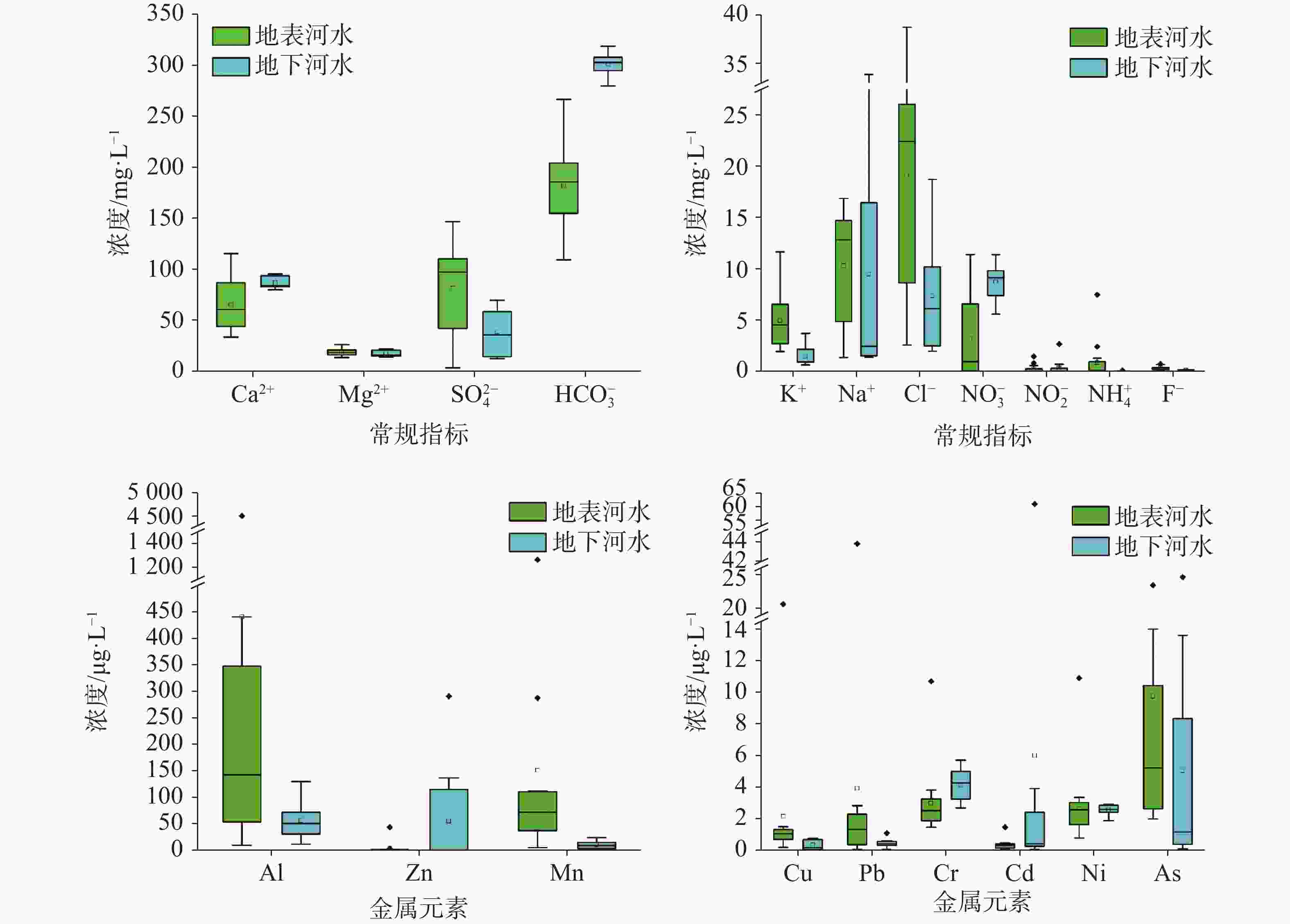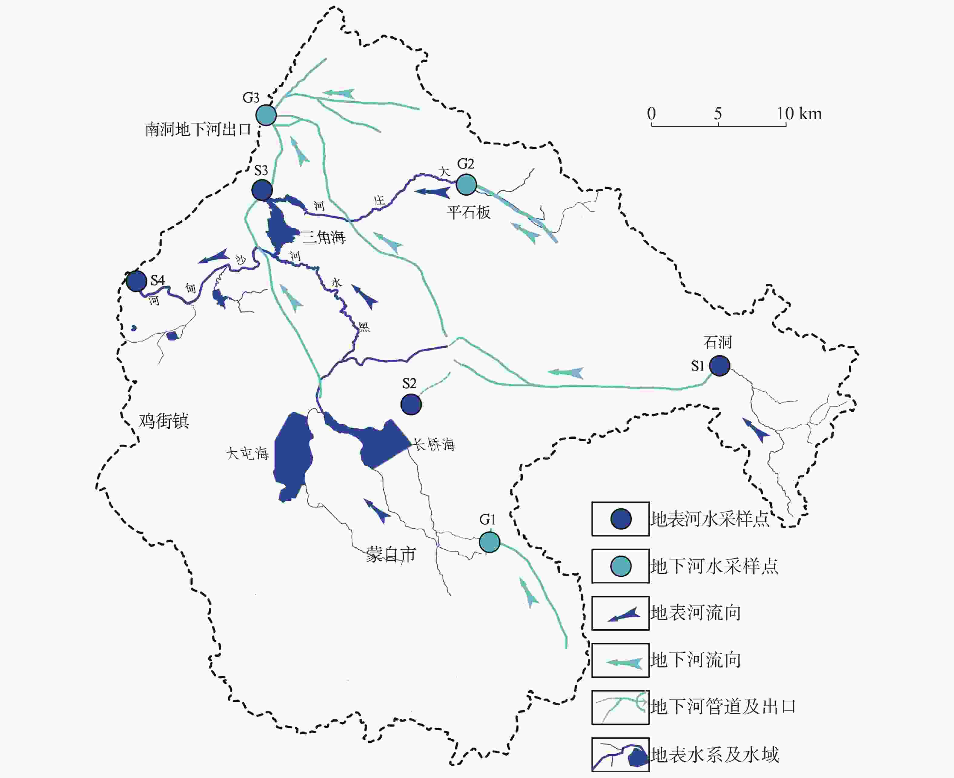 时期 统计量 pH K+ Na+ Ca2+ Mg2+ Cl− ${\rm{SO}}_4^{2-}$ ${\rm{HCO}}_3^{-}$ ${\rm{NO}}_3^{-}$ NO$_2^{−}$ NH$_4^{+}$ F− 地表河水 旱季 最大值 7.78 11.64 16.86 115.70 26.56 38.72 146.92 266.74 11.39 1.45 7.46 0.71 最小值 7.07 1.94 1.36 33.86 13.74 2.58 3.74 109.52 nd nd nd 0.04 平均值 7.41 4.92 10.31 65.25 19.22 19.10 82.02 181.62 3.21 0.21 0.85 0.32 标准差 0.20 2.66 5.60 25.68 3.57 11.03 49.12 44.89 3.76 0.52 2.27 0.19 变异系数 0.03 0.54 0.54 0.39 0.19 0.58 0.60 0.25 1.17 2.52 2.65 0.61 雨季 最大值 7.44 10.71 22.35 111.40 24.92 39.46 156.61 254.66 42.06 1.24 2.66 0.86 最小值 6.84 3.04 2.44 36.98 11.87 4.70 6.39 96.41 nd nd nd 0.09 平均值 7.23 5.87 12.32 67.36 17.66 24.65 97.38 160.00 4.75 0.14 0.41 0.37 标准差 0.16 2.53 6.33 22.27 4.29 10.64 51.27 47.85 12.61 0.48 0.87 0.22 变异系数 0.02 0.43 0.51 0.33 0.24 0.43 0.53 0.30 2.65 3.34 2.13 0.58 地下河水 旱季 最大值 7.96 3.7 33.87 95.59 22.10 18.69 69.88 318.78 11.38 2.66 nd 0.17 最小值 7.15 0.63 1.37 80.18 14.47 1.96 12.56 279.75 5.58 0.002 nd 0.04 平均值 7.42 1.43 9.46 86.82 17.53 7.33 38.83 301.16 8.74 0.34 / 0.09 标准差 0.22 0.93 12.04 5.95 2.92 5.41 22.31 11.02 1.72 0.76 / 0.04 变异系数 0.03 0.65 1.27 0.07 0.17 0.74 0.57 0.04 0.20 2.27 / 0.47 雨季 最大值 7.59 4.71 45.10 96.00 20.62 25.34 87.10 299.27 20.87 0.37 0.60 0.23 最小值 7.25 0.57 0.76 68.71 13.78 1.38 11.68 221.92 2.68 nd nd nd 平均值 7.40 1.69 9.21 82.00 15.44 7.62 44.14 270.05 11.49 0.03 0.05 0.11 标准差 0.12 1.35 13.86 8.15 2.02 6.79 25.71 27.54 5.51 0.16 0.33 0.06 变异系数 0.02 0.80 1.51 0.10 0.13 0.89 0.58 0.10 0.48 4.63 6.28 0.51 水质标准 地表水(Ⅲ) 6~9 — — — — 250 250 — 44.29 — 1.29 1.0 地下水(Ⅲ) 6.5~8.5 — 200 — — 250 250 — 88.57 3.29 0.64 1.0 生活饮用水 6.5~8.5 — 200 — — 250 250 — 44.29 — 0.64 1.0 注:nd表示未检出,“/”表示无计算值,“—”表示无相应参考标准值,黑体字表示此浓度超标。 表 4 南洞地下河流域水体中金属浓度统计/μg·L−1