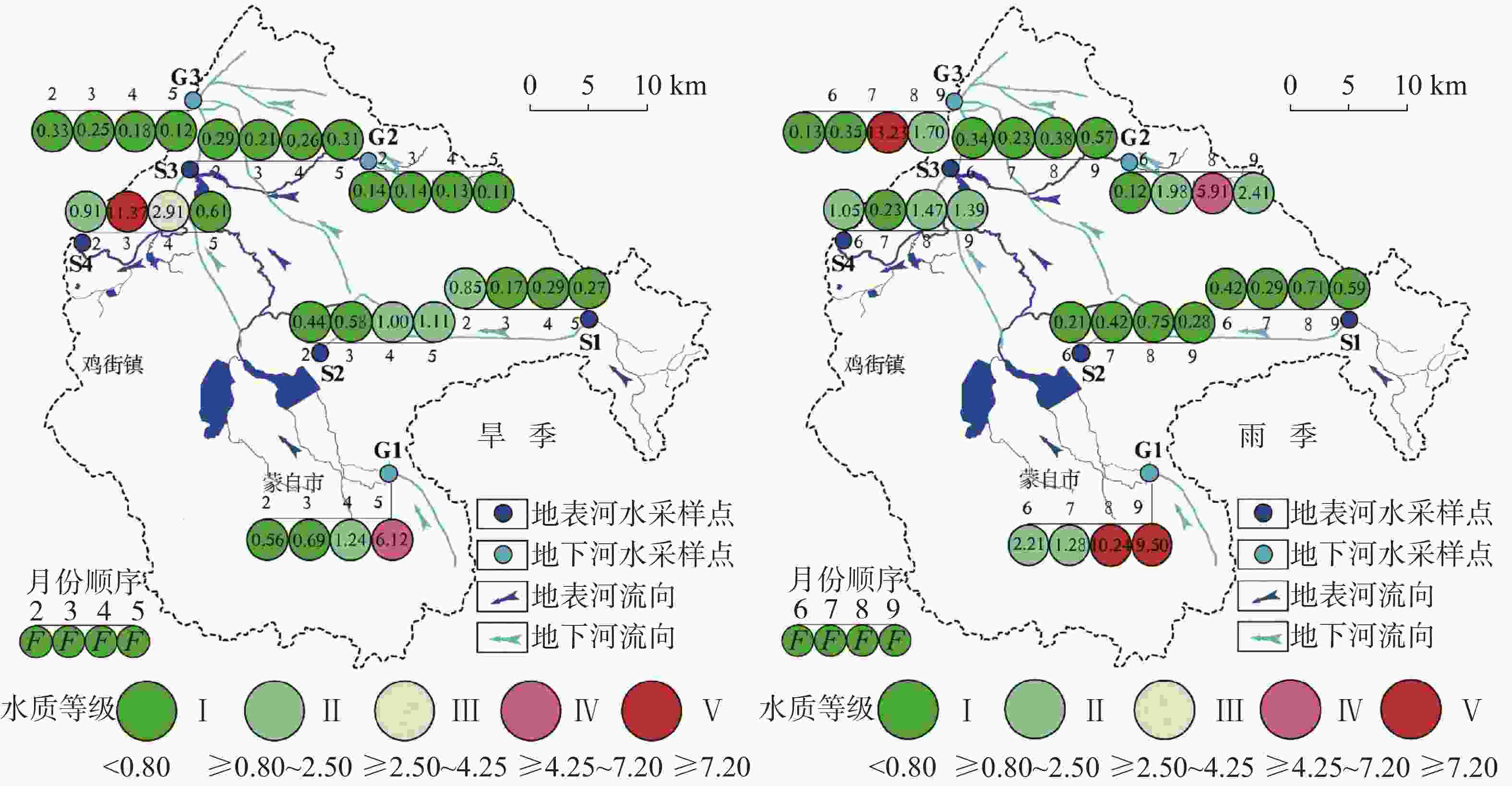 指标 常规指标/mg·L−1 金属元素/μg·L−1 pH Cl− F− Cu Pb Zn Cr Cd As 地表河水 旱季 最大值 7.78 38.72 0.71 20.60 43.80 43.90 10.70 1.46 54.70 最小值 7.07 2.58 0.04 0.17 nd nd 1.45 nd 1.98 平均值 7.41 19.10 0.32 2.16 3.91 3.35 2.97 0.33 9.73 雨季 最大值 7.44 39.46 0.86 1.66 1.67 6.06 2.32 nd 18.10 最小值 6.84 4.70 0.09 0.55 nd nd 1.10 nd 2.12 平均值 7.23 24.65 0.37 1.20 0.63 1.66 1.72 / 6.18 地下河水 旱季 最大值 7.96 18.69 0.17 0.75 1.08 291.00 5.70 61.00 24.60 最小值 7.15 1.96 0.04 nd nd nd 2.68 nd 0.09 平均值 7.42 7.33 0.09 0.32 0.42 54.83 4.12 5.99 5.03 雨季 最大值 7.59 25.34 0.23 26.70 124.00 1 311.00 8.51 21.90 13.80 最小值 7.25 1.38 nd nd nd nd 2.38 nd 0.20 平均值 7.40 7.62 0.11 6.49 12.26 203.11 4.13 4.34 3.02 农田灌溉