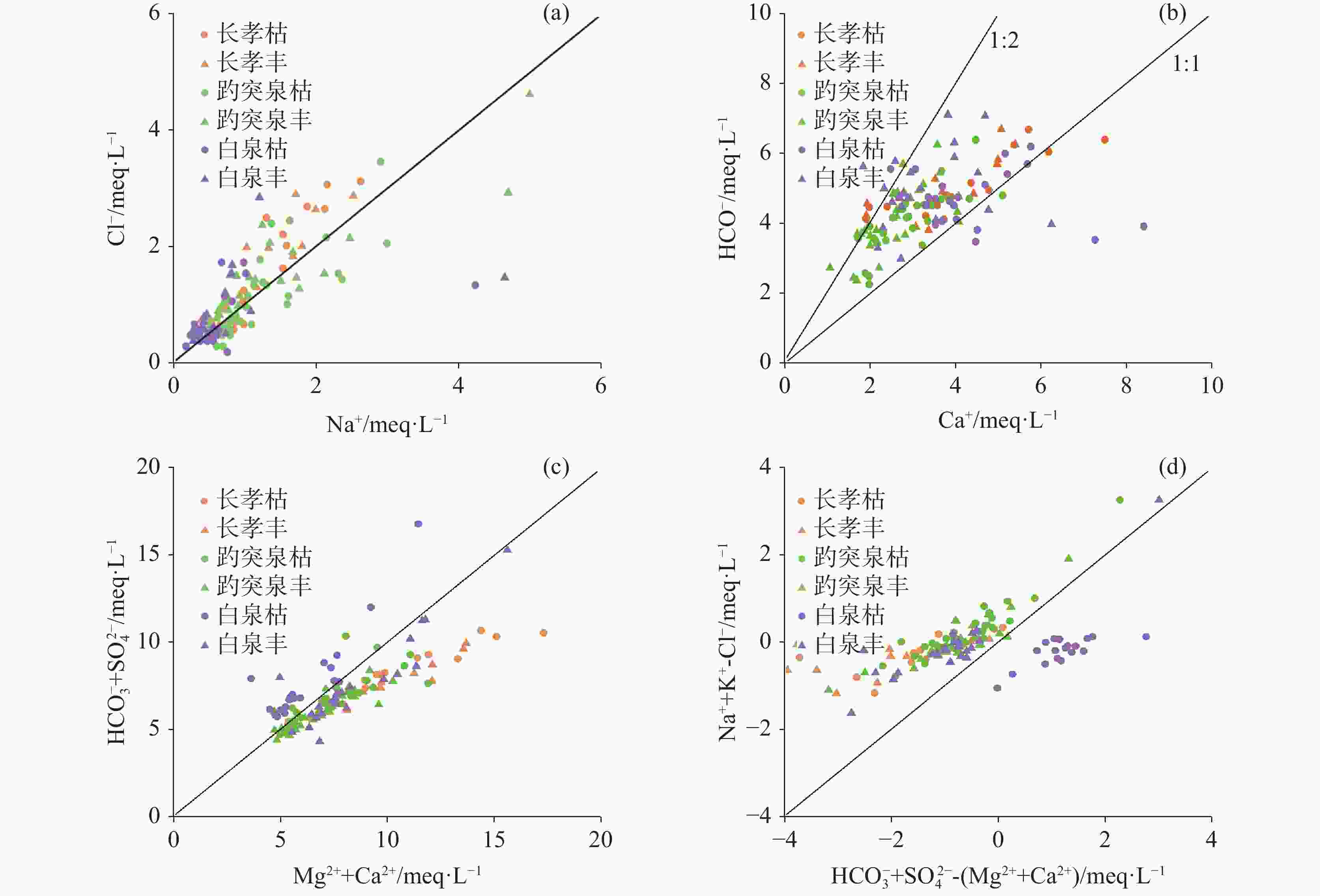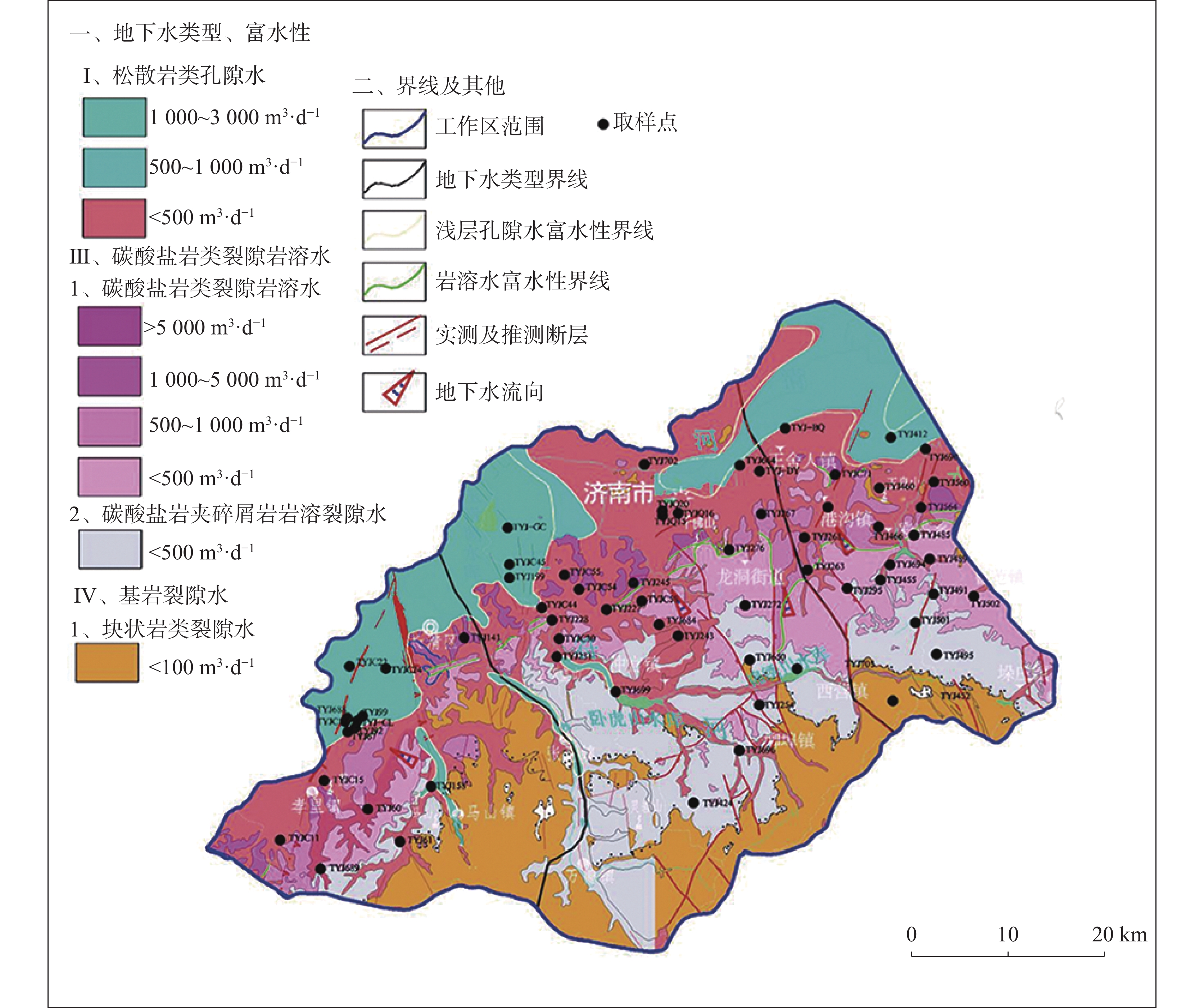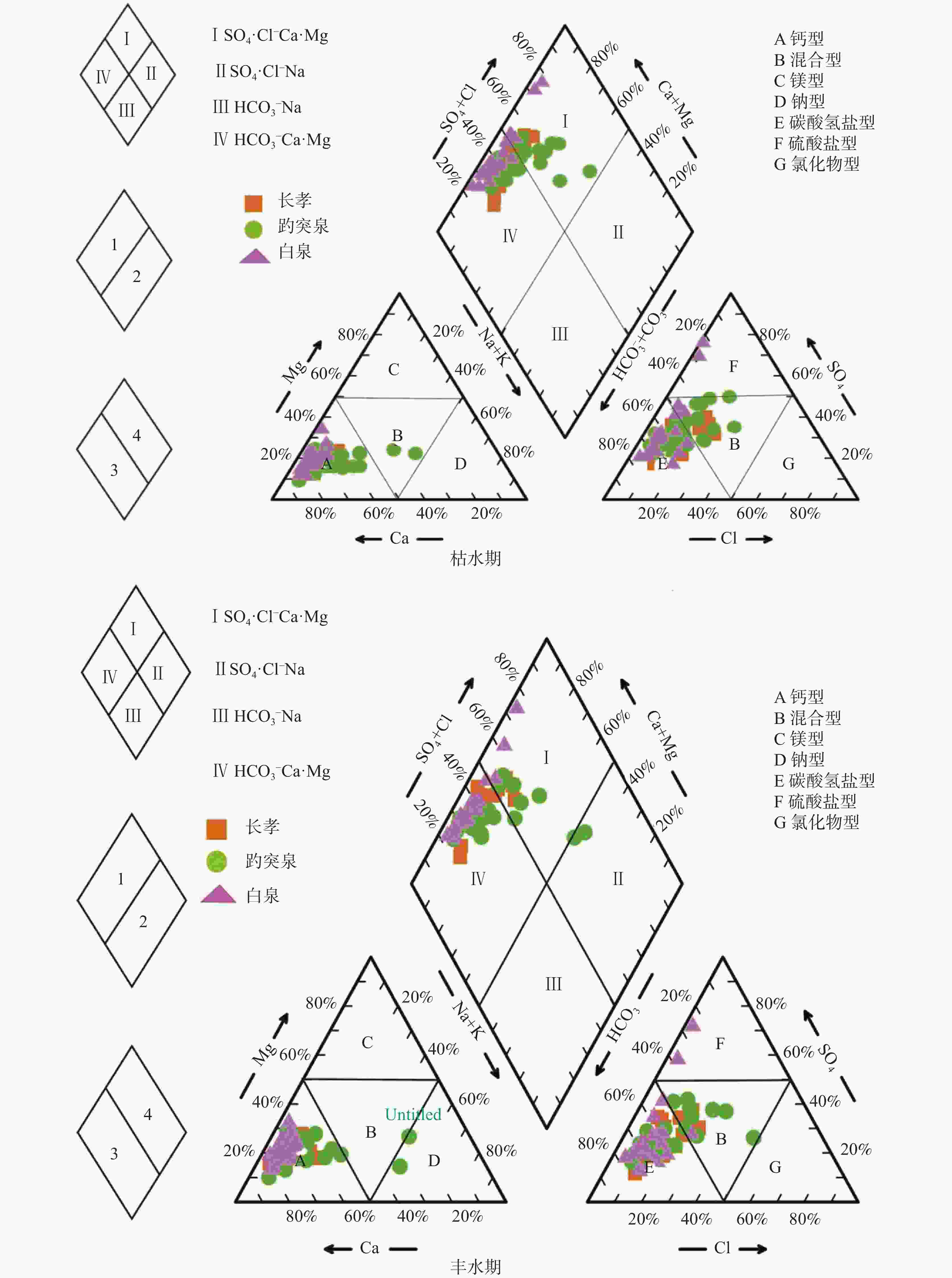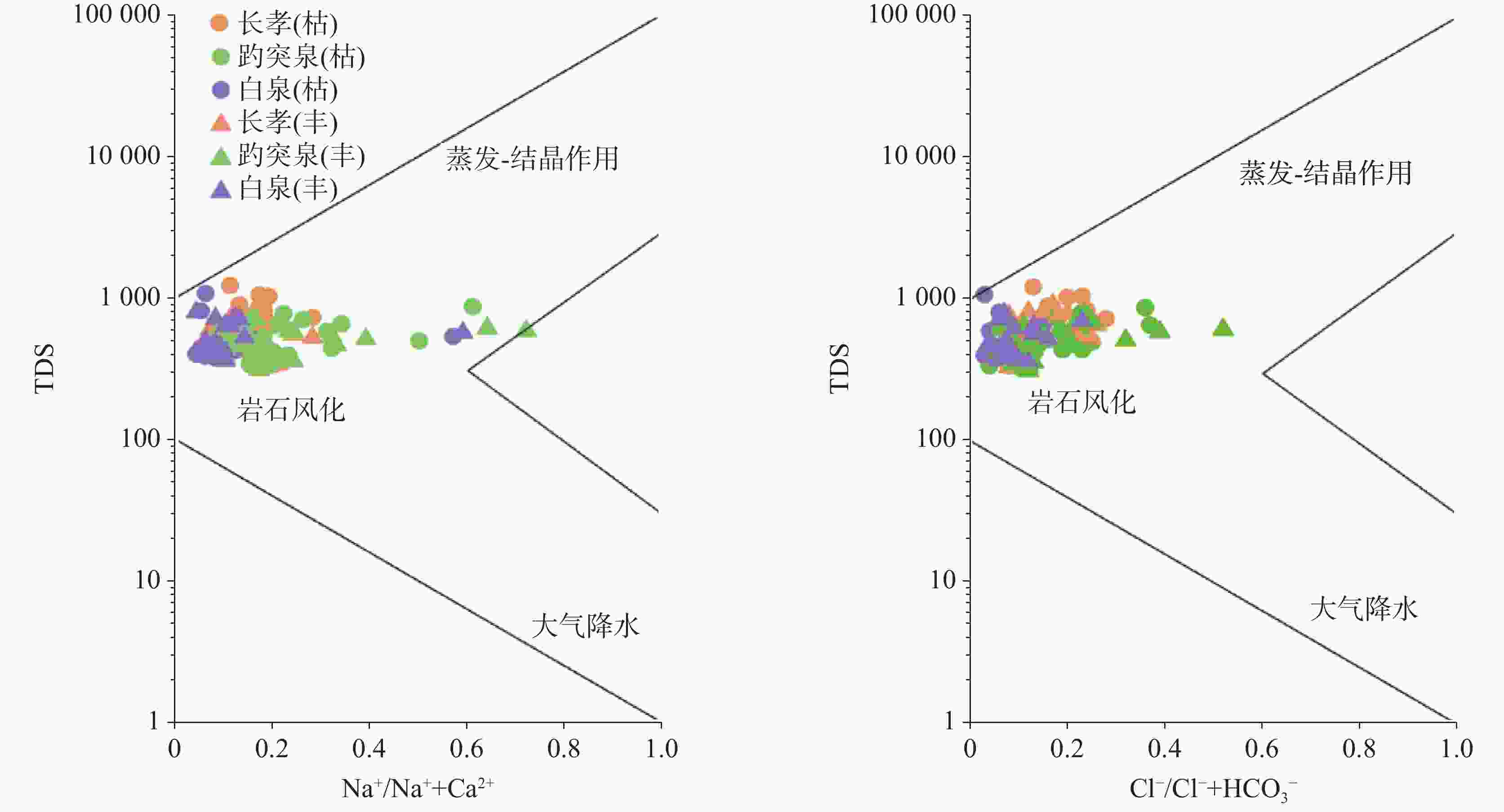 ${\rm{HCO}}_3^{-}$ >${\rm{SO}}_4^{2-}$ >Cl−>${\rm{NO}}_3^{-}$ ,Ca2+>Na+>Mg2+>K+。模糊评价的结果显示,三个岩溶水系统地下水总体水质良好,可用作生活饮用水,且长孝、趵突泉及白泉的岩溶水水化学类型大致相同,离子来源相似,故水力联系较强。Abstract:Karst groundwater is an important source recharge for springs in Jinan, and its water quality directly affects the effectiveness of spring protection work in this city. In this study, a total of 128 groundwater samples (64 each in the wet season and the dry season) were collected from the main karst hydrogeological units in Jinan—Changxiao karst water system, Baotu Spring karst water system and Baiquan karst water system in May (the dry season) and September (the wet season), and their water quality was tested. By means of mathematical statistics, correlation analysis, Piper three-line diagram, Gibbs model and ion ratio, the hydrochemical characteristics of groundwater in the study area were analyzed. Besides, the groundwater quality in this area was evaluated comprehensively by fuzzy evaluation method. The analysis may provide a basis for the hydraulic connection of the three karst water systems. Results show that groundwater in the three karst water systems of Changxiao, Baotu Spring and Baiquan are all weakly alkaline water with low hardness, and TDS values are less than 1,000 mg·L−1, among which TDS value and TH value show as Changxiao>Baiquan>Baotu Springs. The ion concentrations are as follows: Ca2+>Na+>Mg2+>K+, ${\rm{HCO}}_3^{-}$ >${\rm{SO}}_4^{2-}$ >Cl −>${\rm{NO}}_3^{-}$ . The water quality of the three karst water systems is worse in the dry season than in the wet season. The chemical types of water in Changxiao, Baotu and Baiquan are roughly the same, mainly calcium type and bicarbonate-mixed water. The Changxiao karst water system and Baotu Spring karst water system are mainly of SO4·Cl-Ca·Mg type, and the Baiquan karst water system is mainly of HCO3-Ca·Mg type. According to the piper three-line diagram and the Gibbs diagram, the main groundwater ions in the three karst water systems of Changxiao, Baotu Spring and Baiquan mainly come from rock weathering. It can be seen from the ion ratio diagram that the main hydrochemical effects in the study area are from the weathering and dissolution of carbonate rocks and evaporite salts and cation exchange. More than 50% of the water in the three karst water systems falls into Grade III in both the dry season and the wet season, indicating that the karst groundwater in the study area is less polluted. Compared with the water collected from sample points in two seasons, the water quality in the wet season is better than that in the dry season. The Baotu Spring karst water system has the best water quality, followed by the Baiquan karst water system.In this study, suggestions on the environmental protection of karst water resources are put forward: (1) The government should standardize the management of industrial water use, implement a quota system, and avoid unreasonable use of water resources. (2) Transporting sewage channels, pipelines and oil pipelines through protection area of water source should be prohibited. (3) The construction of oil depots in protection areas should be prohibited. (4) The government and institution should gradually improve the irrigation system in agriculture, and actively introduce new technologies and techniques to save water. (5) The government and related institutions should heighten citizens' awareness of water conservation and water resources protection, and promote standardized water resources management. -