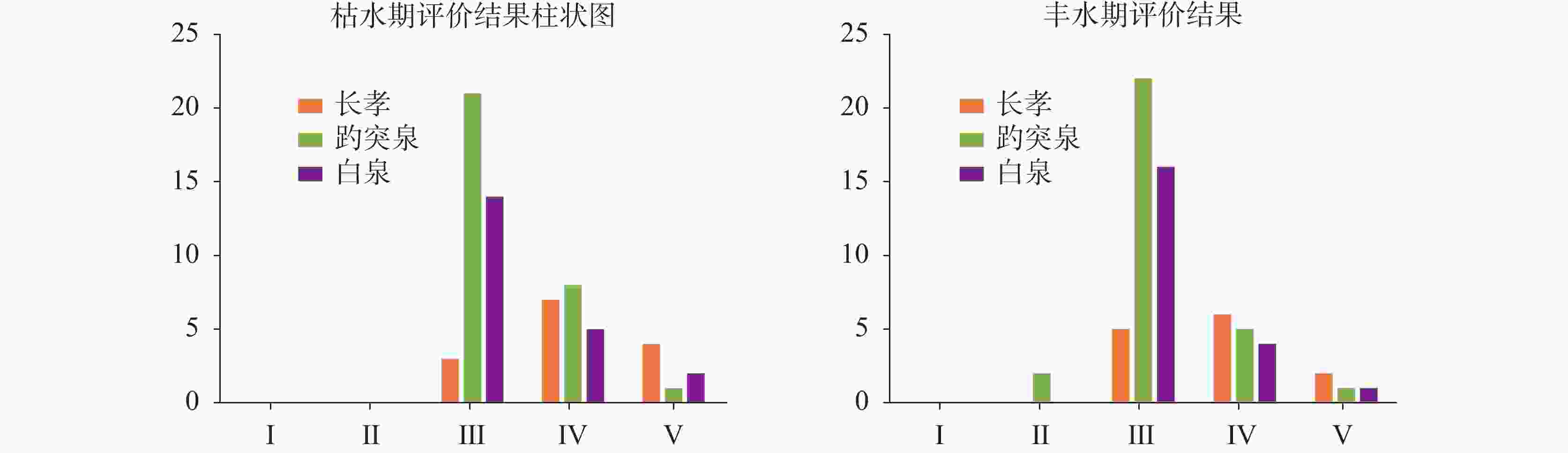 枯水期 Ⅰ Ⅱ Ⅲ Ⅳ Ⅴ 结果 丰水期 Ⅰ Ⅱ Ⅲ Ⅳ Ⅴ 结果 长孝 TYJC11 0.02 0.05 0.26 0.39 0.00 Ⅳ TYJC11 0.02 0.12 0.24 0.55 0.00 Ⅳ TYJC18 0.01 0.03 0.04 0.11 0.79 Ⅴ TYJC18 0.01 0.06 0.07 0.14 0.44 Ⅴ TYJ99 0.02 0.07 0.34 0.48 0.00 Ⅳ TYJ99 0.02 0.08 0.36 0.50 0.00 Ⅳ TYJ67 0.01 0.04 0.08 0.16 0.70 Ⅴ TYJ67 0.01 0.04 0.15 0.07 0.72 Ⅴ TYJ92 0.06 0.46 0.48 0.00 0.00 Ⅲ TYJ92 0.07 0.35 0.59 0.00 0.00 Ⅲ TYJC22 0.02 0.05 0.14 0.46 0.18 Ⅳ TYJC22 0.02 0.05 0.23 0.44 0.20 Ⅳ TYJ688 0.03 0.02 0.23 0.59 0.17 Ⅳ TYJ688 0.02 0.03 0.21 0.58 0.19 Ⅳ TYJ689 0.07 0.44 0.50 0.00 0.00 Ⅲ TYJ689 0.07 0.19 0.60 0.15 0.00 Ⅲ TYJC24 0.02 0.07 0.30 0.55 0.00 Ⅳ TYJC24 0.03 0.12 0.45 0.40 0.00 Ⅲ TYJ158 0.02 0.06 0.29 0.63 0.00 Ⅳ TYJ158 0.02 0.07 0.29 0.61 0.00 Ⅳ TYJ61 0.03 0.08 0.35 0.54 0.00 Ⅳ TYJ61 0.02 0.07 0.34 0.58 0.00 Ⅳ TYJ60 0.04 0.18 0.65 0.14 0.00 Ⅲ TYJ60 0.15 0.01 0.84 0.00 0.00 Ⅲ TYJ-CL 0.01 0.04 0.07 0.18 0.70 Ⅴ TYJ-CL 0.03 0.14 0.55 0.29 0.00 Ⅲ TYJC15 0.01 0.07 0.08 0.09 0.75 Ⅴ TYJC15 0.01 0.08 0.08 0.16 0.37 Ⅴ 表 4 白泉岩溶水系统各水样水质评价结果
