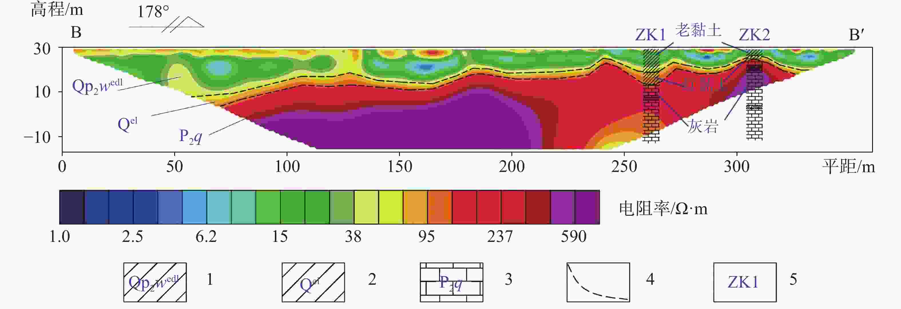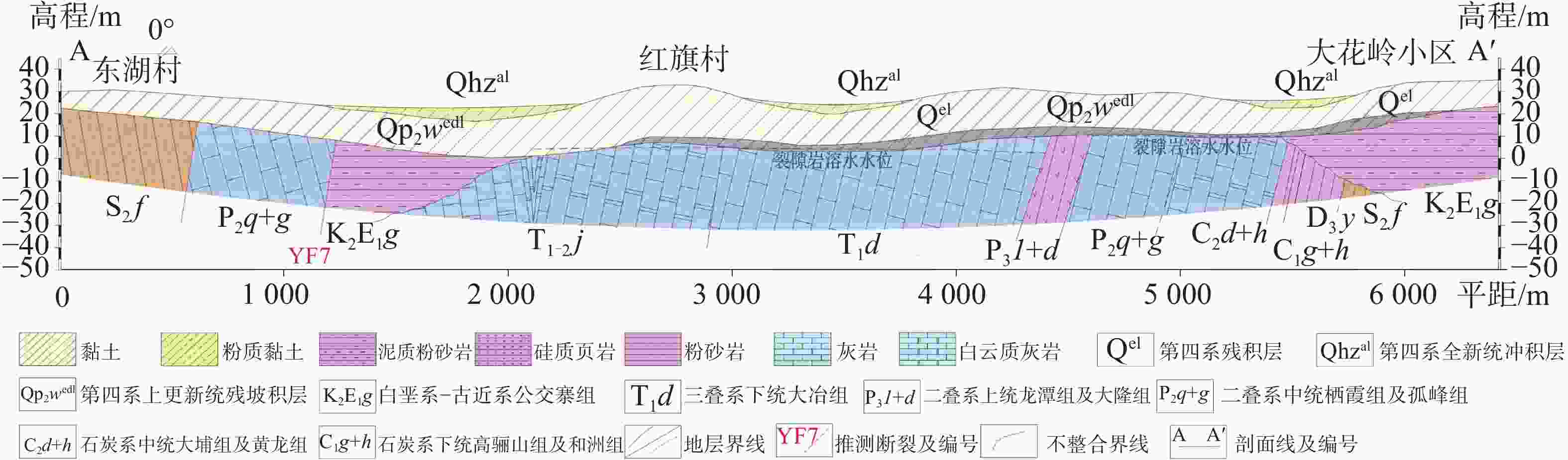 黏性土和可溶岩之间夹有厚度大于1 m的软弱土(红黏土底部);软塑−流塑红黏土先期流失形成泥流型土洞,逐渐发展破坏,地表反映为土洞型塌陷 工作区中部纸坊古堤湾—豹子山—红旗村—往南至渔牧村;多属于长江二级阶地剥蚀垄岗区 ③
