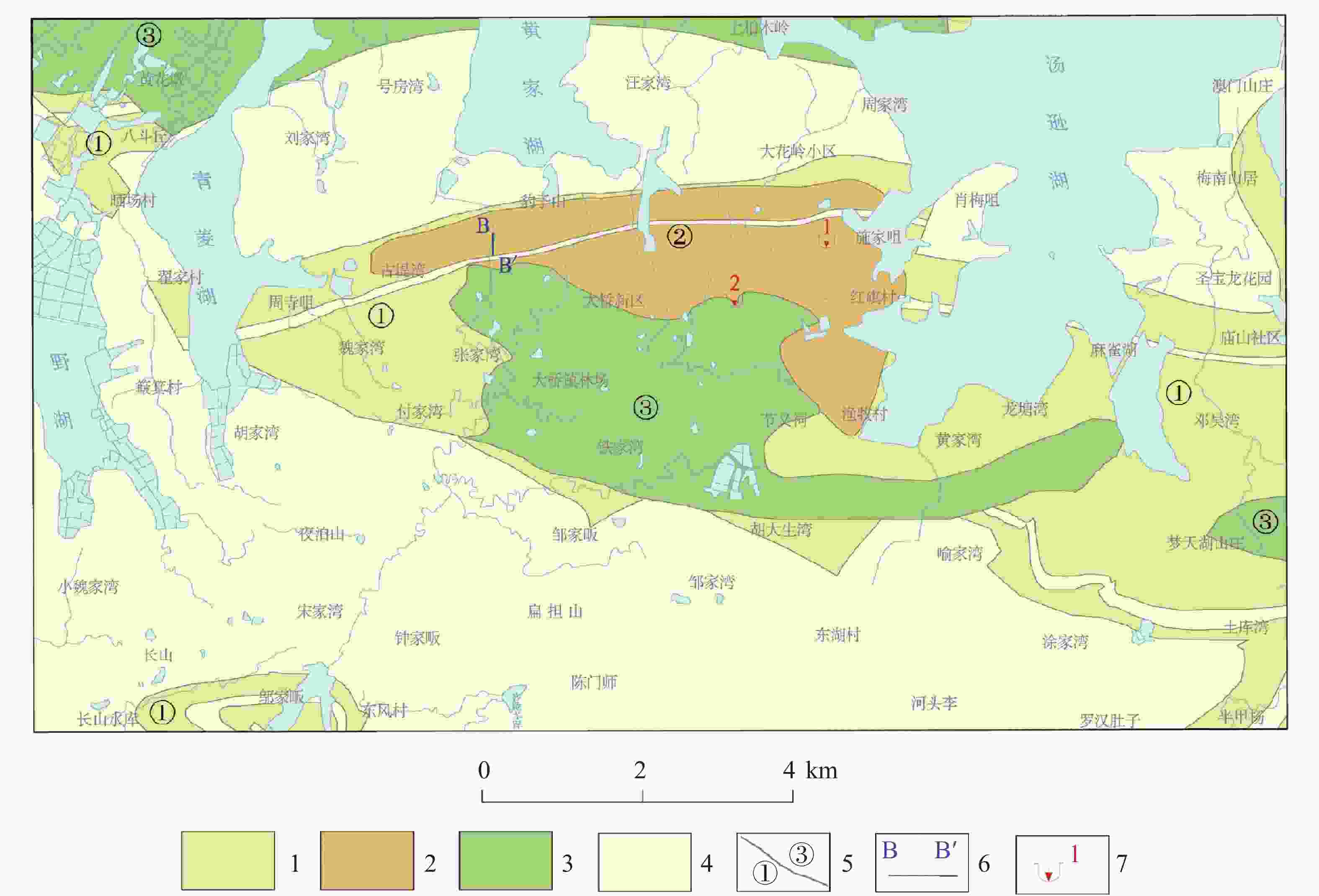 黏性土直接覆盖于可溶岩上;可发生土洞型塌陷 工作区西北角洪山区八斗丘,多属一级阶地后缘;中部纸坊翟家村—周寺咀—魏家湾—张家湾、节义祠—黄家湾—龙塘湾、东南角梦天湖山庄—土库湾—半甲杨、西南角,多属长江二级阶地剥蚀垄岗区 ②