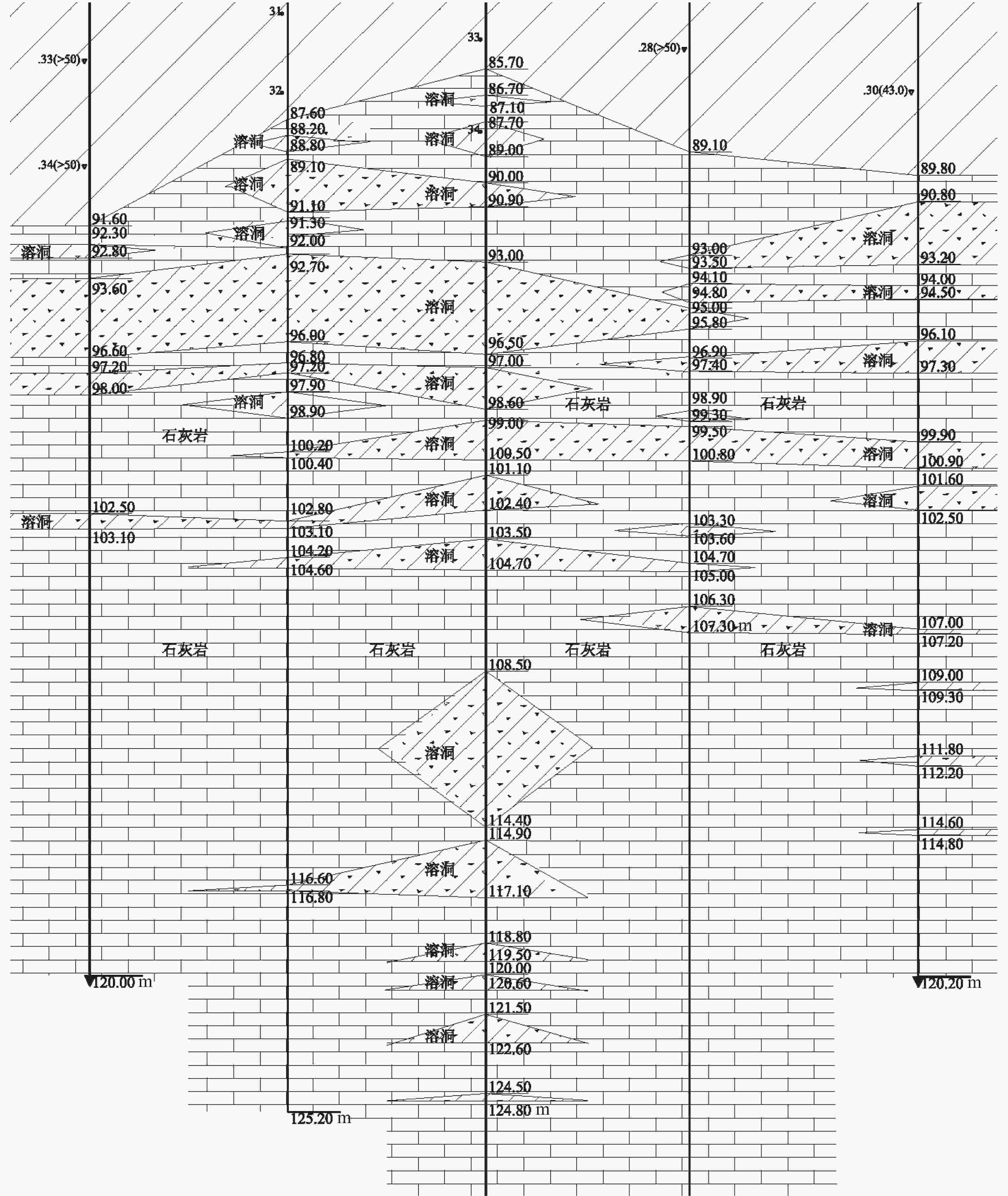速MPa·kPa−1 击 m·s−1 ② 粉质黏土 1.5~2.5 1.23/61.61 8.5 160 ③ 粉质黏土 5.5~7.0 1.32/37.54 8.2 178 ④ 粉质黏土 8.5~10.5 1.16/22.23 5.5 178 ⑤1 粉质黏土 13.5~15.5 2.10/74.27 12.6 231 ⑤2 黏土 17.5~19.0 2.51/116.7 16.7 262 ⑥t 粉土 22.0~25.0 5.31/92.18 16.1 248 ⑥ 粉质黏土 23.0~26.0 2.15/68.79 14.3 267 ⑦1 粉质黏土 28.0~30.0 1.44/30.82 7.6 233 ⑦2 粉质黏土 33.0~35.0 1.29/37.51 6.7 233 ⑧ 粉质黏土 38.0~40.0 2.32/78.25 15.2 320 ⑧t 粉土 41.5~44.0 8.51/111.1 21.5 310 ⑨ 粉土 50.0~52.0 7.90/167.7 28.1 336 ⑩ 黏土 55.0~57.0 3.71/140.3 22.2 341 ⑾1-1 粉土 60.0~62.0 10.3/202.9 30.9 396 ⑾1-2 粉质黏土 60.0~65.0 4.54/111.7 20.4 425 ⑾2 粉质黏土 69.0~71.0 3.24/81.95 18.0 589 ⑿ 黏土 75.0~77.0 5.81/151.8 36.7 612 表 3 三塔楼空洞分布