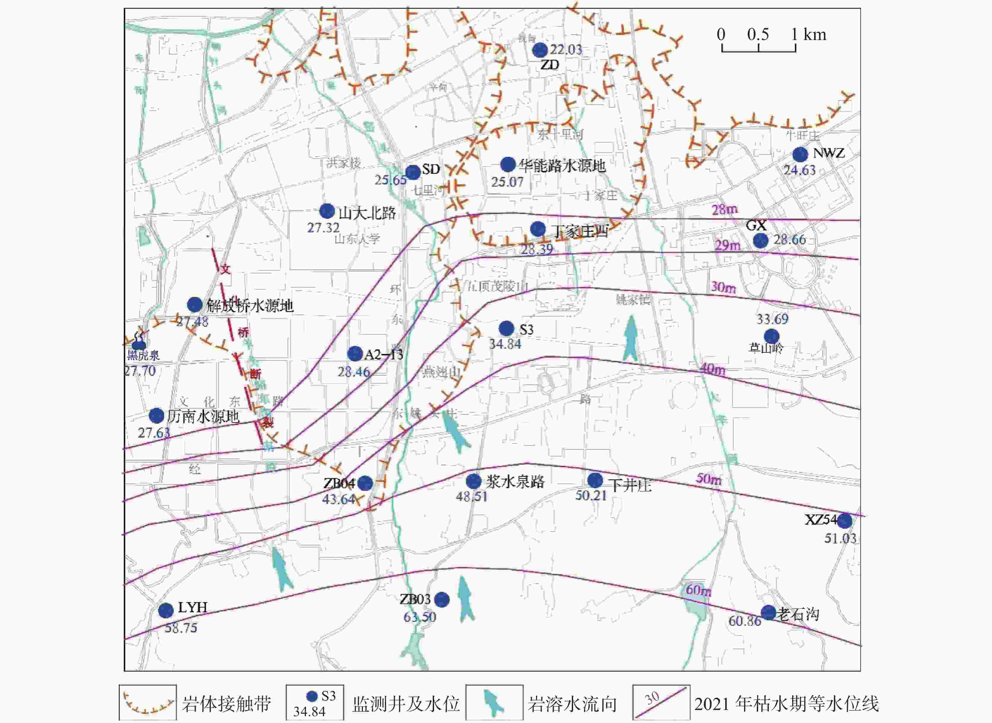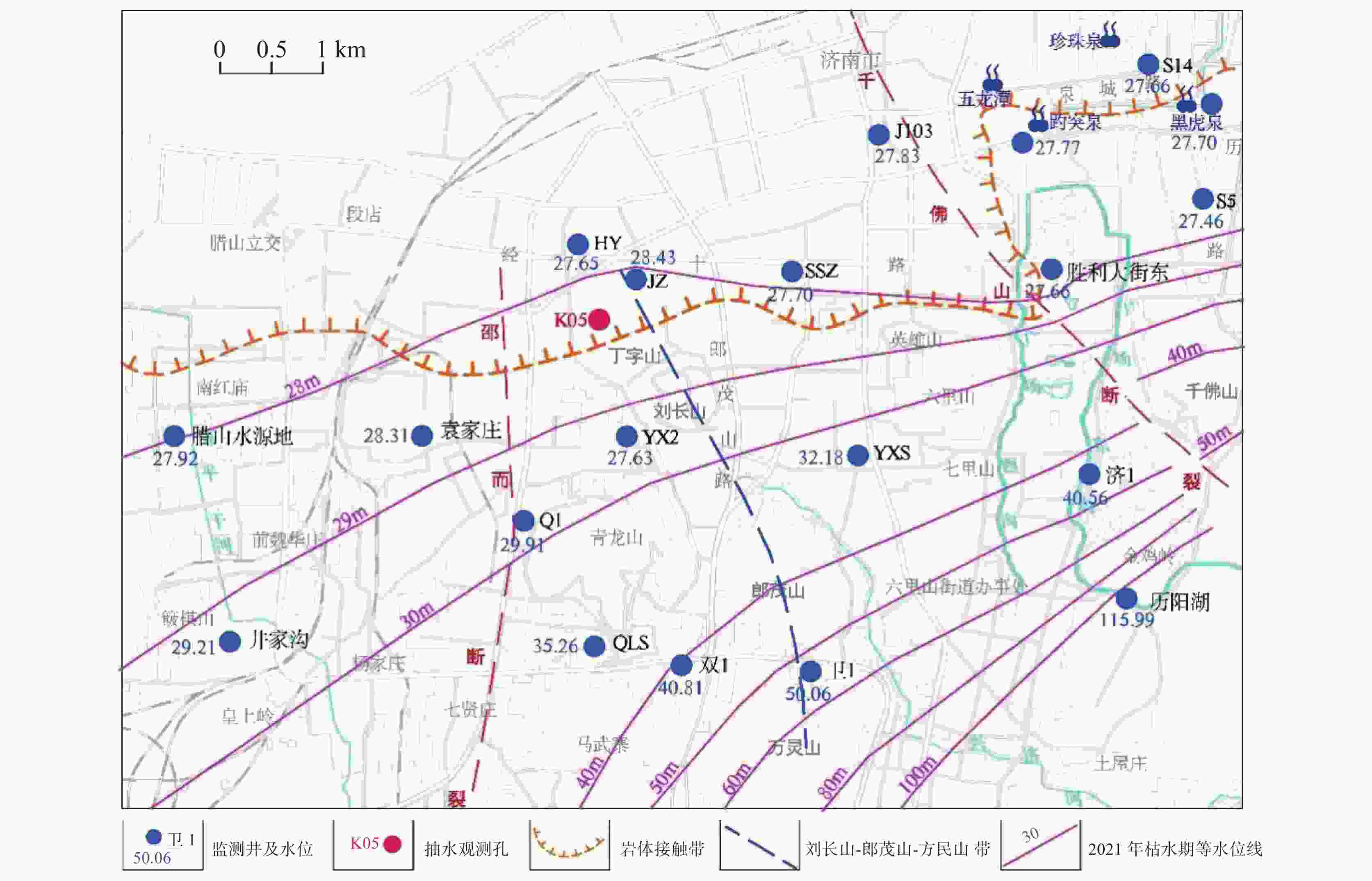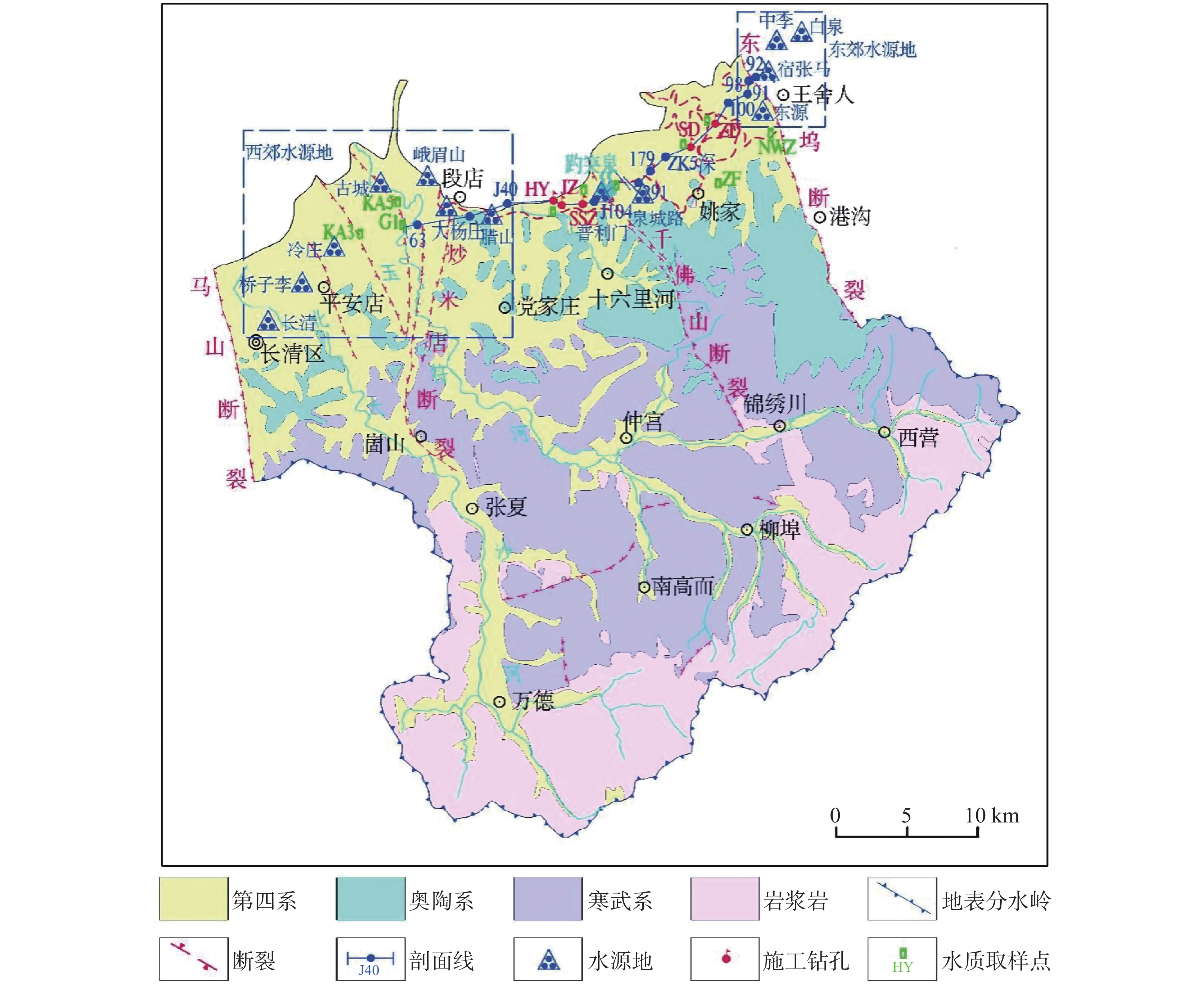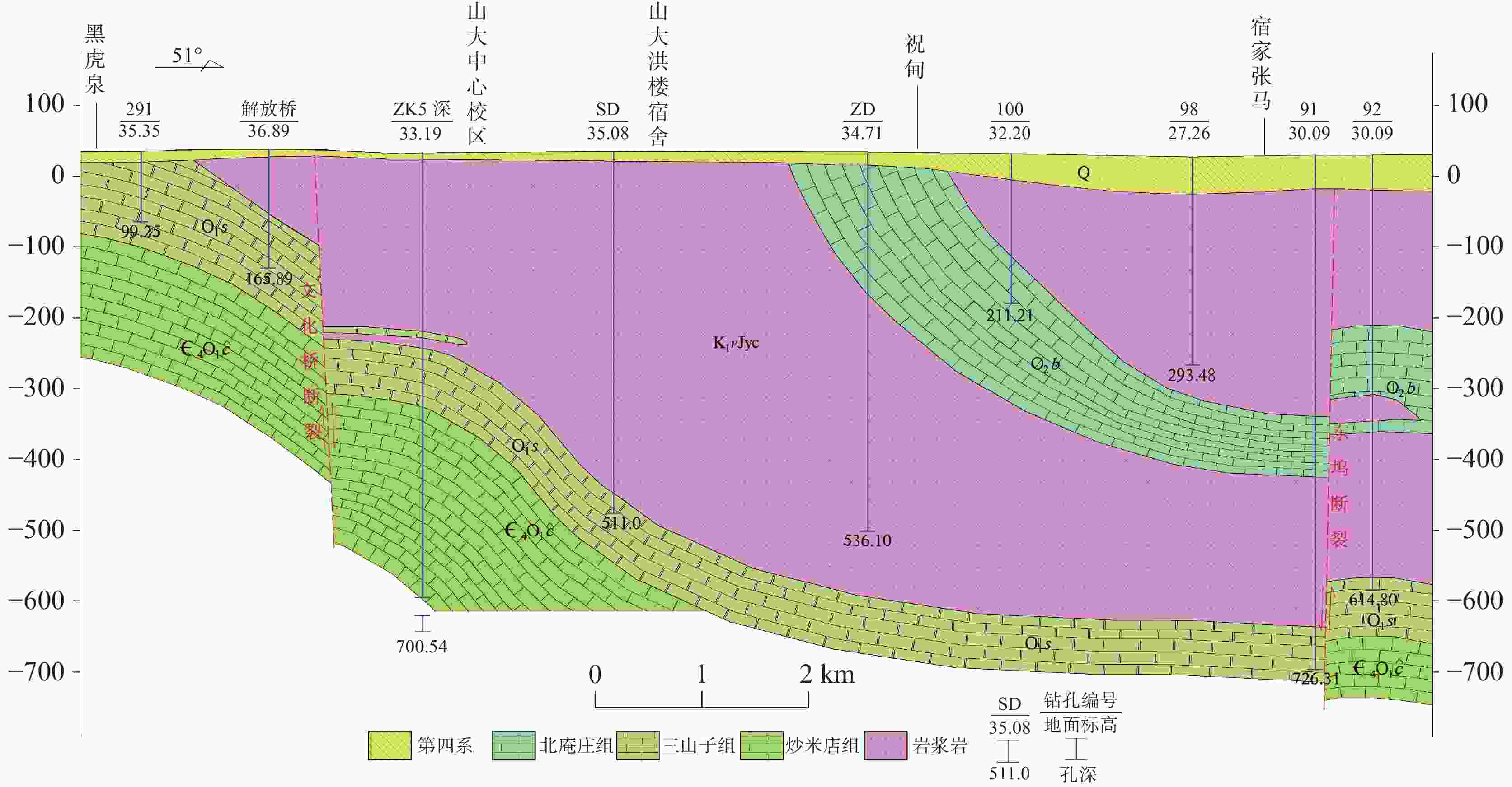 摘要: 为查明济南市区泉水与西郊、东郊岩溶水的水力联系,从地层结构、水动力场角度,结合抽水试验、示踪试验和水化学分析等方法研究泉水与岩溶水之间的关系。结果表明,济南市区和西郊之间的刘长山—郎茂山—万灵山一带存在地下水径流通道。刘长山北侧槐苑广场—九中—十四中一带,在埋深350 m处揭露连续的岩溶含水地层,并存在垂向径流通道,市区泉水和西郊岩溶水通过刘长山北侧侵入岩体接触带以下的三山子组含水层连通。市区与东郊之间的燕翅山—七里河一带受舌状侵入岩体的影响,两侧地下水流场存在差异,但山东大学洪楼校区以北埋深485 m处揭露连续的岩溶含水地层,市区泉水和东郊岩溶水可通过侵入岩体接触带以下的三山子组含水层连通。水化学分析结果表明市区泉水与西郊、东郊岩溶水水化学类型一致,具有相同的演化环境。Abstract: