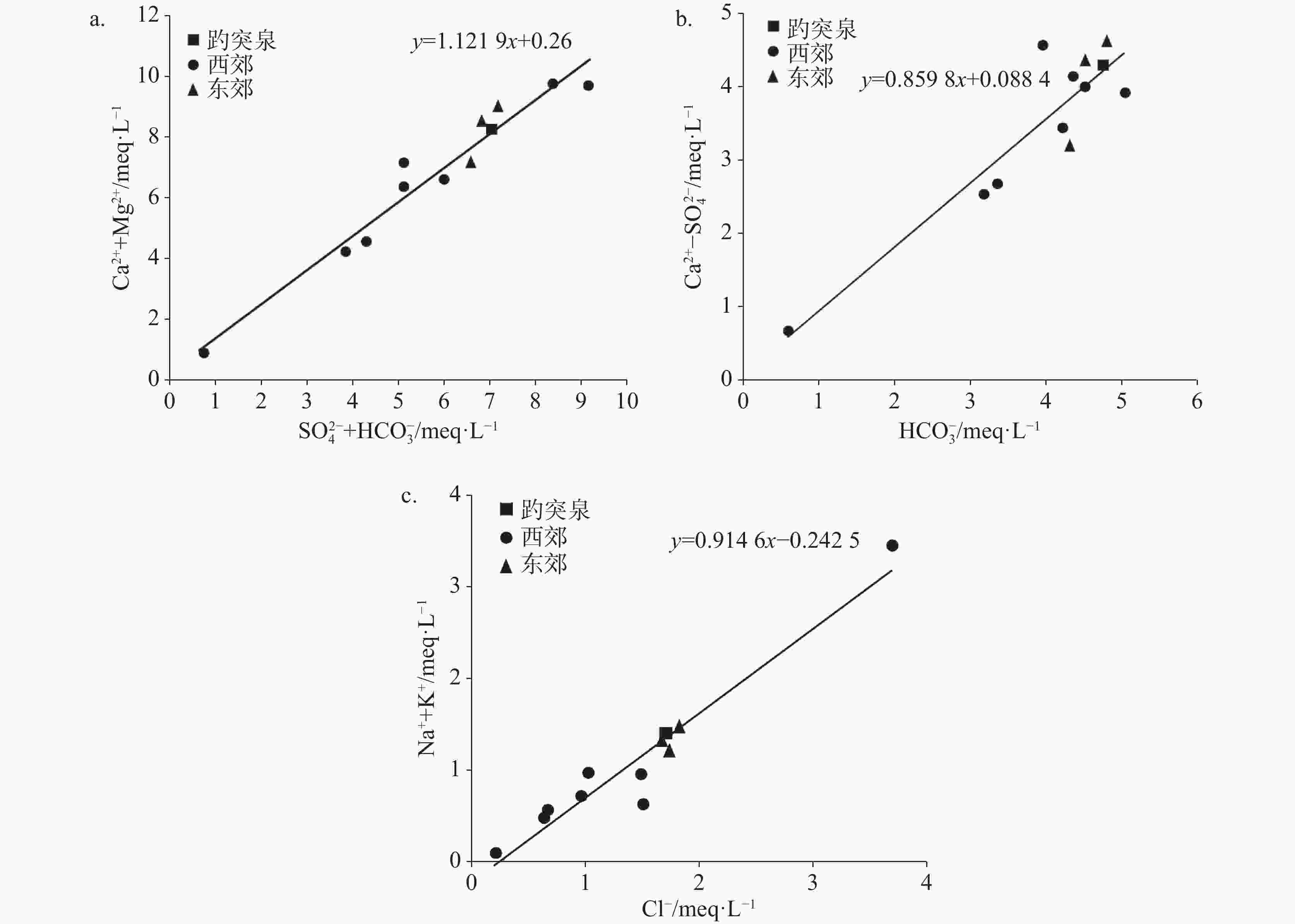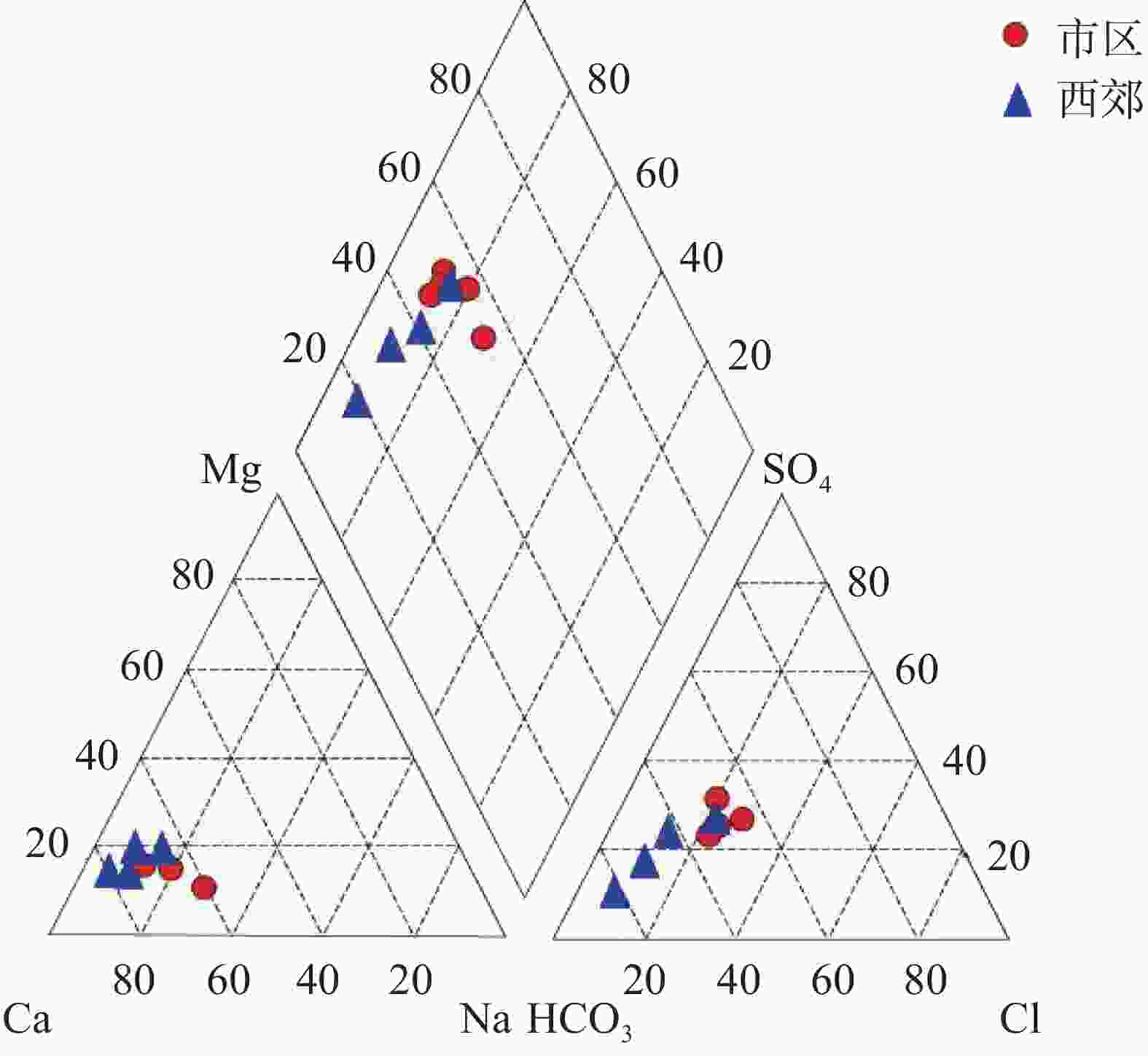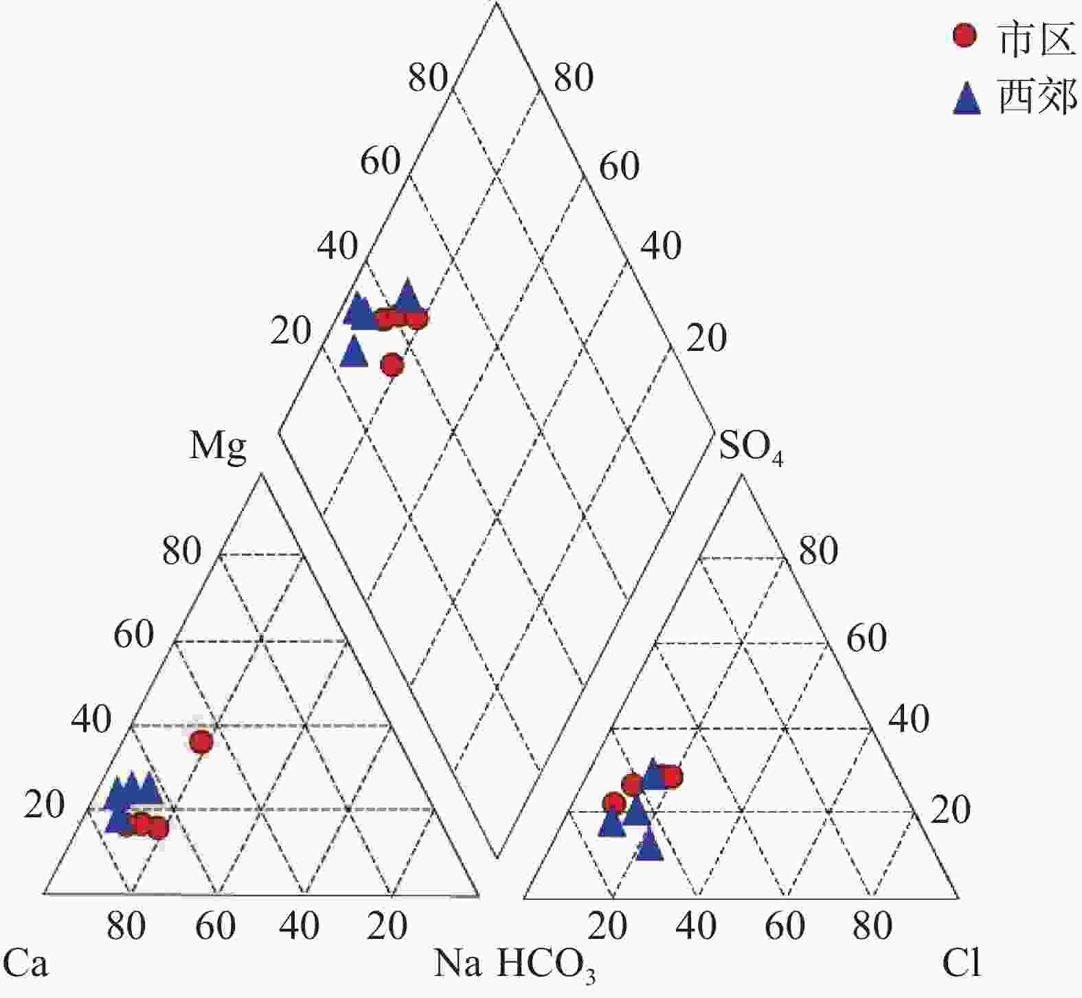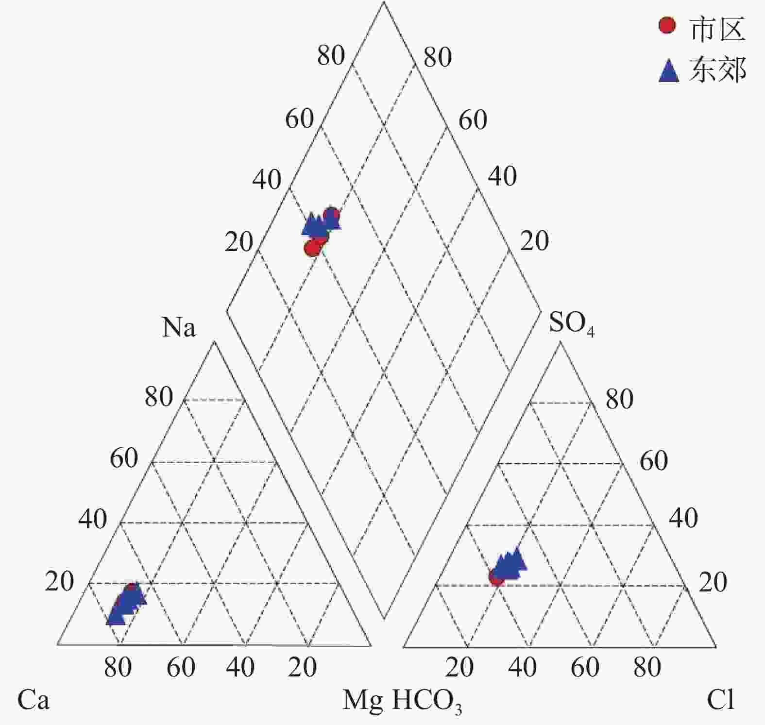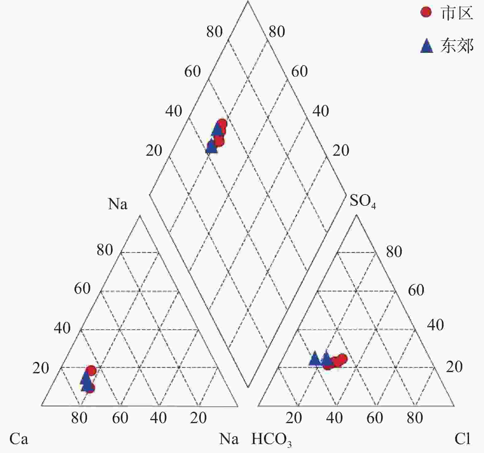 位置 编号 pH Na+ Ca2+ Mg2+ K+ Cl− ${\rm{SO}}_4^{2-}$ ${\rm{HCO}}_3^{-}$ ${\rm{NO}}_3^{-}$ 市区 趵突泉 7.60 28.70 131.00 21.20 1.22 59.80 109.00 292.00 46.10 市区—