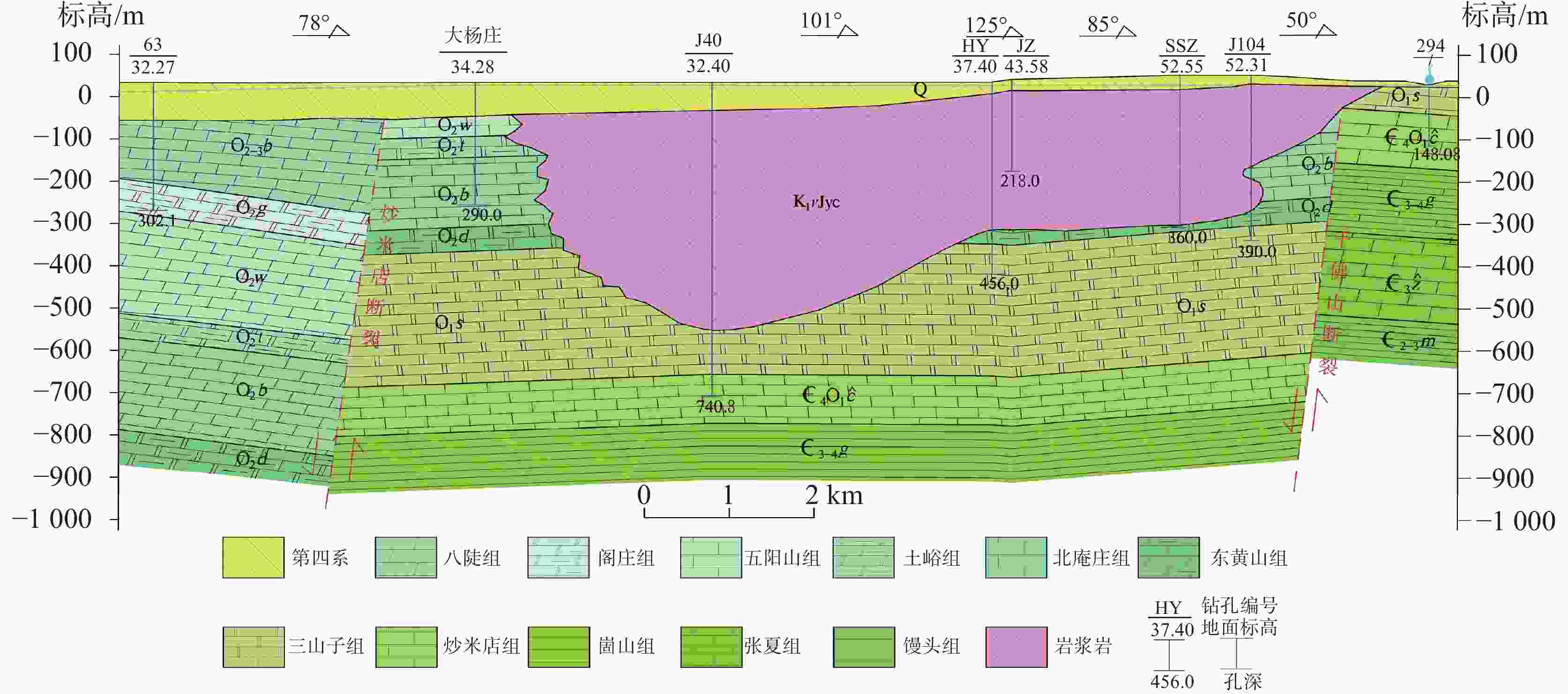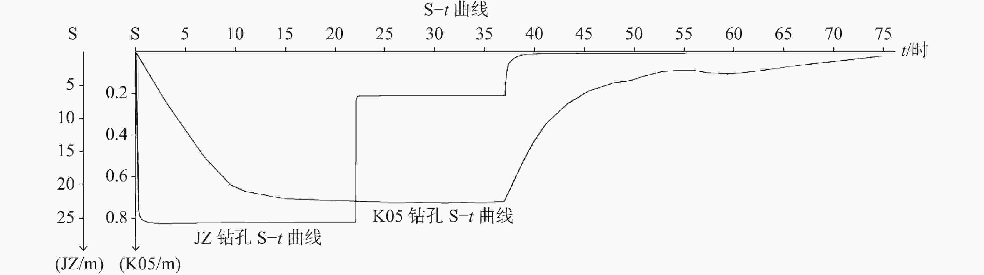 钻孔 第四系/m 辉长岩/m 东黄山组/m 三山子组/m 孔深/m 含水层时代 JZ 0~27.0 27.0~218.0 — — 218.0 K1vJyc SSZ 0~36.0 36.0~357.0 357.0~360.0 — 360.0 O2d HY 0~29.4 29.4~350.0 350.0~397.5 397.5~456.0 456.0 Є4O1s K05 0~24.0 24.0~251.0 — — 251.0 K1vJyc 表 2 西部钻孔抽水量及降深结果一览表