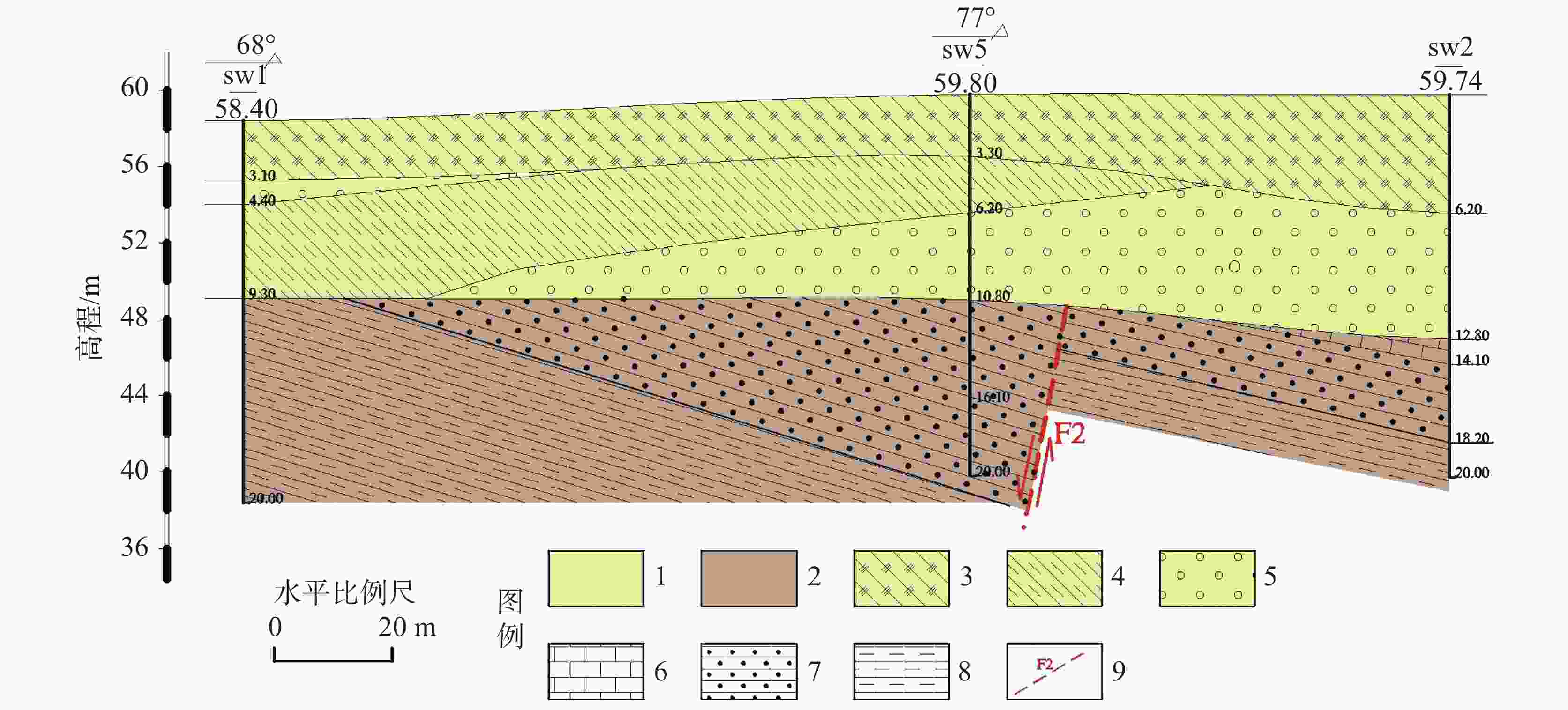 1-第四系 2-石炭二叠系 3-填土 4-粉质黏土 5-卵砾石 6-灰岩 7-砂岩 8-泥岩 9-断裂