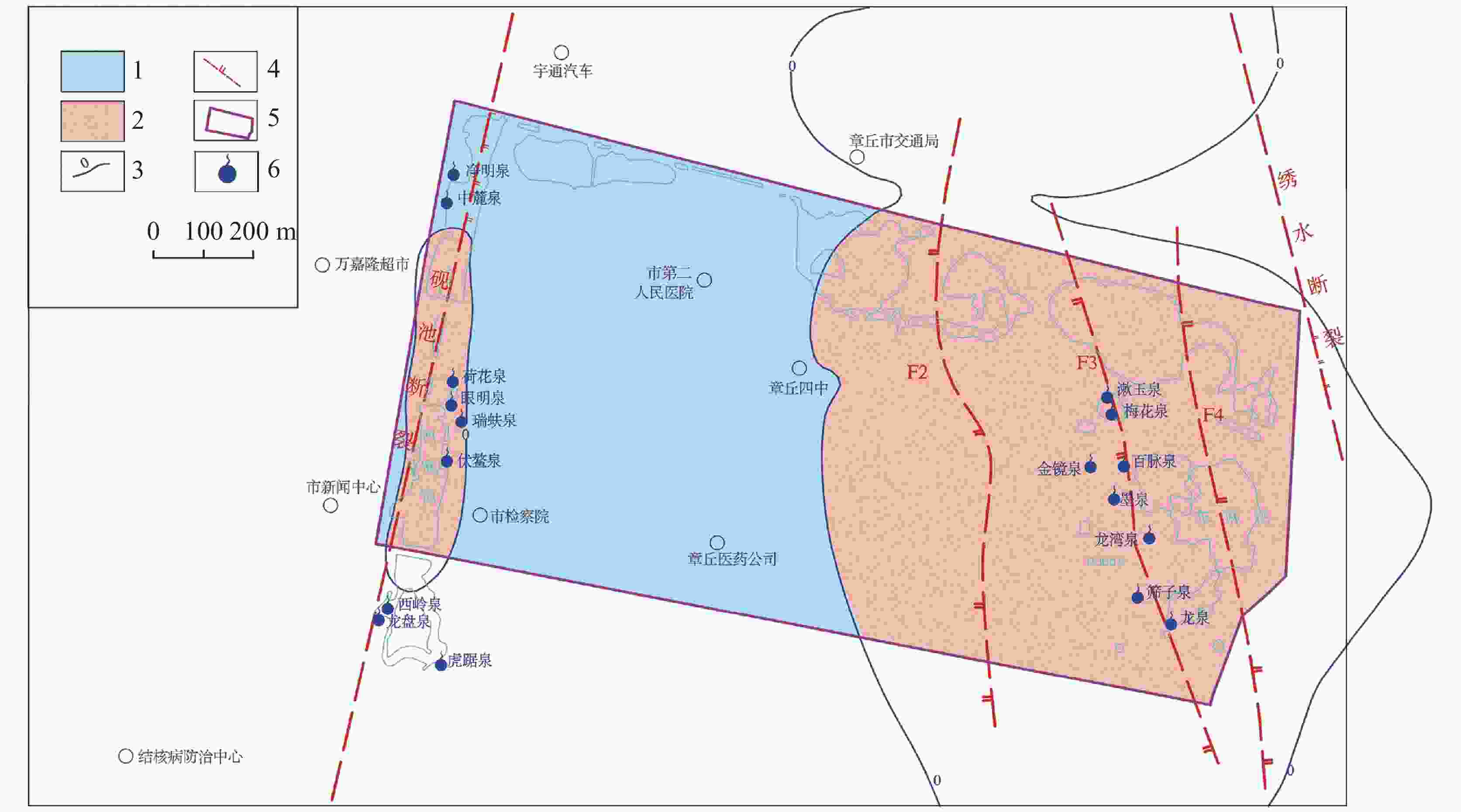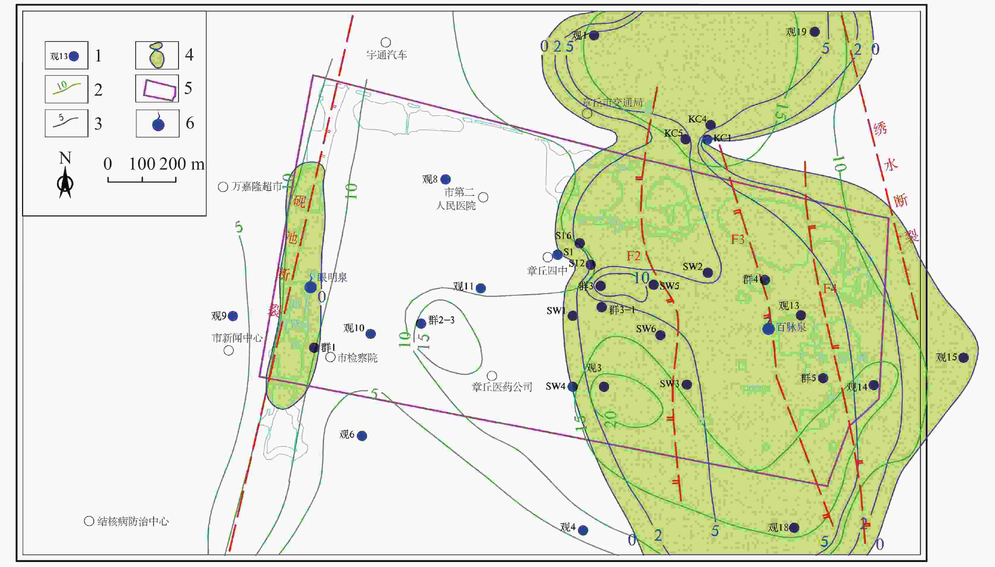 1-控制点 2-第四系厚度等值线 3-卵砾石层厚度等值线 4-卵砾石层分布区 5-泉群出露区 6-泉水