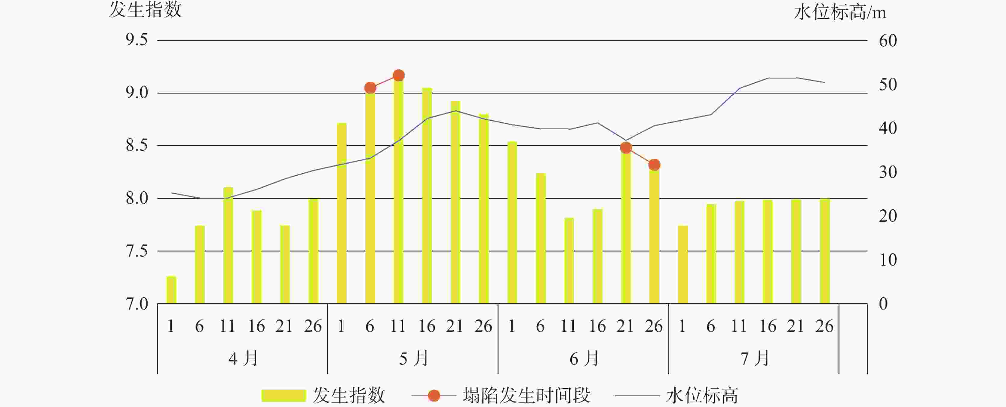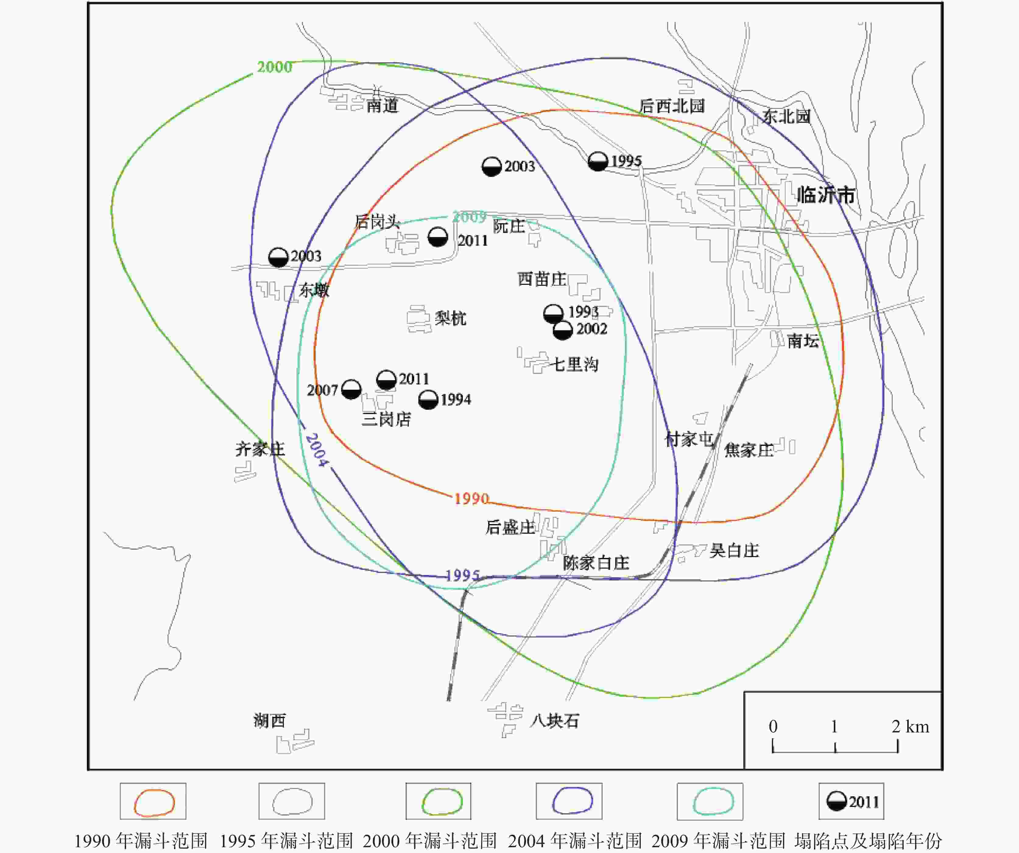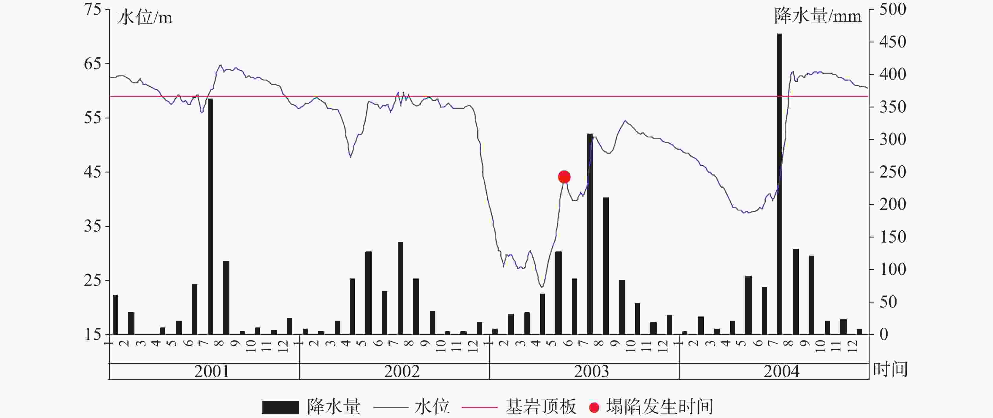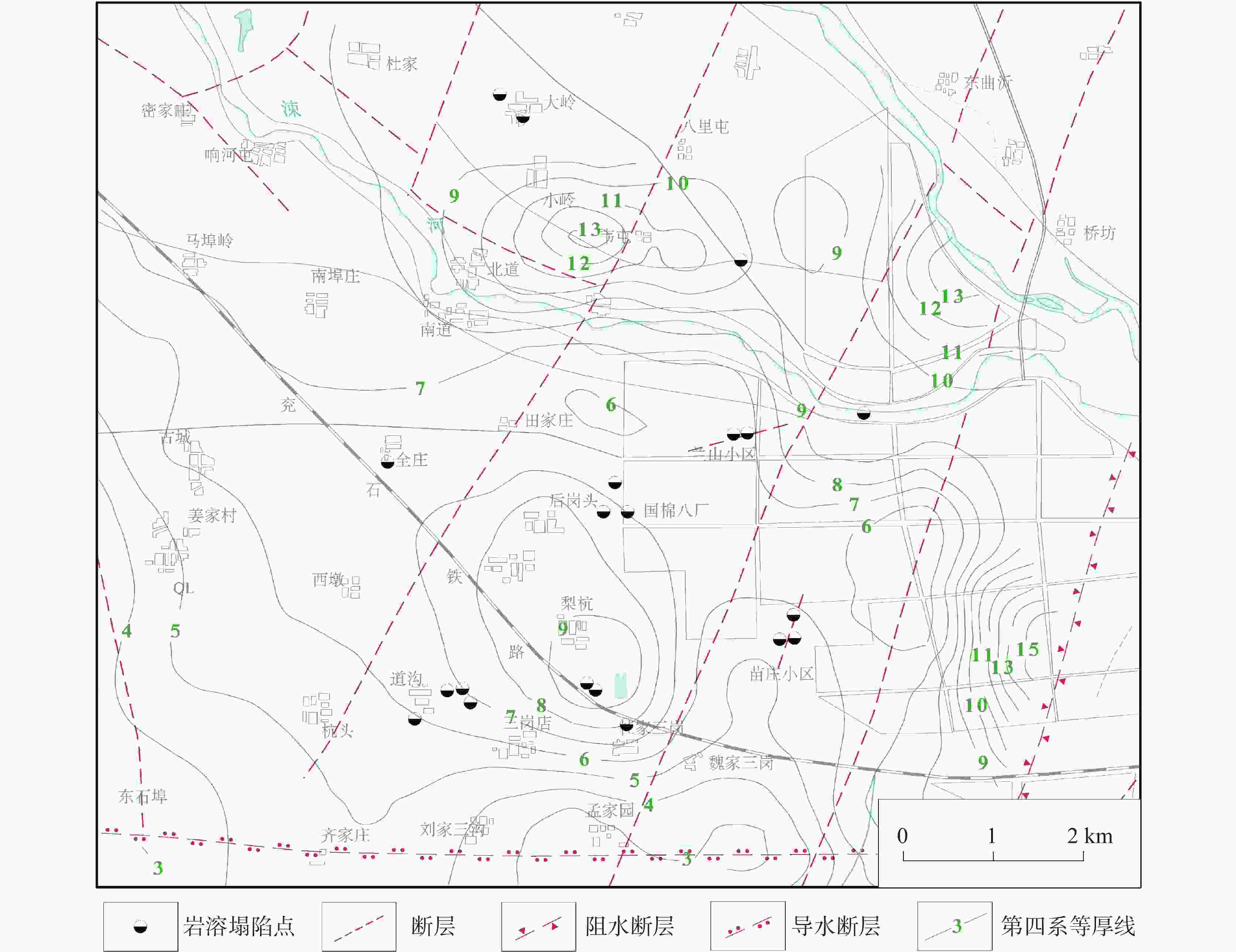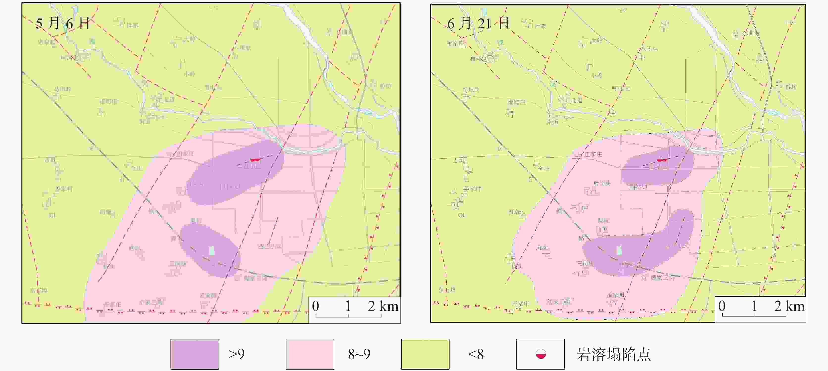 距离/km 塌陷数量/个 所占比例/% 地表水体 <1 16 76.2 >1 5 23.8 断裂带 <1 15 71.4 >1 6 28.6 表 3 岩溶塌陷分布规律(诱发因素)