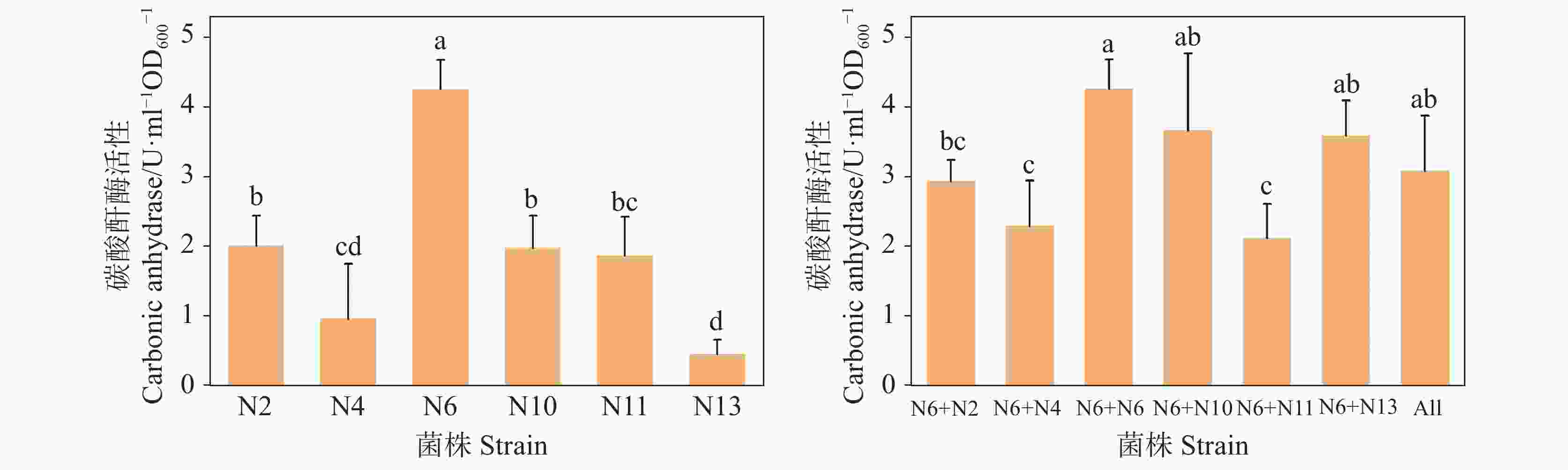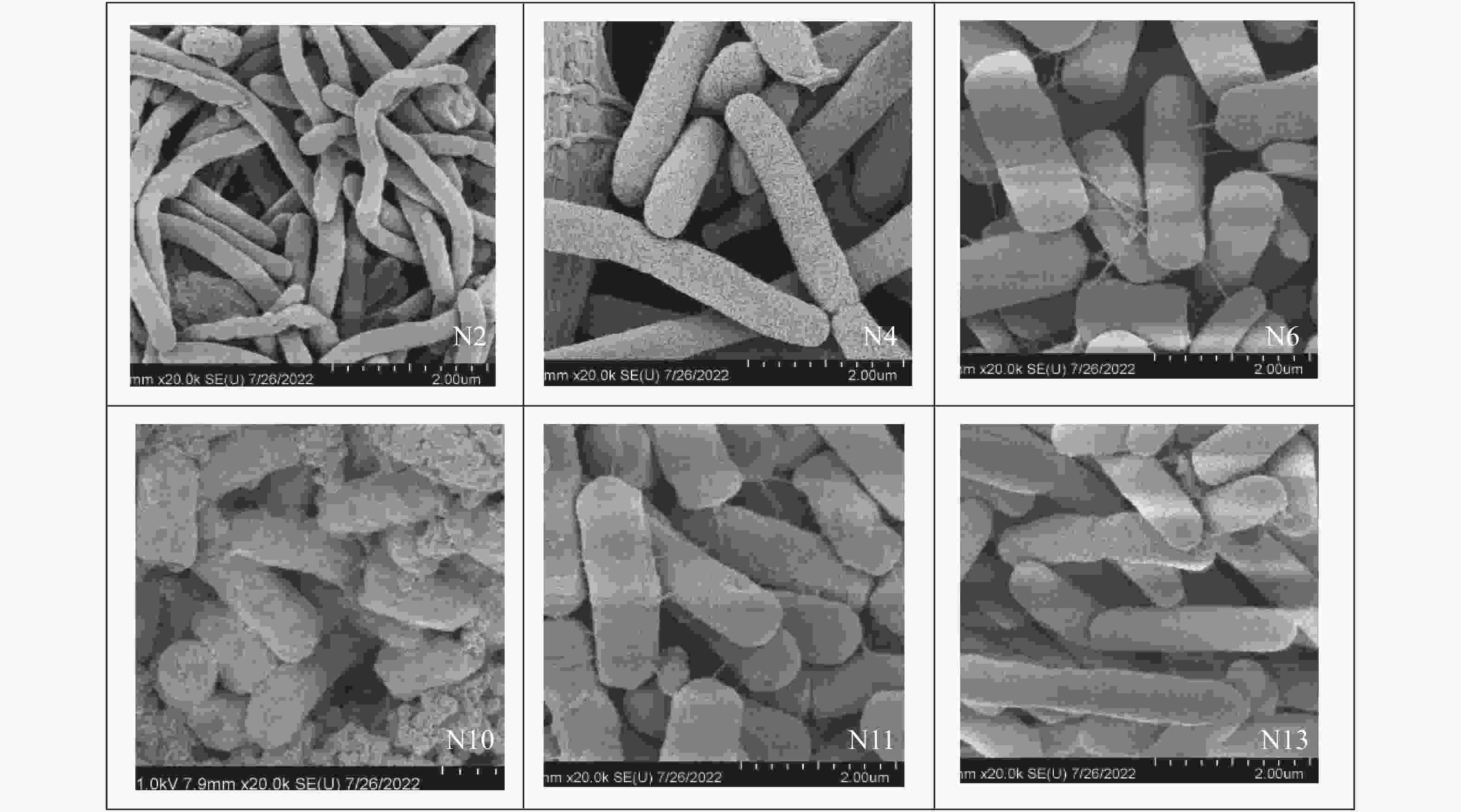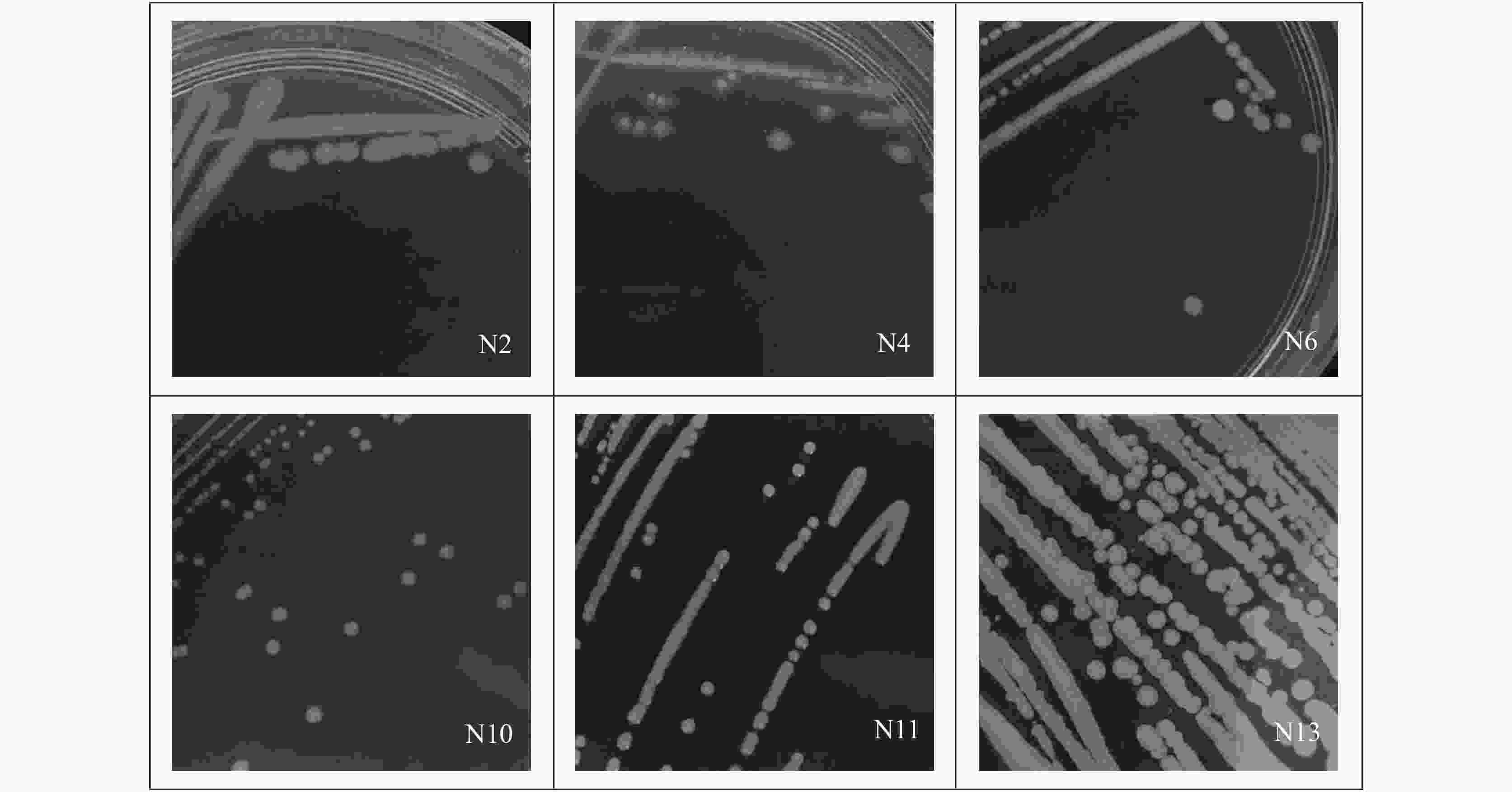 1%溴麝香草酚蓝酒精溶液10 mL、蒸馏水1 000 mL硝酸盐还原培养基 硝酸钾0.2 g、蛋白胨5 g、蒸馏水1 000 mL 淀粉水解培养基 牛肉膏0.5 g、蛋白胨1 g、NaCl 0.5 g、可溶性淀粉0.2 g、琼脂2 g、蒸馏水100 mL 表 2 不同菌种在LB固体培养基上的形态比较 Table 2. Comparison of different bacteria species on the LB solid culture medium 样品编号 菌落形态特征 菌落颜色 N2 表面光滑,边缘整齐 黄色 N4 表面光滑,中央凸起周围扁平,边缘不规则 白色 N6 表面光滑,边缘整齐 黄色 N10 表面光滑,边缘整齐 白色 N11 表面光滑饱满,边缘整齐 白色 N13 表面光滑,蜡状,边缘不规则 白色 表 3 菌株的生理生化特征 Table 3. Physiological and biochemical characteristics of strains 样品编号 N2 N4 N6 N10 N11 N13 糖类分解 + + + − + + V-P + + + + + + 甲基红 − − + − − + 硝酸盐还原 + + − + − − 淀粉水解 − − + − − + 柠檬酸盐利用 − + − − − − 接触酶 + + + − + −